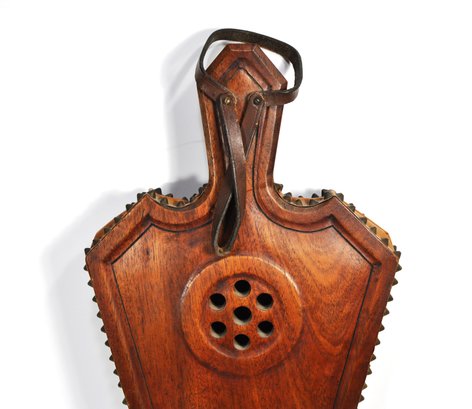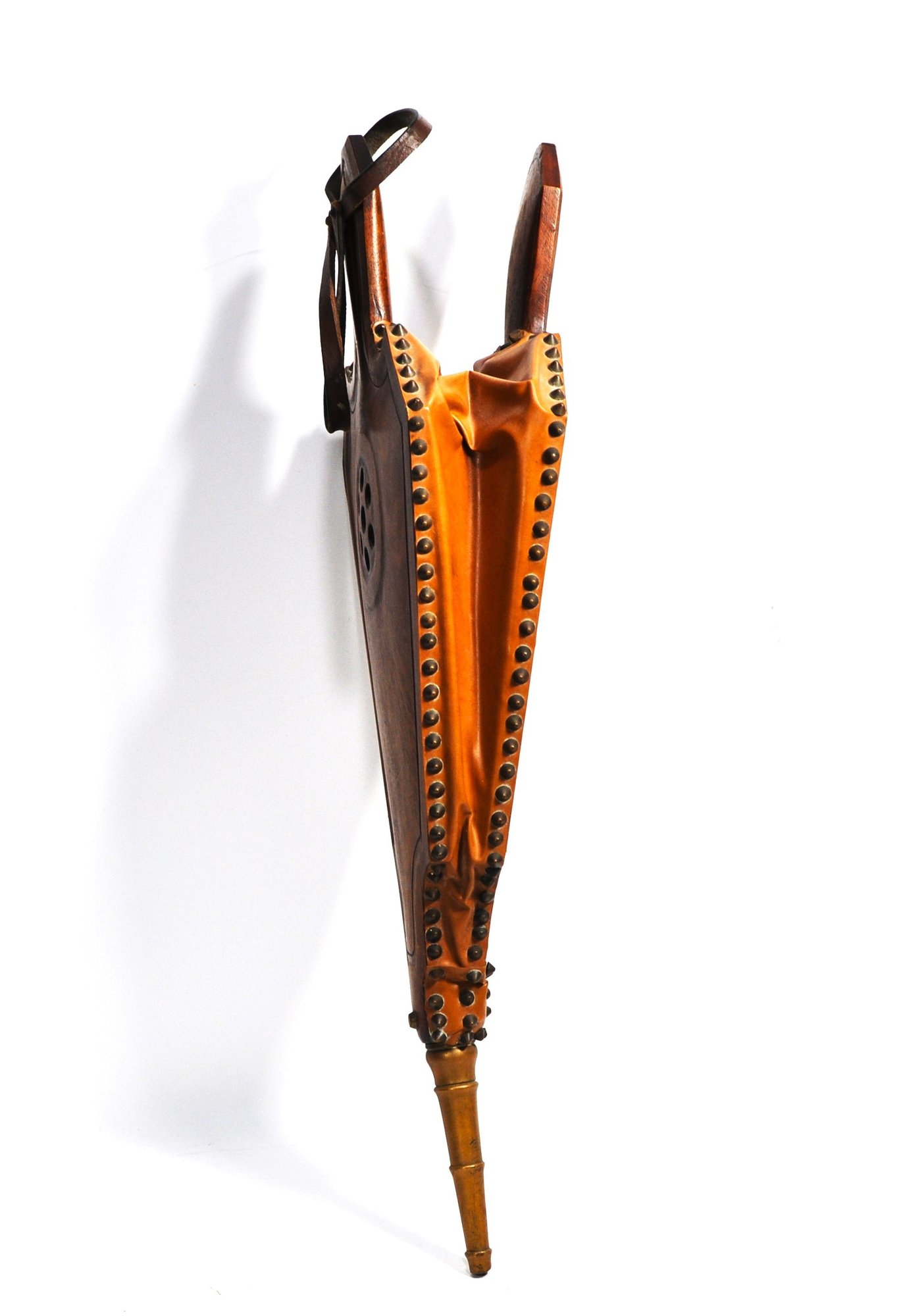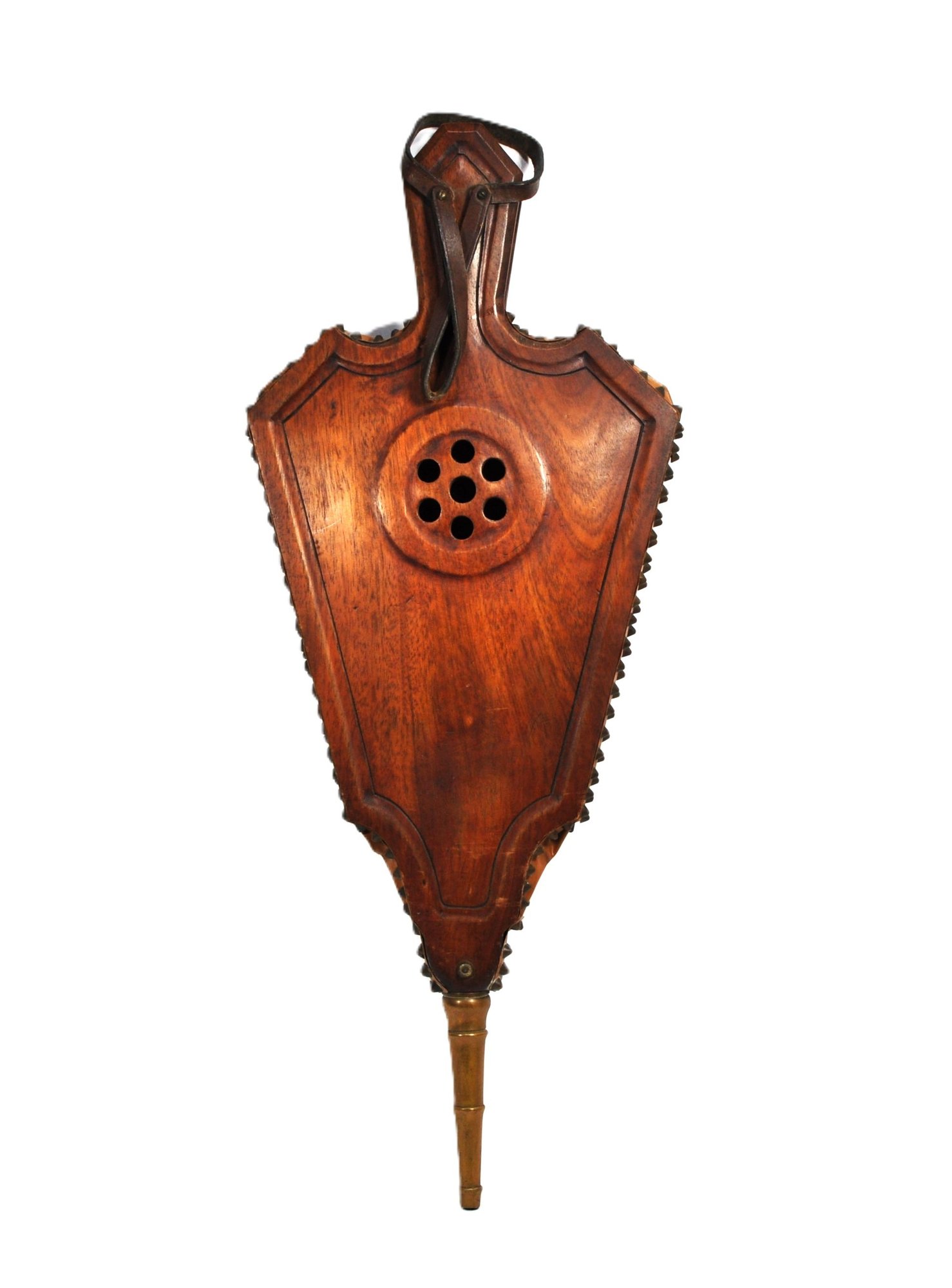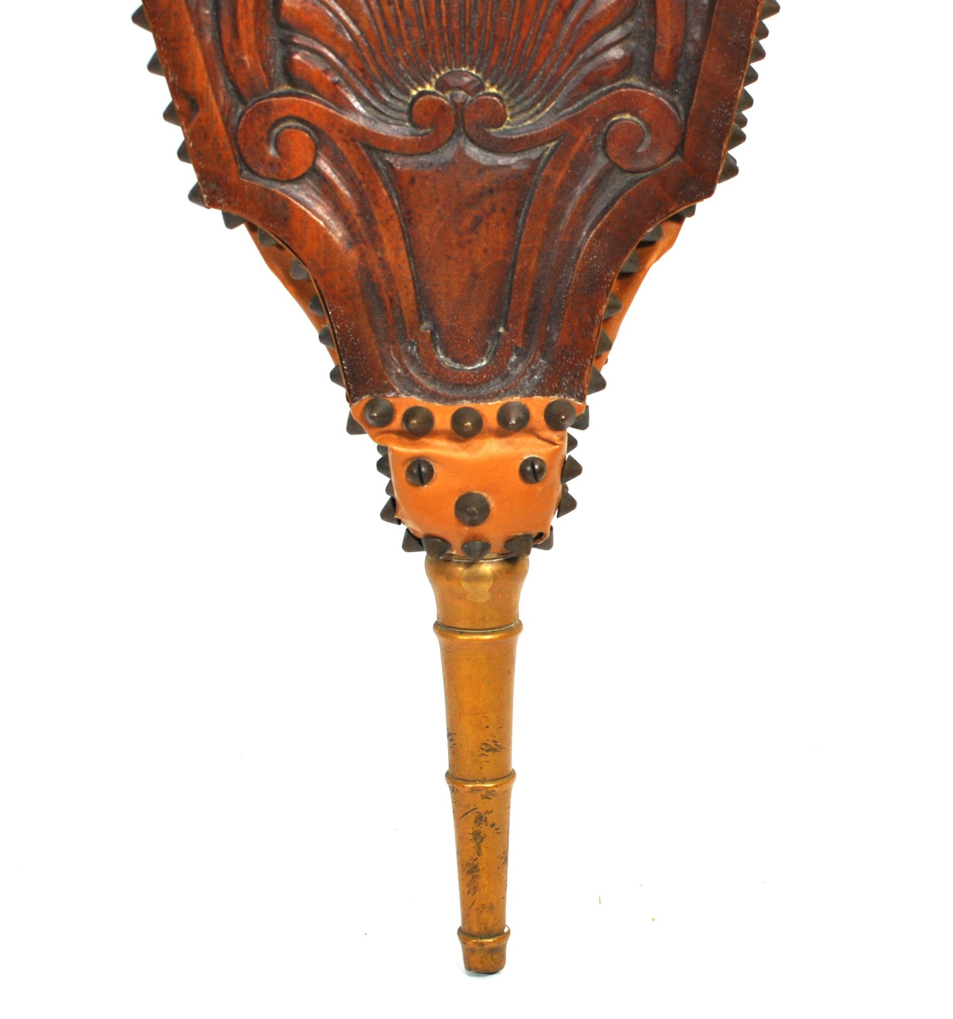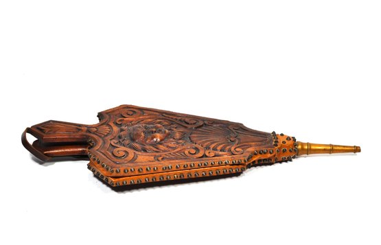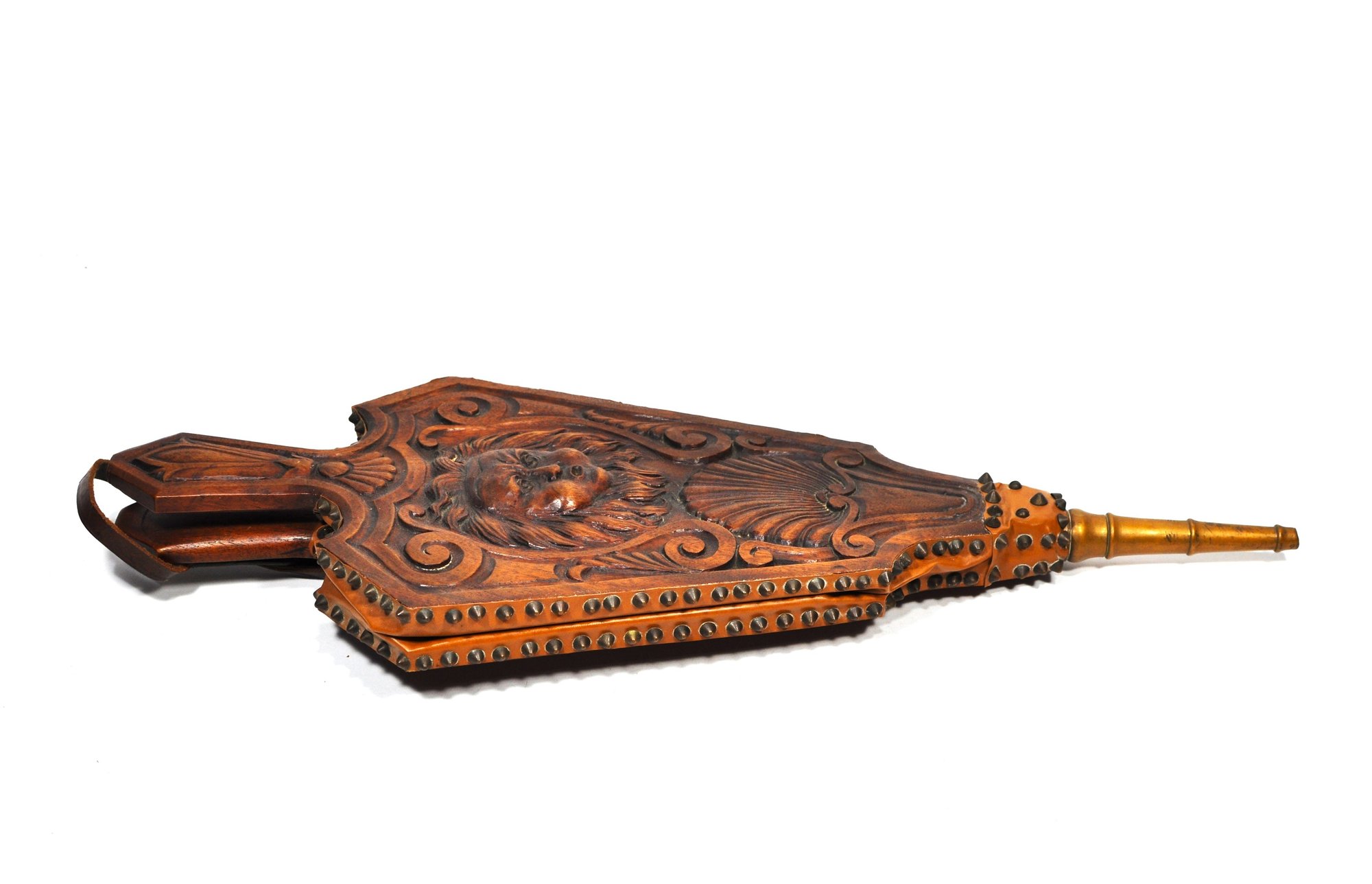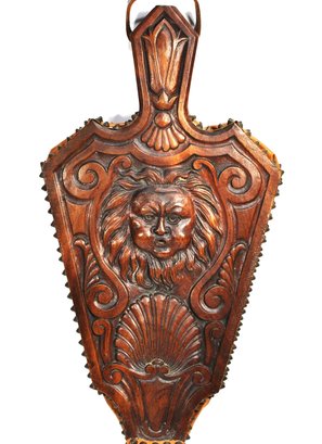 Finely crafted wooden fireplace bellows with a deeply carved lion’s mask, scrollwork, and shell motifs. Features brass tacking, leather sides, and turned brass nozzle. Functional and decorative, ideal for use or display. Likely 20th century in 18th–19th century European style.