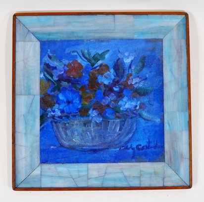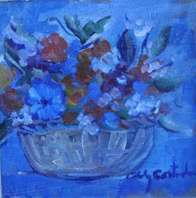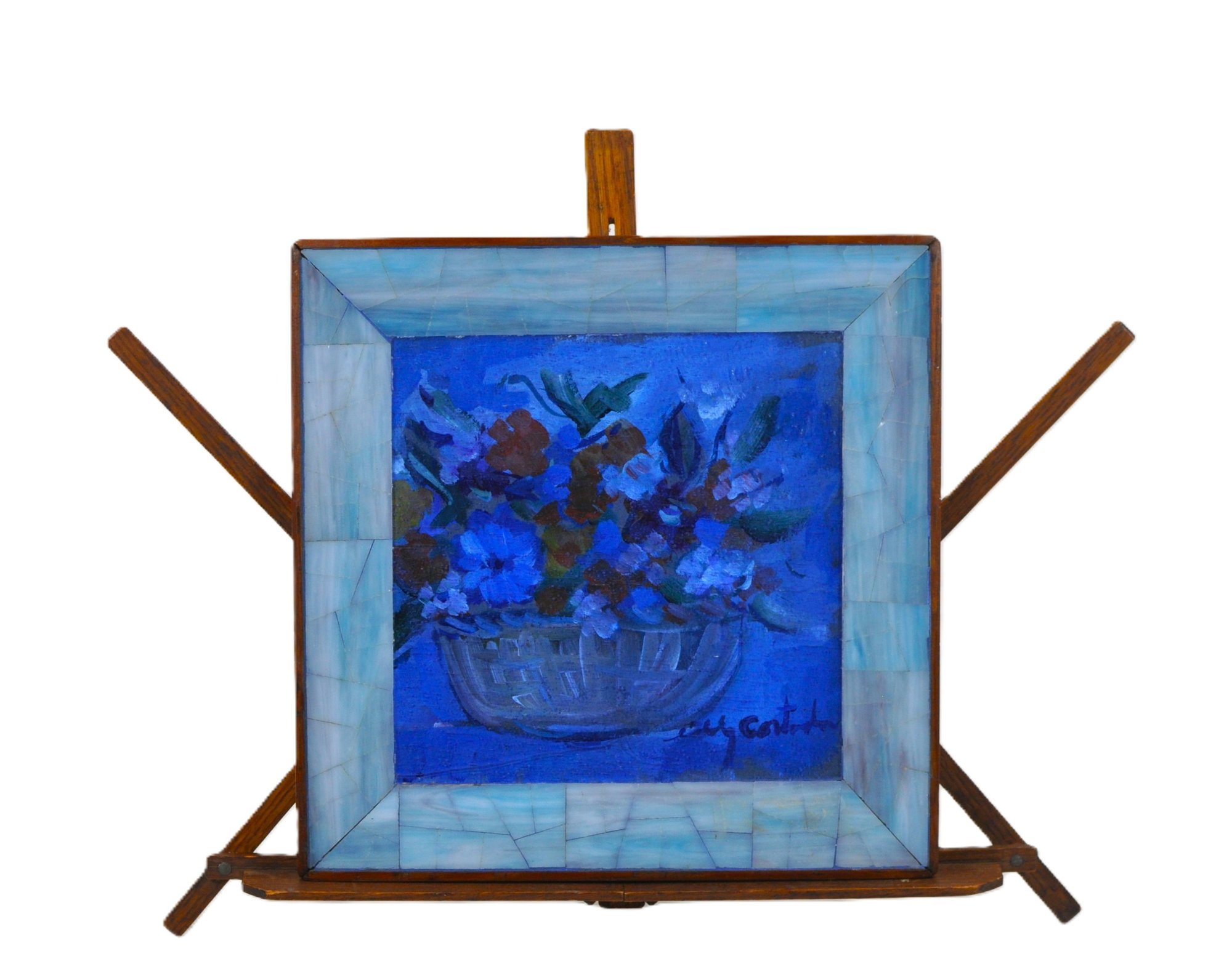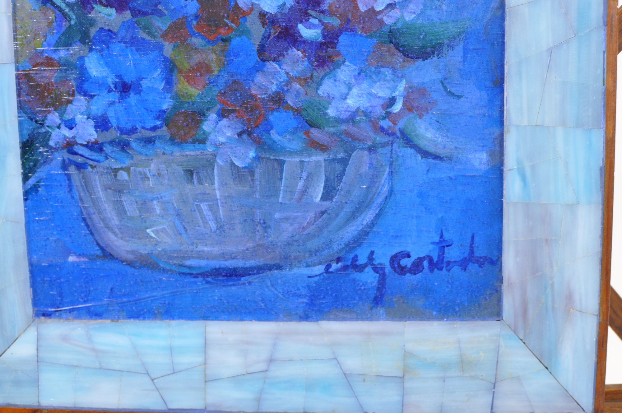 Vibrant reverse glass painting featuring a basket of blue flowers, signed Cely Castilho? lower right.
