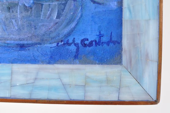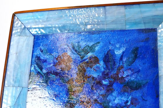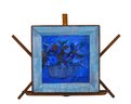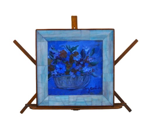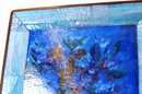 Presented in a unique frame set with angled aqua-blue stained glass tiles bordered by wood.