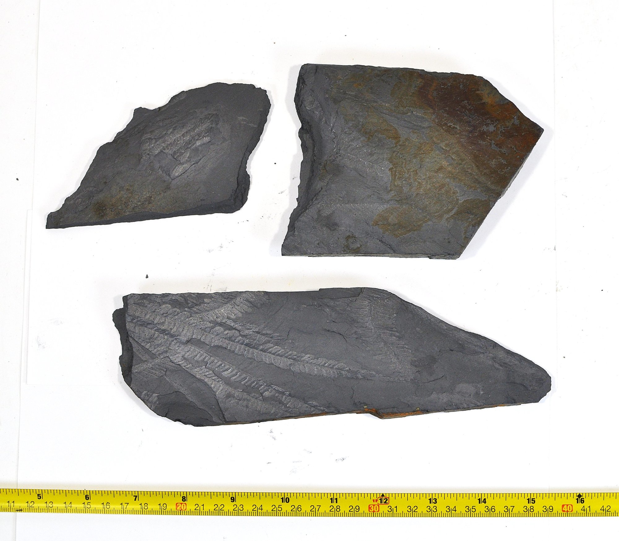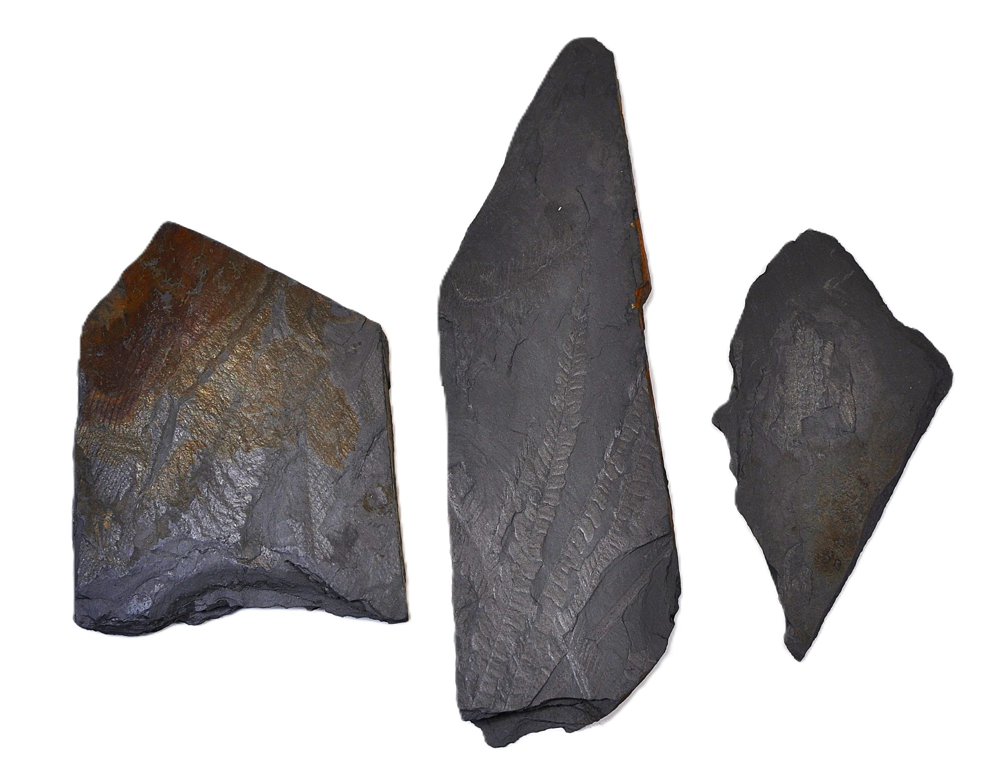 Group of natural fossil specimens featuring well-defined fern frond imprints preserved in dark shale. These plant fossils are characteristic of Carboniferous-period flora, formed in ancient coal forest environments. The impressions display clear leaf segmentation and branching typical of prehistoric ferns.