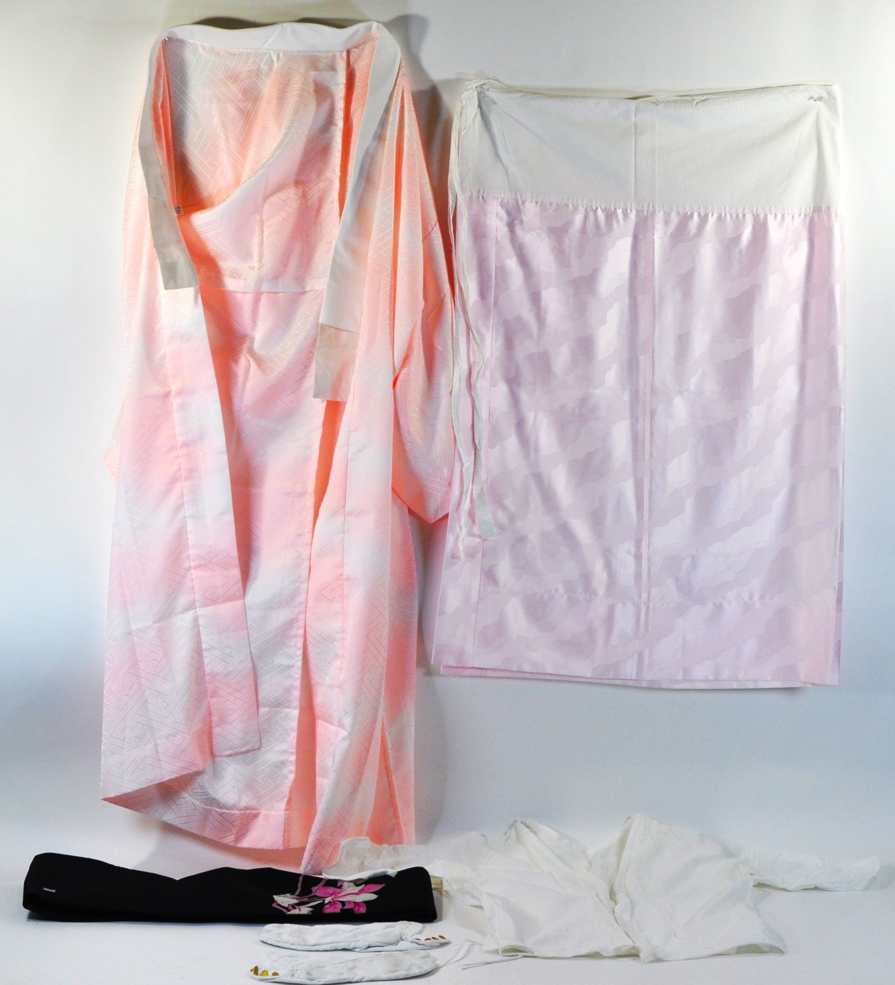 Lovely complete Japanese kimono dressing set including a soft pink formal kimono with jacquard pattern, matching inner skirt, black obi with bold pink floral design, white cotton undergarment layers, and a pair of white tabi socks (marked size 24.0).