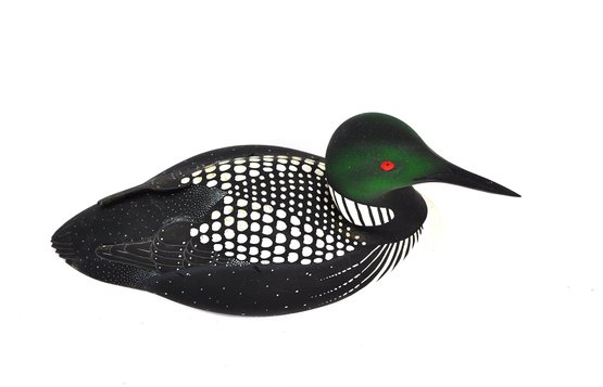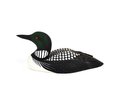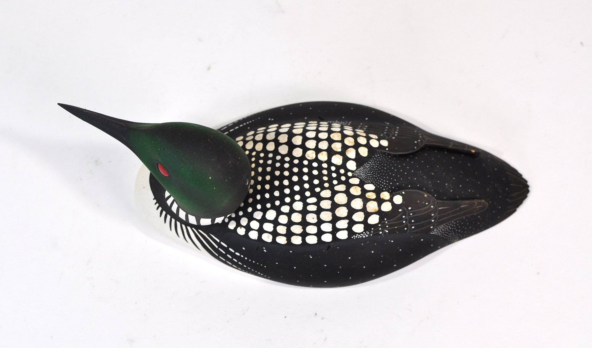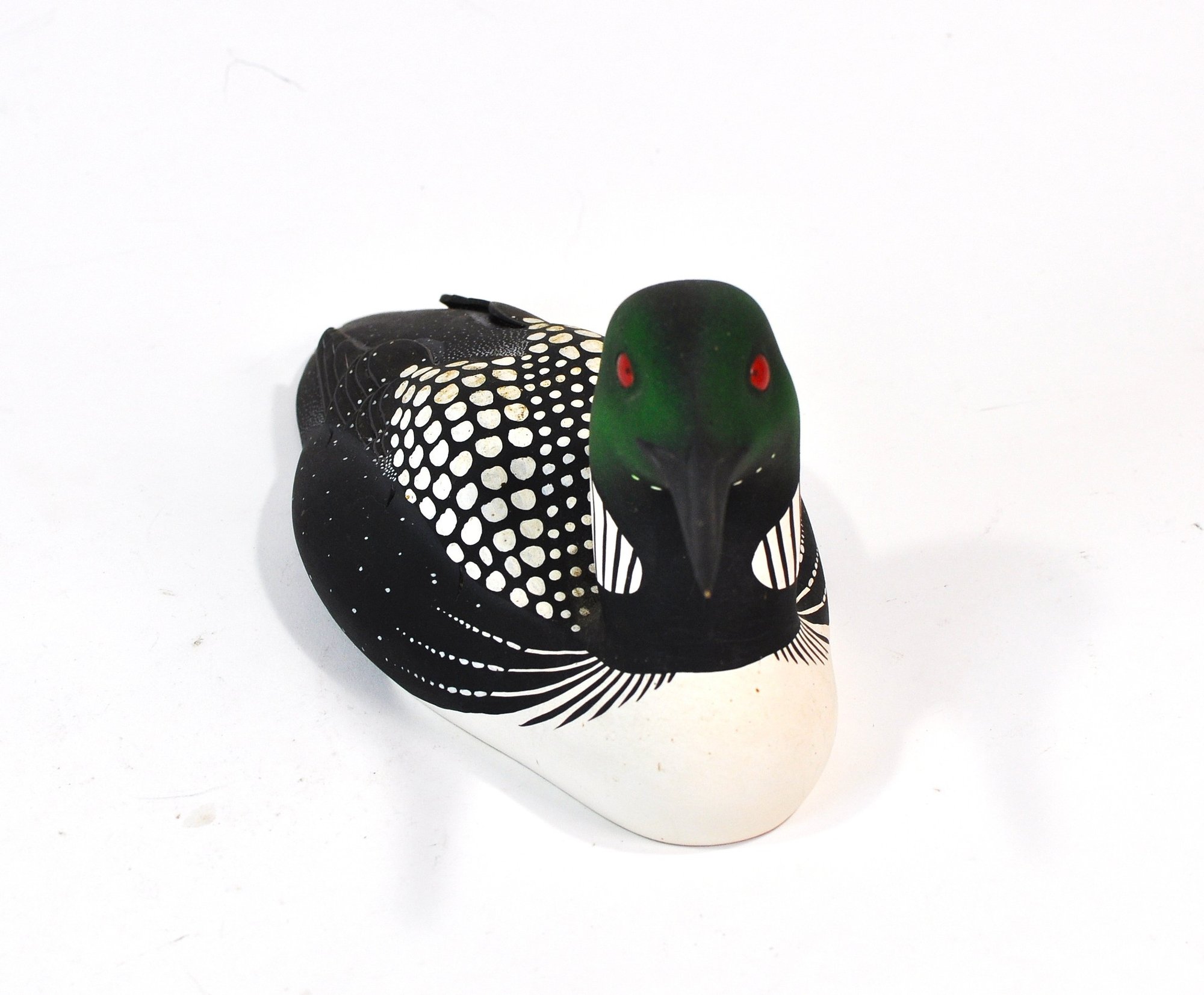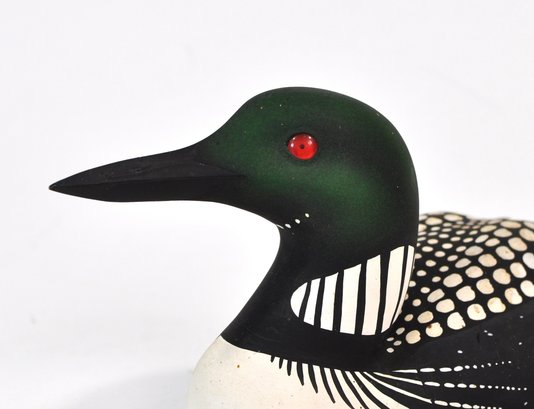 Hand-carved and painted loon decoy, finely detailed and realistically executed, featuring a dark green head with red glass eyes, black body with white spotting, and a white breast. The form is well balanced with crisp carving and careful surface decoration.