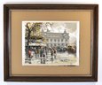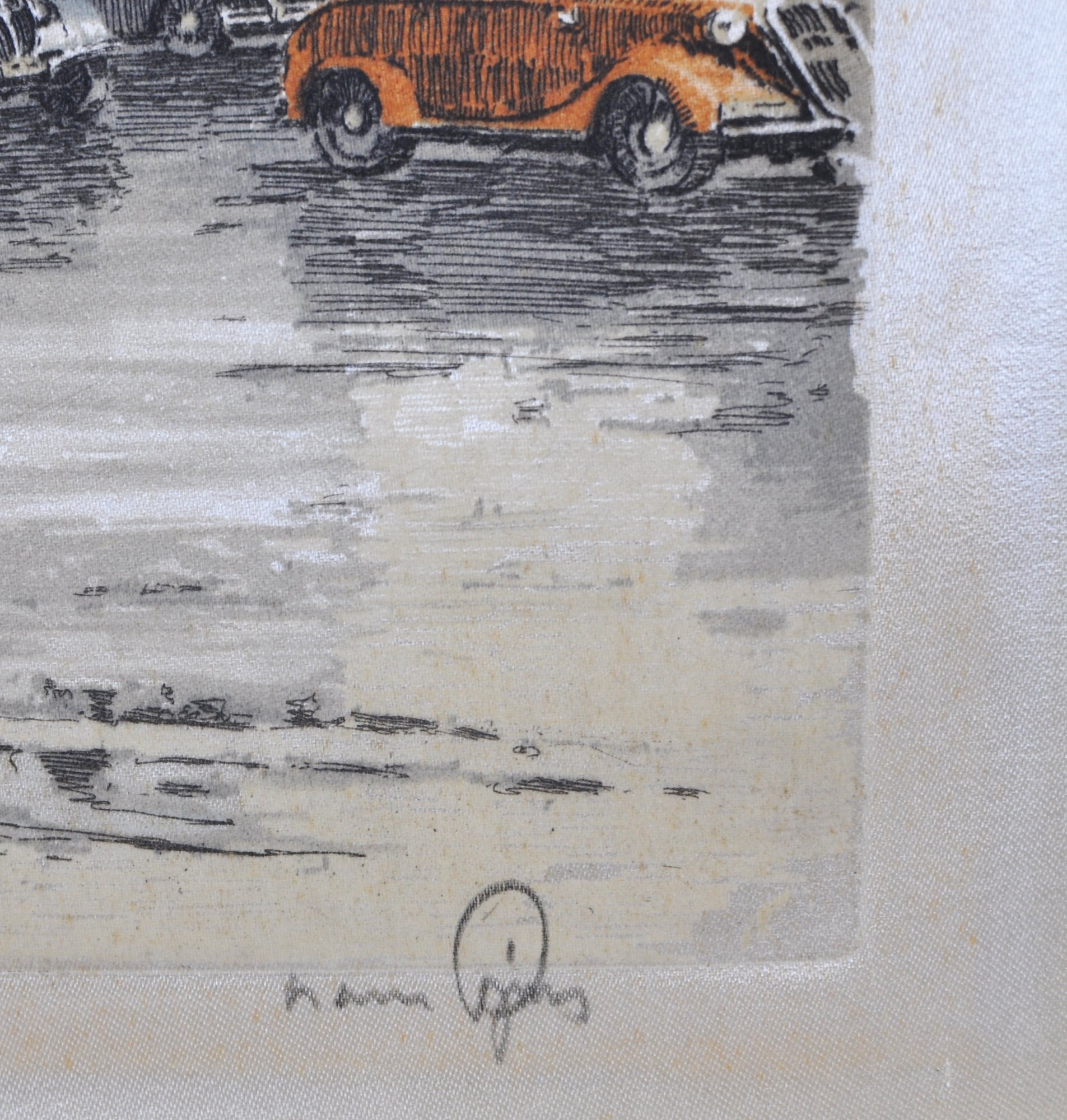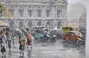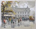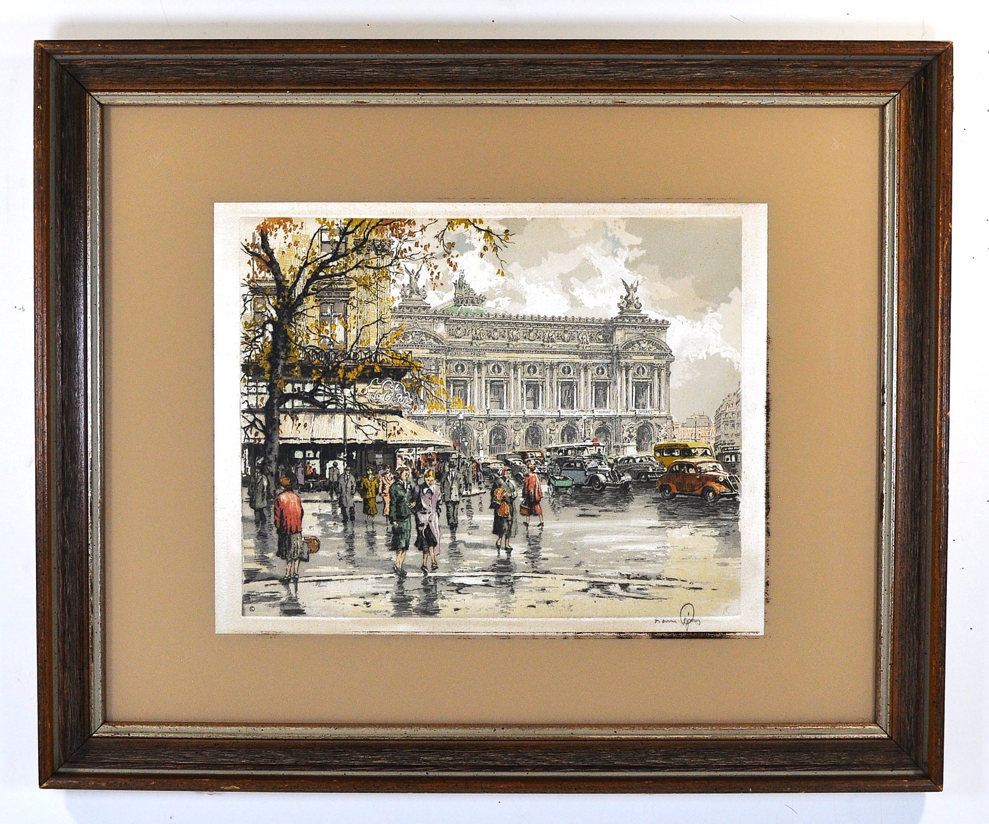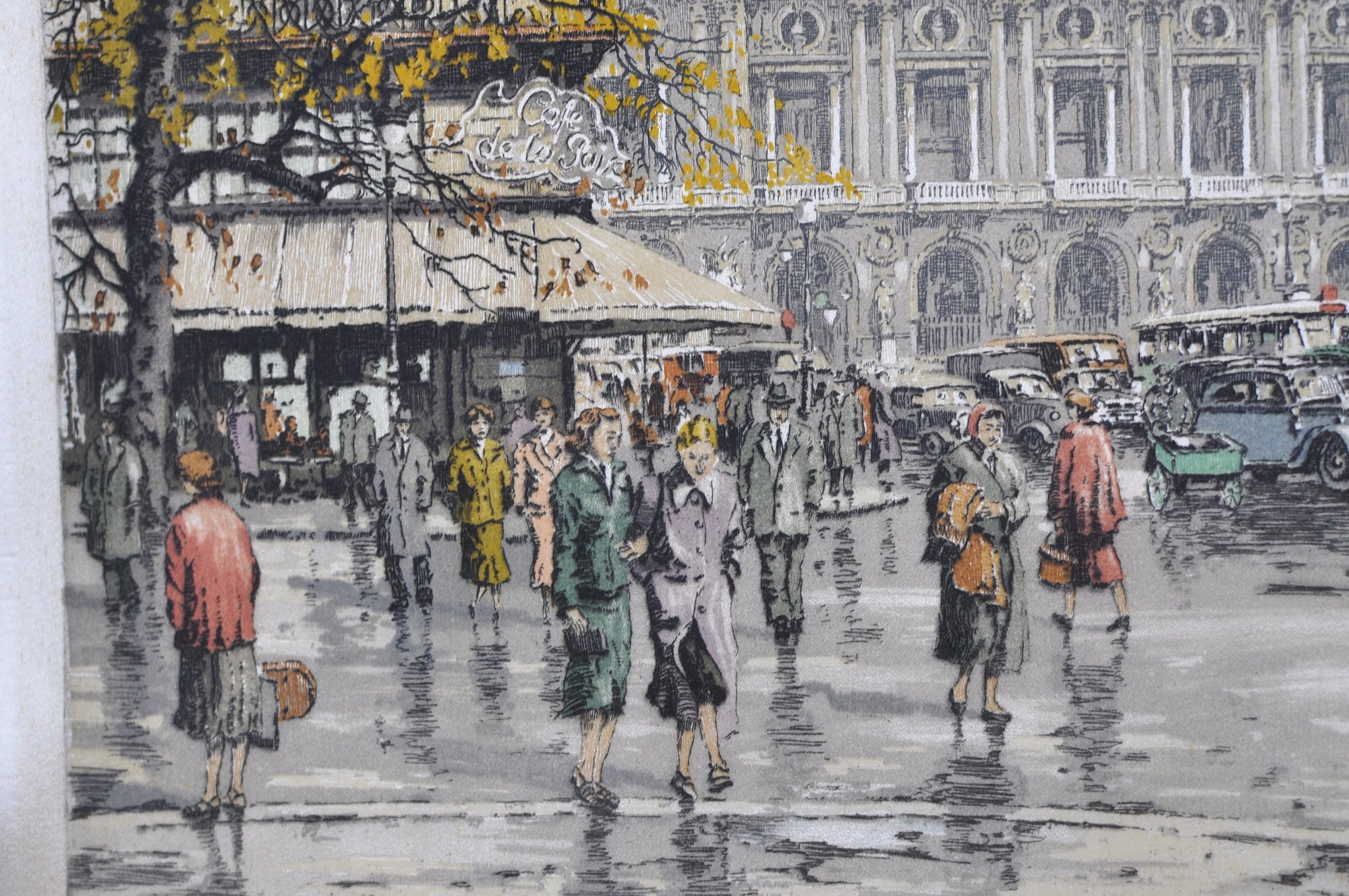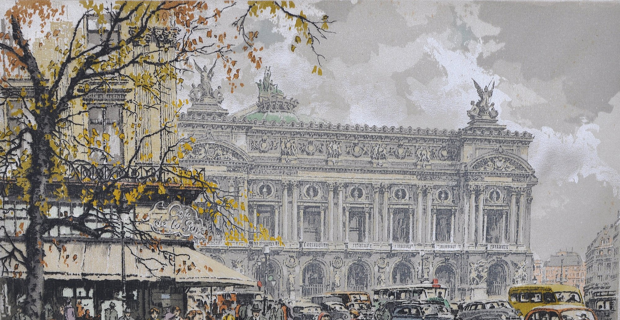 Vintage color etching on silk depicting the Paris Opera House (Palais Garnier) with lively street scene and period automobiles. Signed in pencil lower right Hans Figura (1898–1978).
