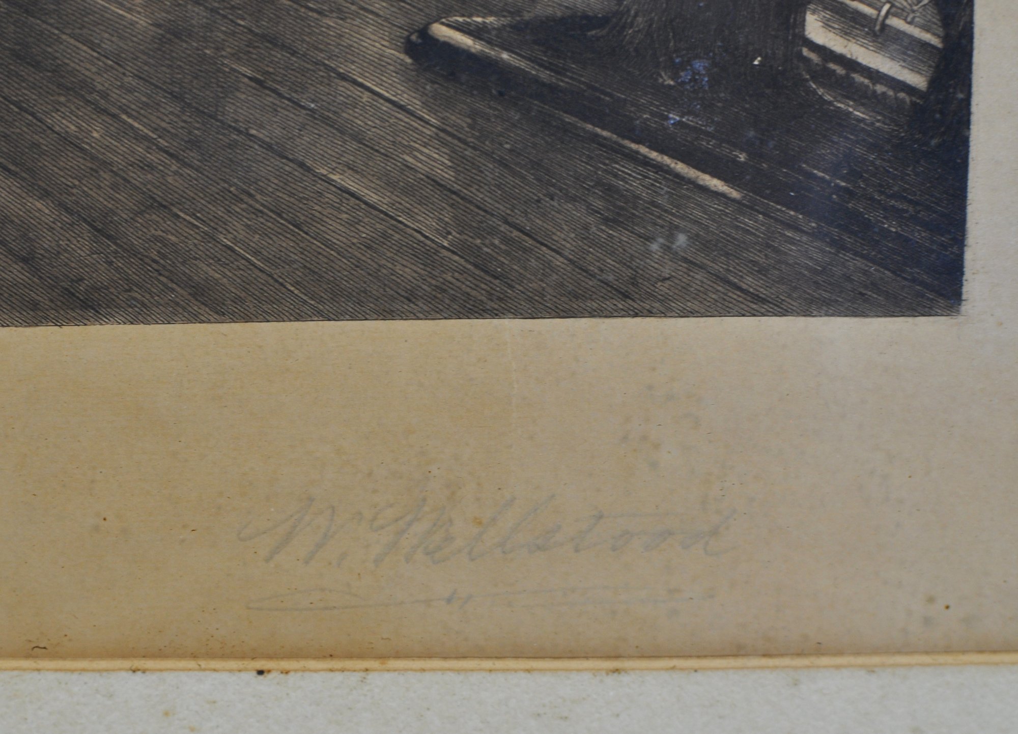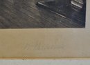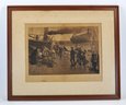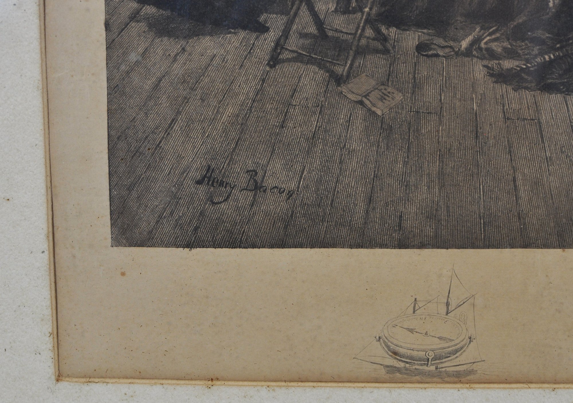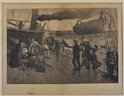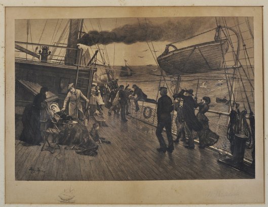 Framed maritime print depicting an active scene aboard a ship’s deck, with sailors and passengers gathered amid rigging, lifeboats, and open sea beyond. The composition conveys movement and drama, with strong linear detail and atmospheric shading. Signed in plate lower left, also signed in pencil om margin lower right. Framed under glass.