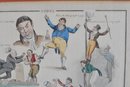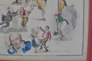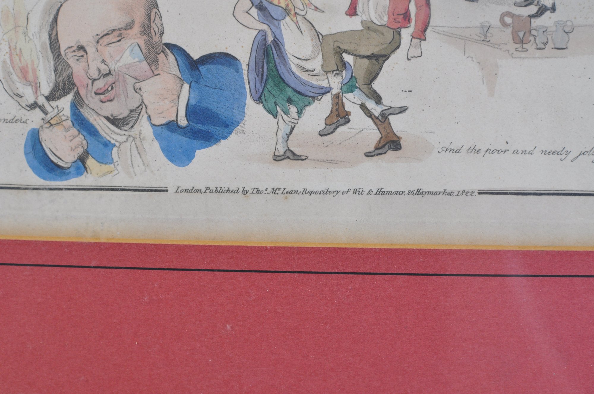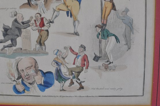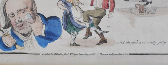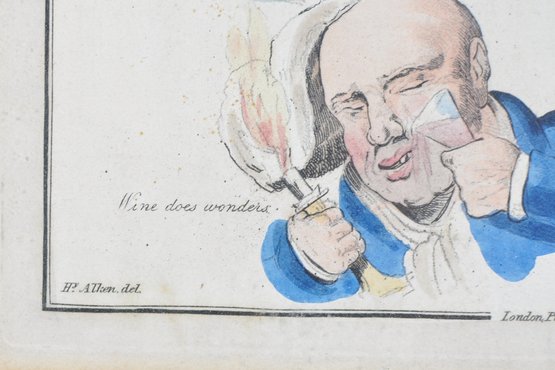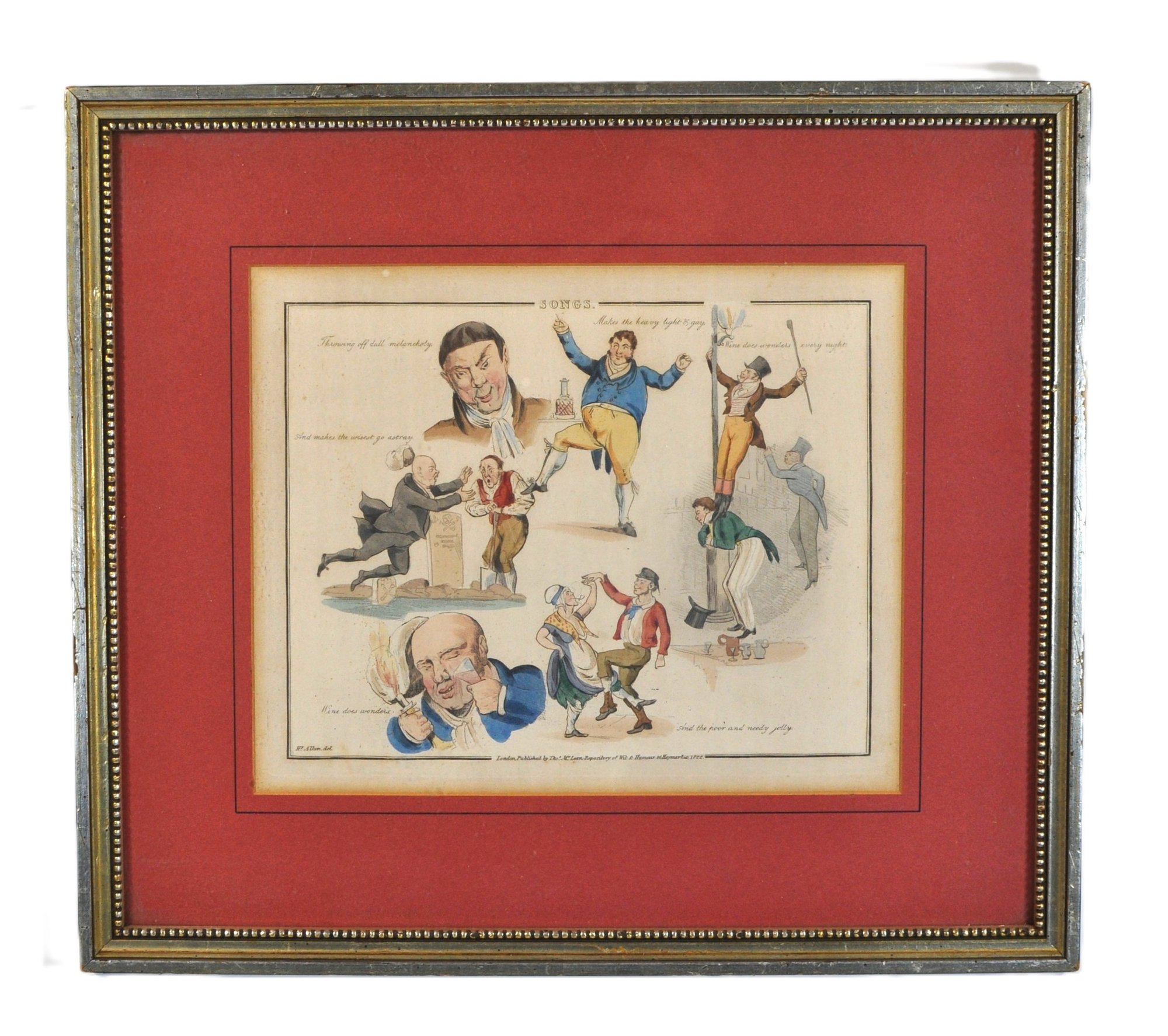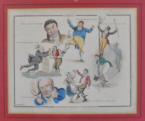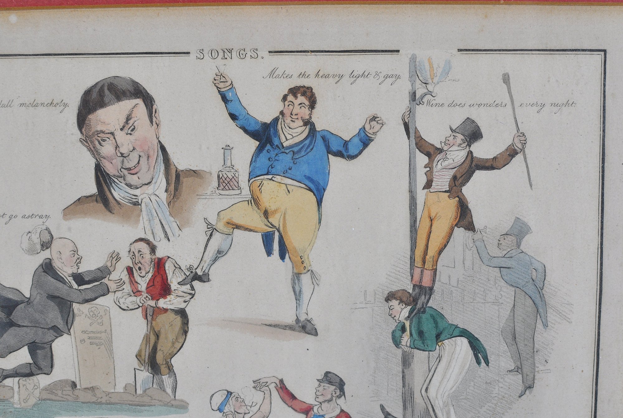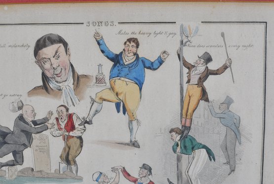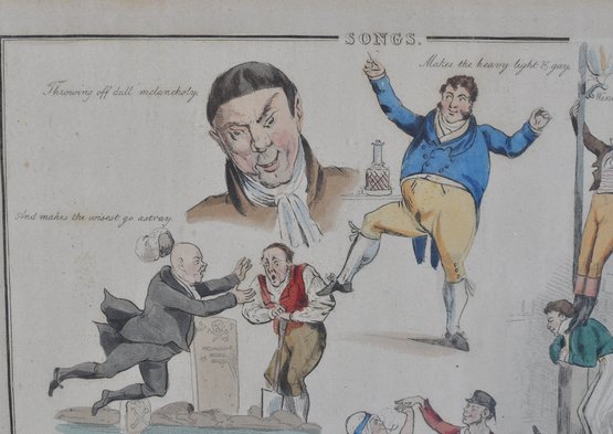 Early 19th-century hand-colored satirical engraving titled “Songs.” The humorous composition features several lively caricature scenes illustrating popular drinking and tavern song themes, including dancing figures and comic characters with captions such as “Wine does wonders” and “And the poor and needy jolly.”
