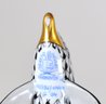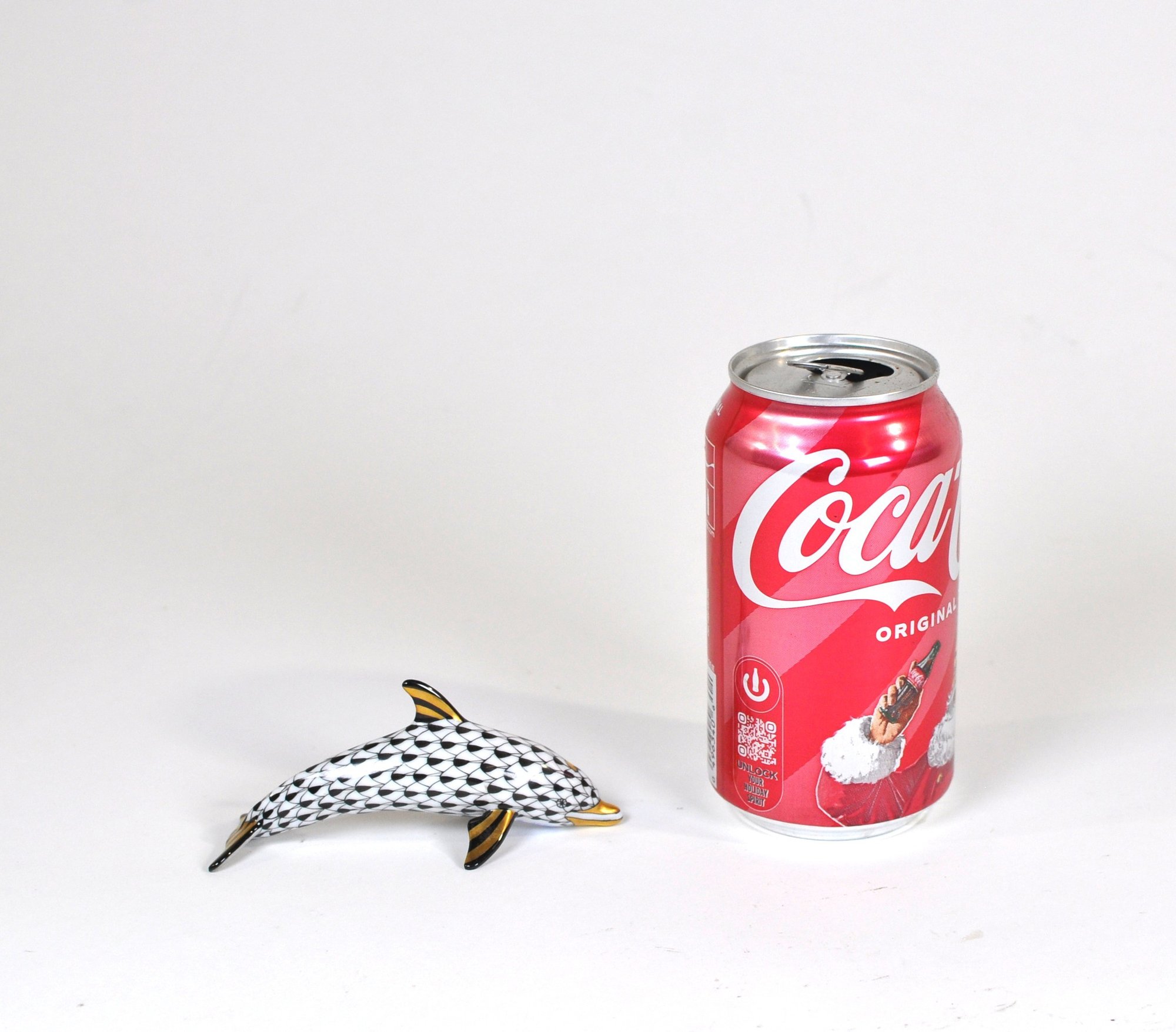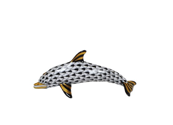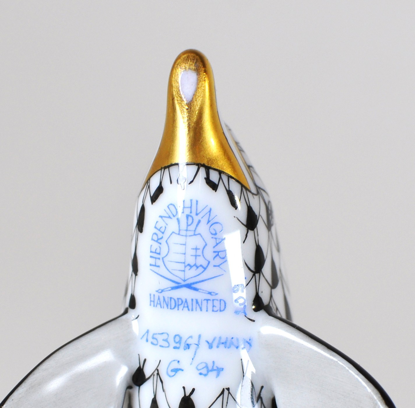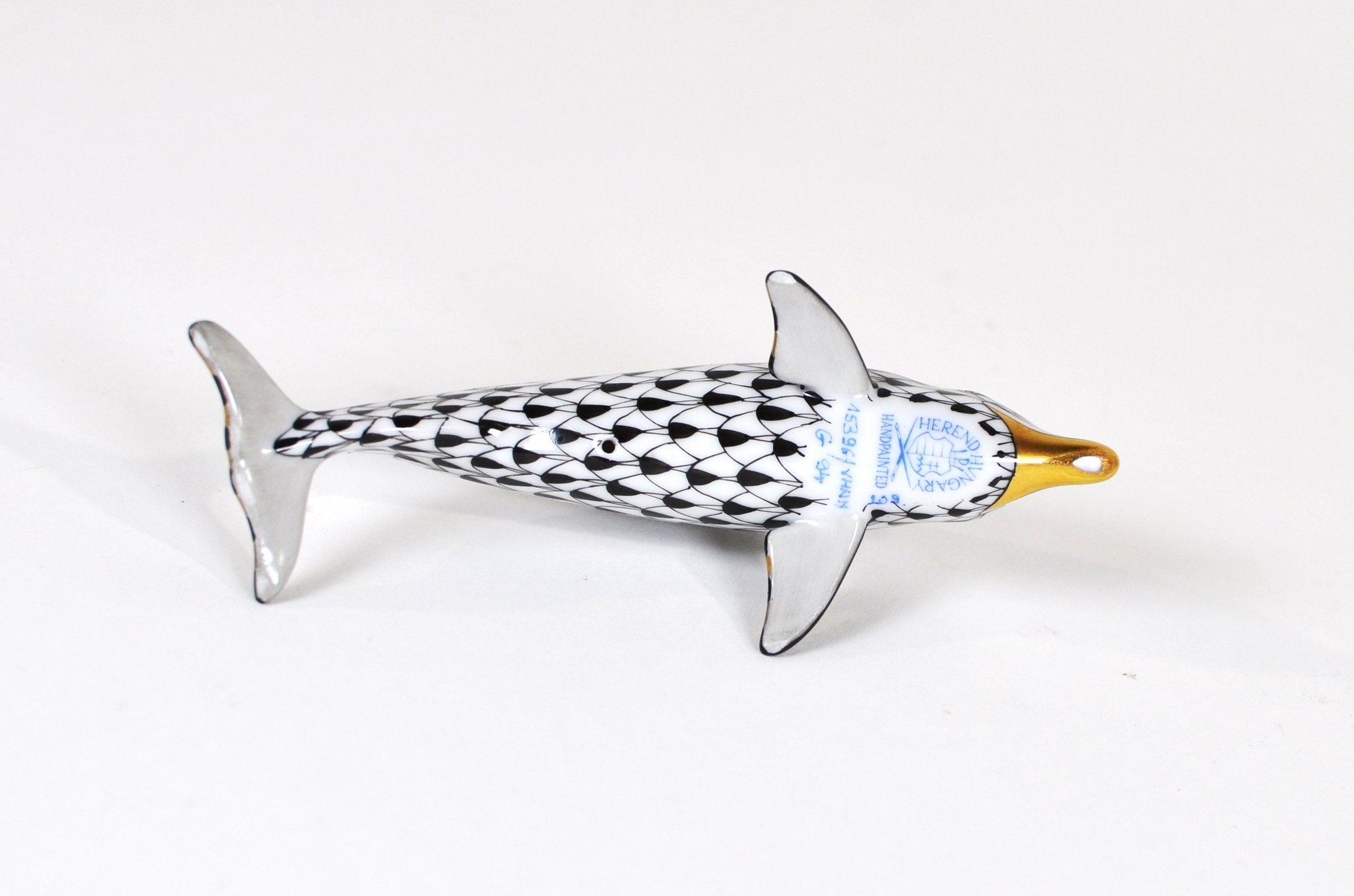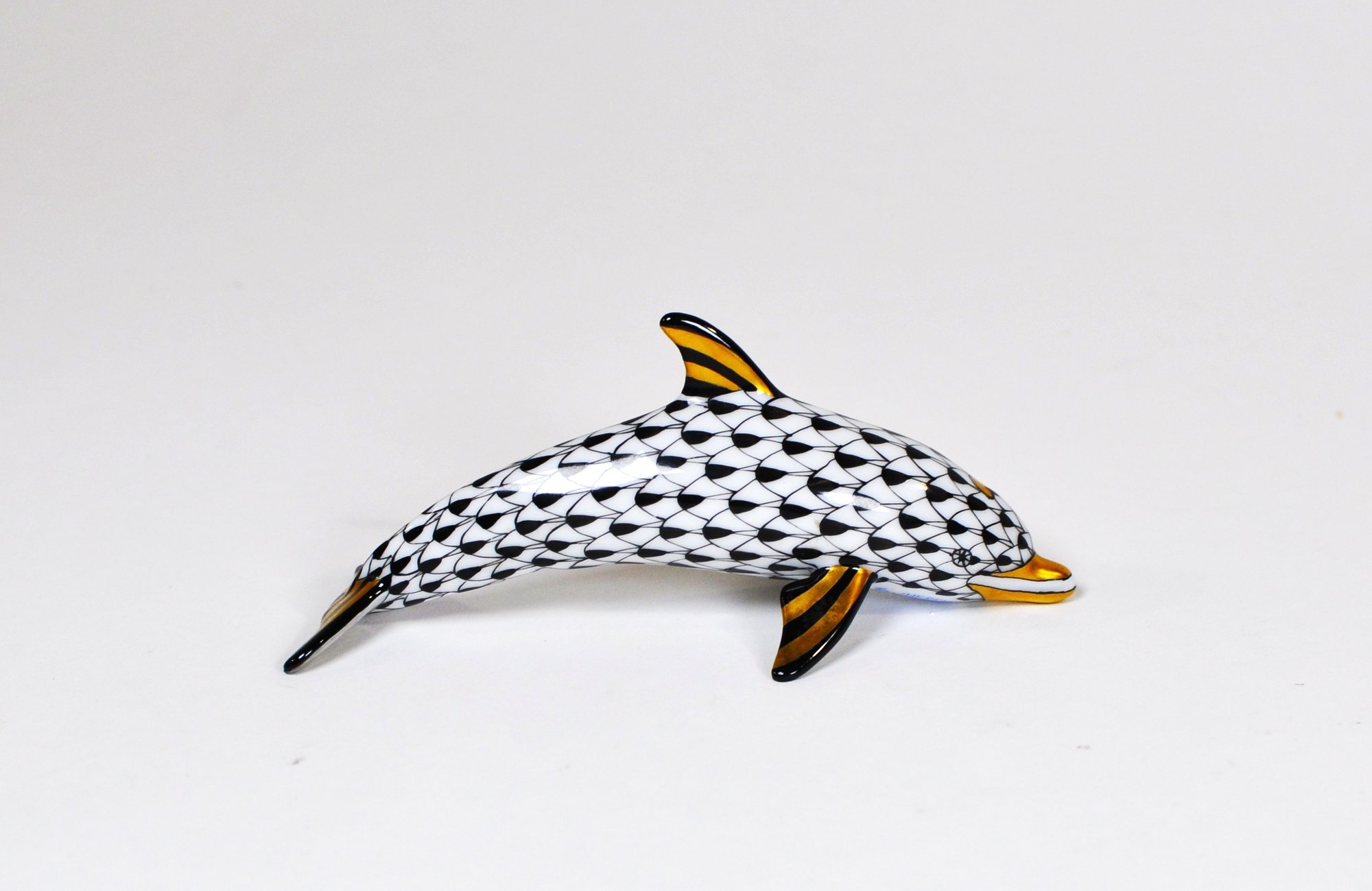 Offered is a fine Herend Hungary hand-painted porcelain fish figurine, decorated in the classic fishnet (net) pattern in black white glaze. Features include light blue ears, gilt accents (nose, fins), and a curled tail.