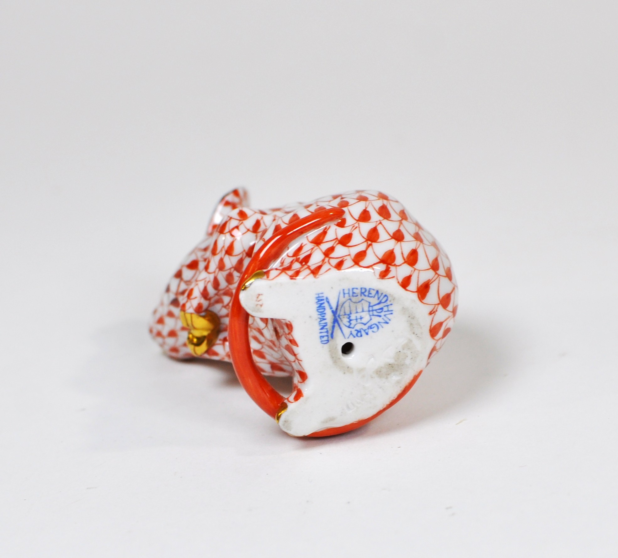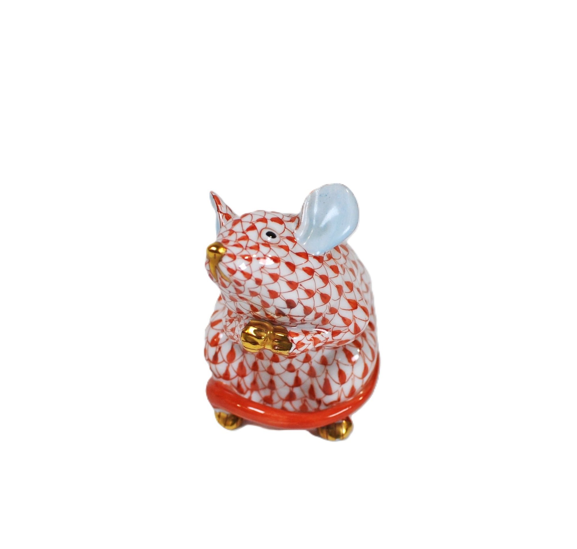 Offered is a fine Herend Hungary hand-painted porcelain mouse figurine, decorated in the classic fishnet (net) pattern in rust/orange over white glaze. Features include light blue ears, gilt accents (nose, paws), and a curled tail forming the base.