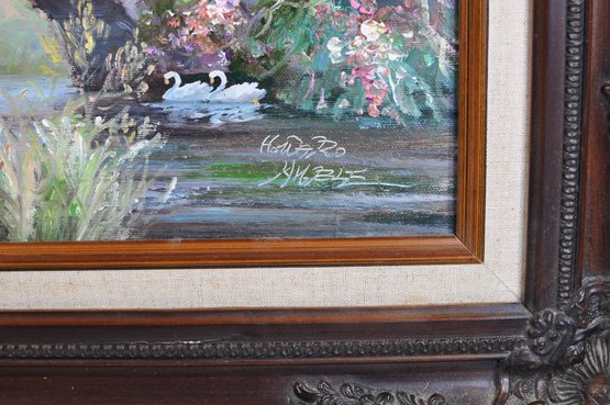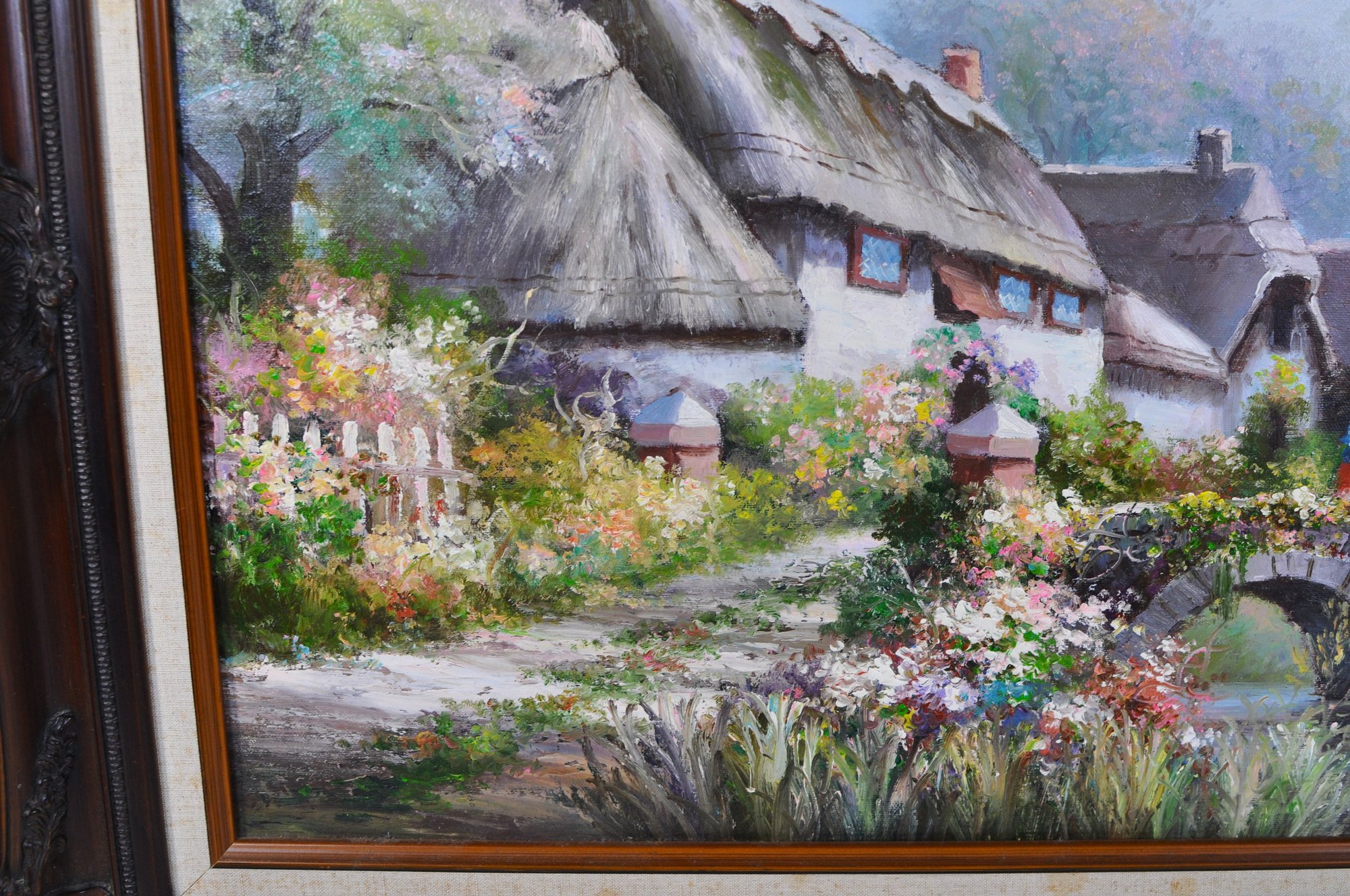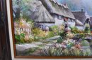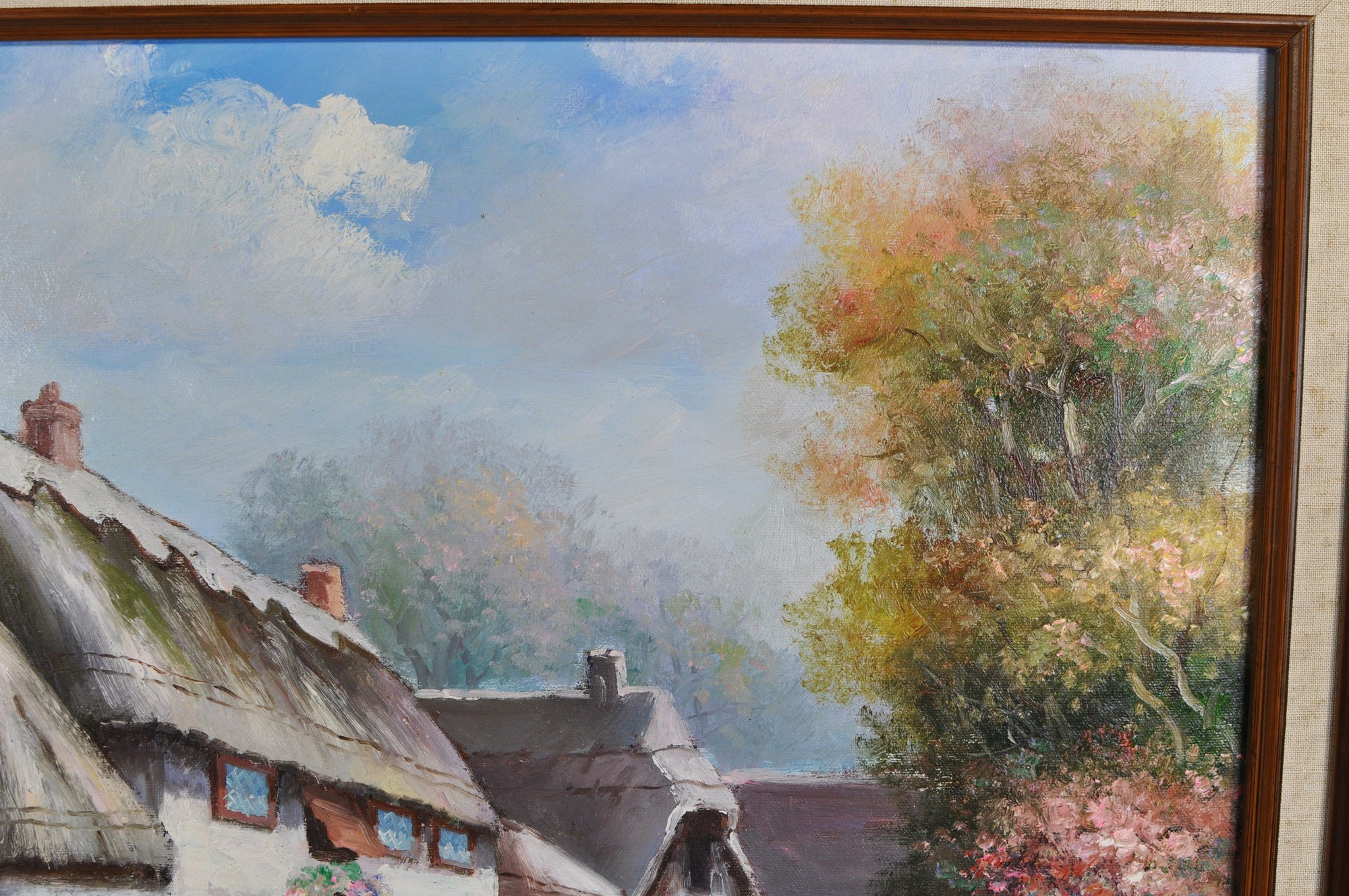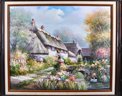 Original oil on canvas by Howard Kimble (American, 1907–1973), depicting a charming English cottage garden with thatched-roof houses, flowering borders, a stone bridge over a quiet stream, and swans gliding in the water.
