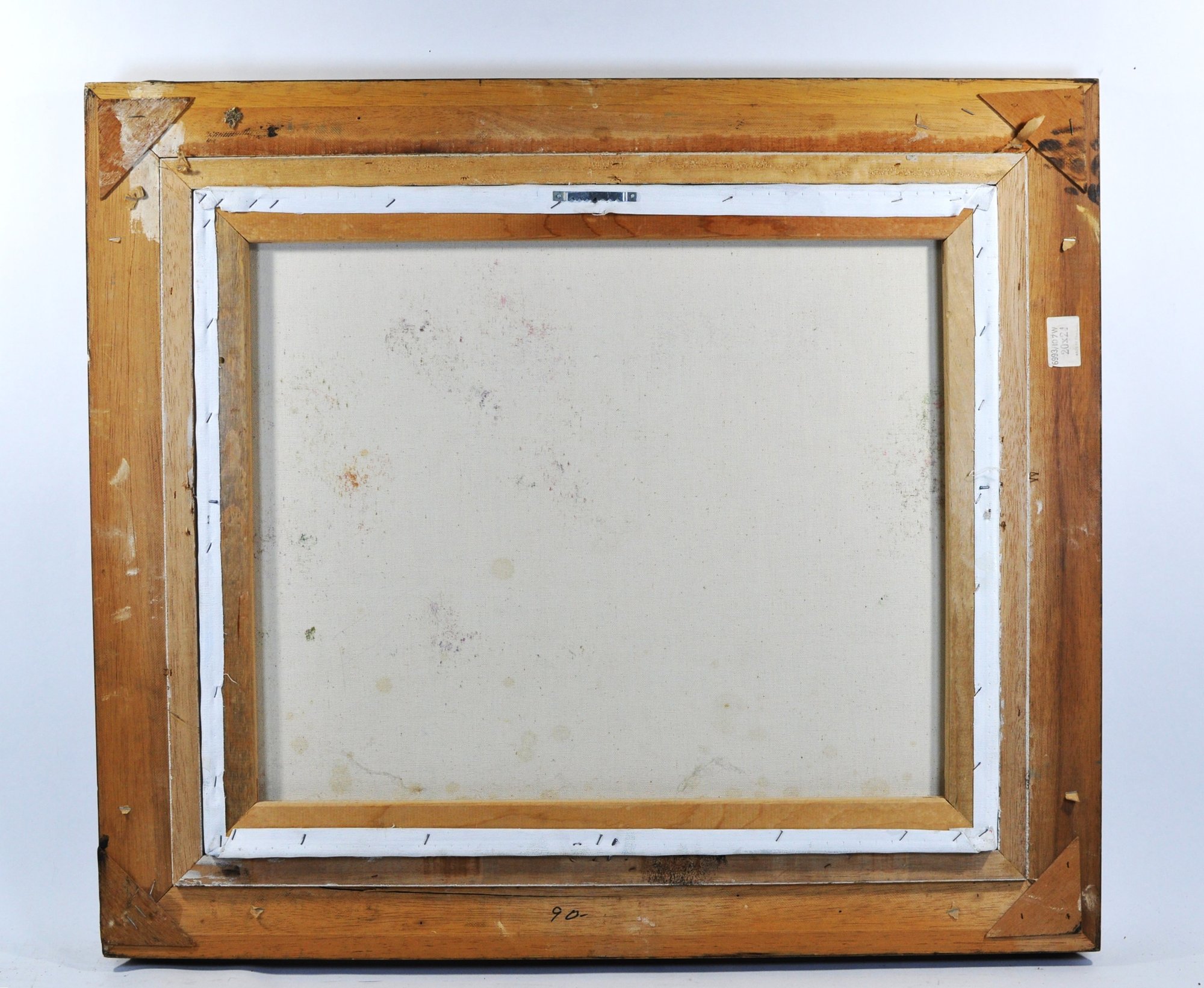 Signed by the artist at lower right. Presented in an ornate carved and gilt-accented frame, enhancing the traditional character of the work. Canvas is stretched on a wooden frame.