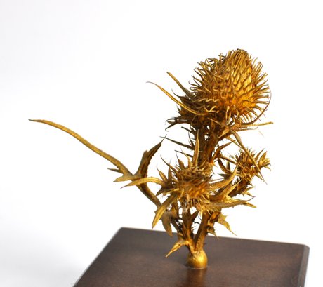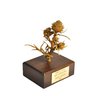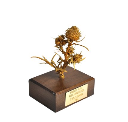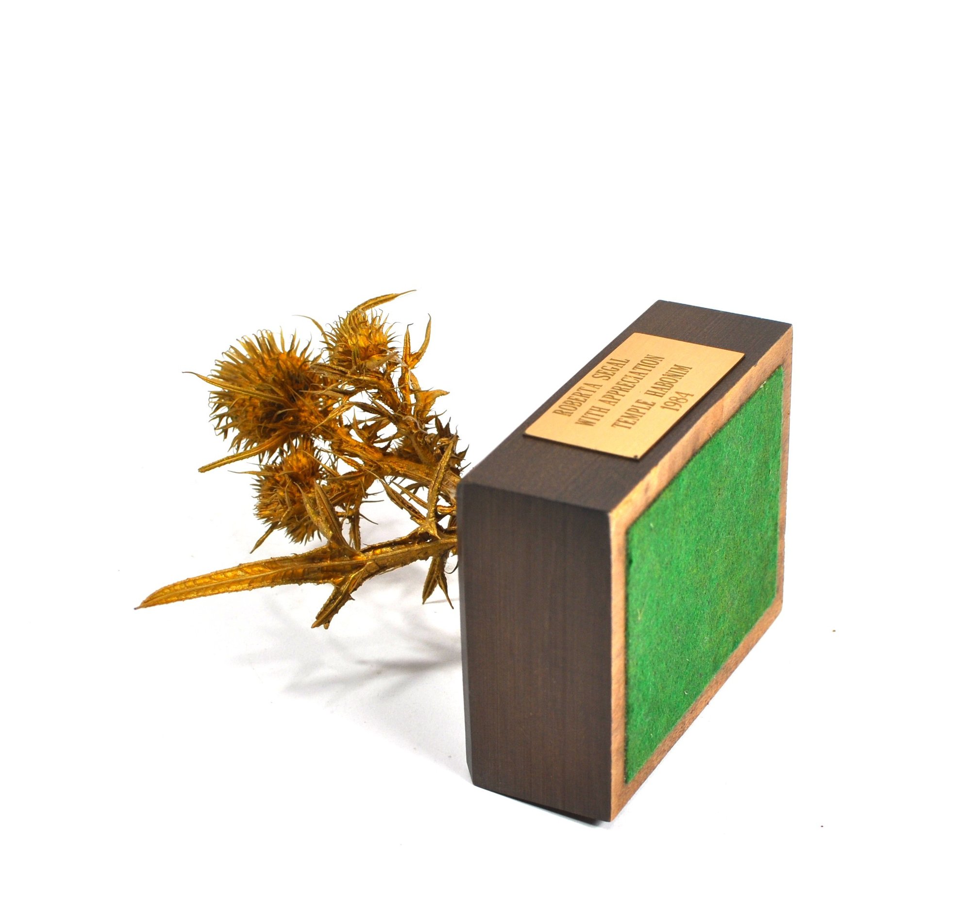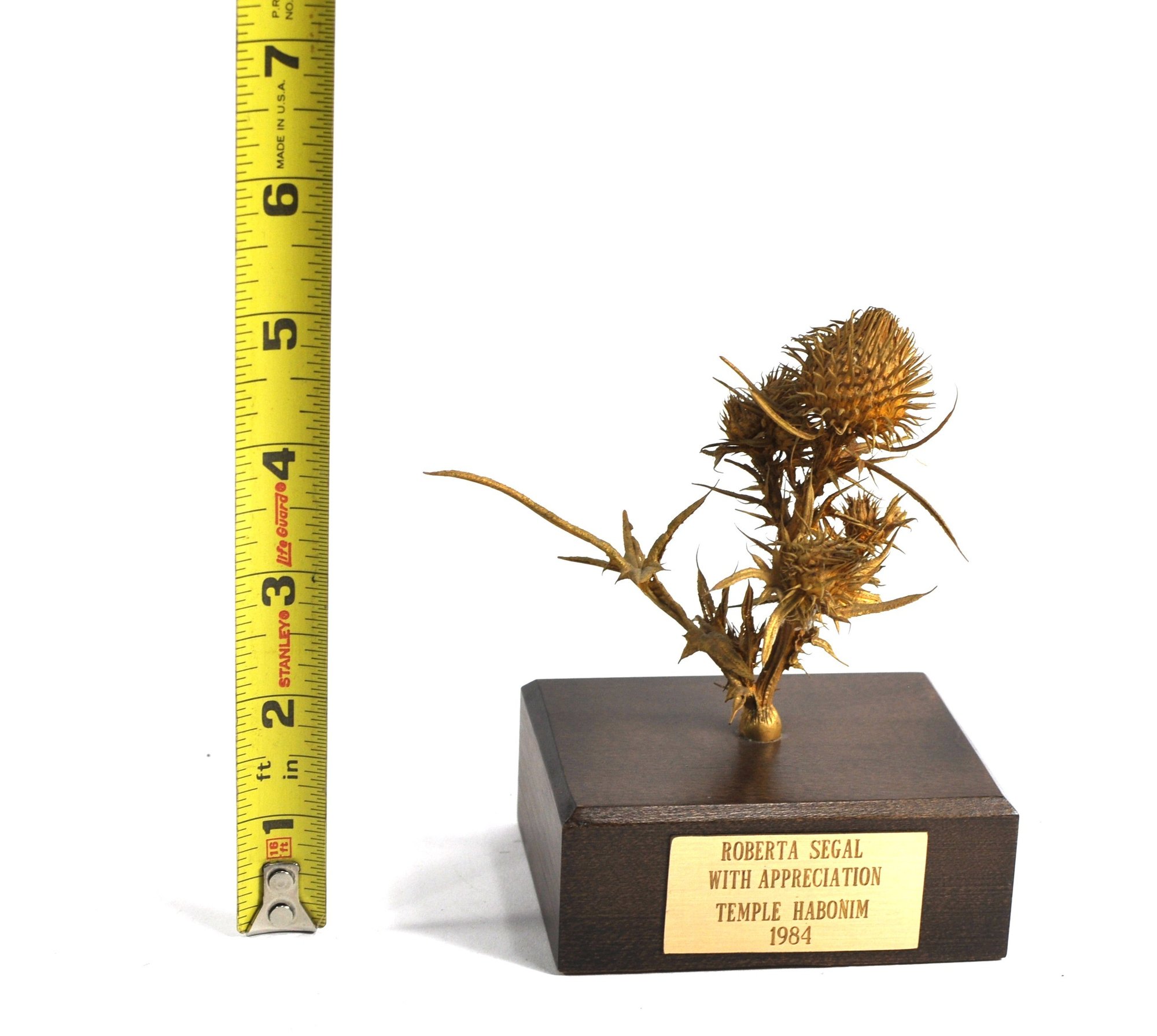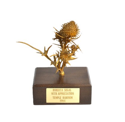 Original bronze sculpture depicting a thistle plant, designed by James Houston mounted on a rectangular hardwood base with green felt underside. The front bears a brass presentation plaque reading: “ROBERTA SEGAL / WITH APPRECIATION / TEMPLE HABONIM / 1984.”Created as a commemorative or presentation piece. Roberta Segal is a known Rhode Island artist.