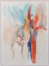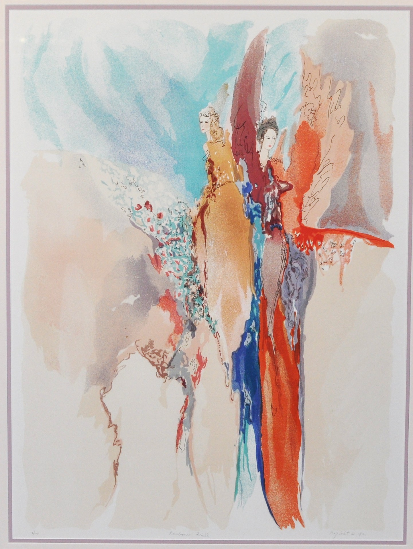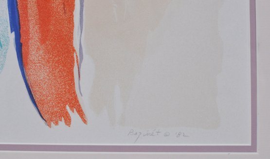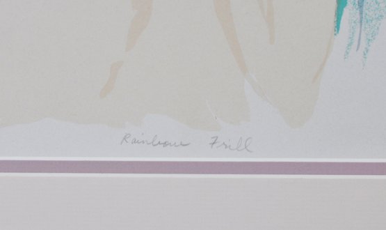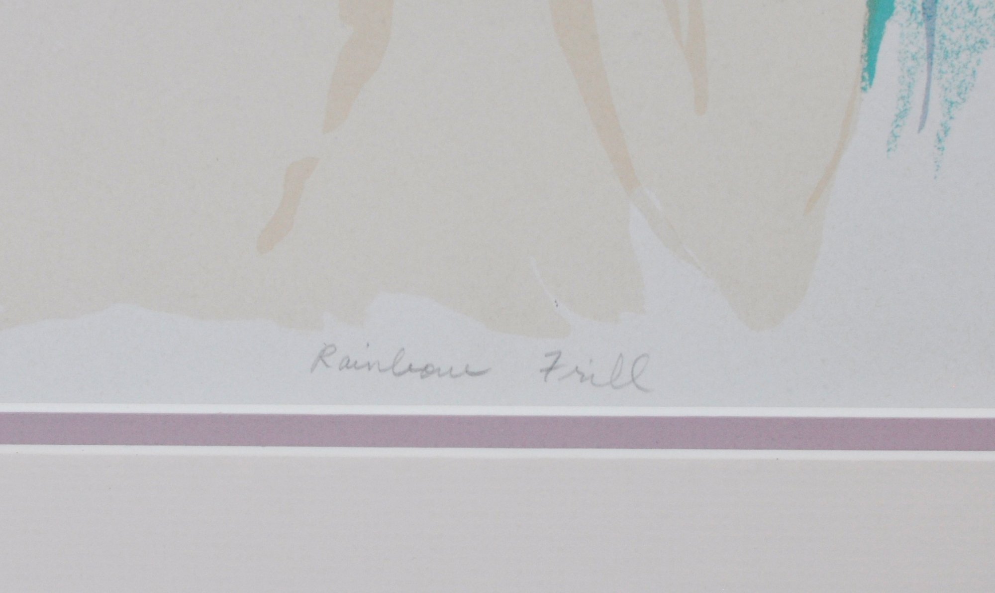 Colorful abstract figural lithograph titled Rainbow Frills, dated 1982. Signed in pencil by the artist and numbered 6/100. Soft, flowing forms with vibrant red, blue, and aqua tones.