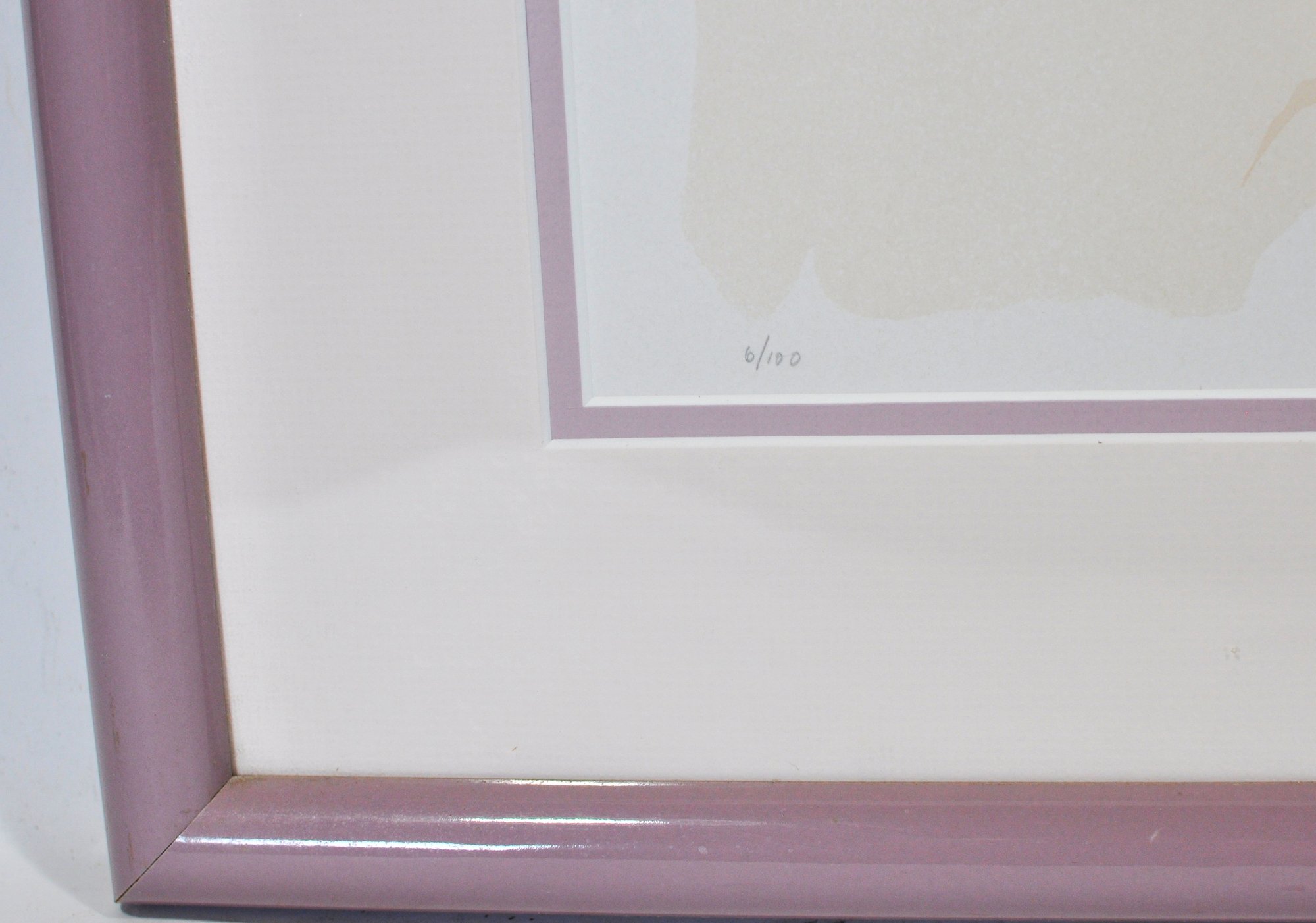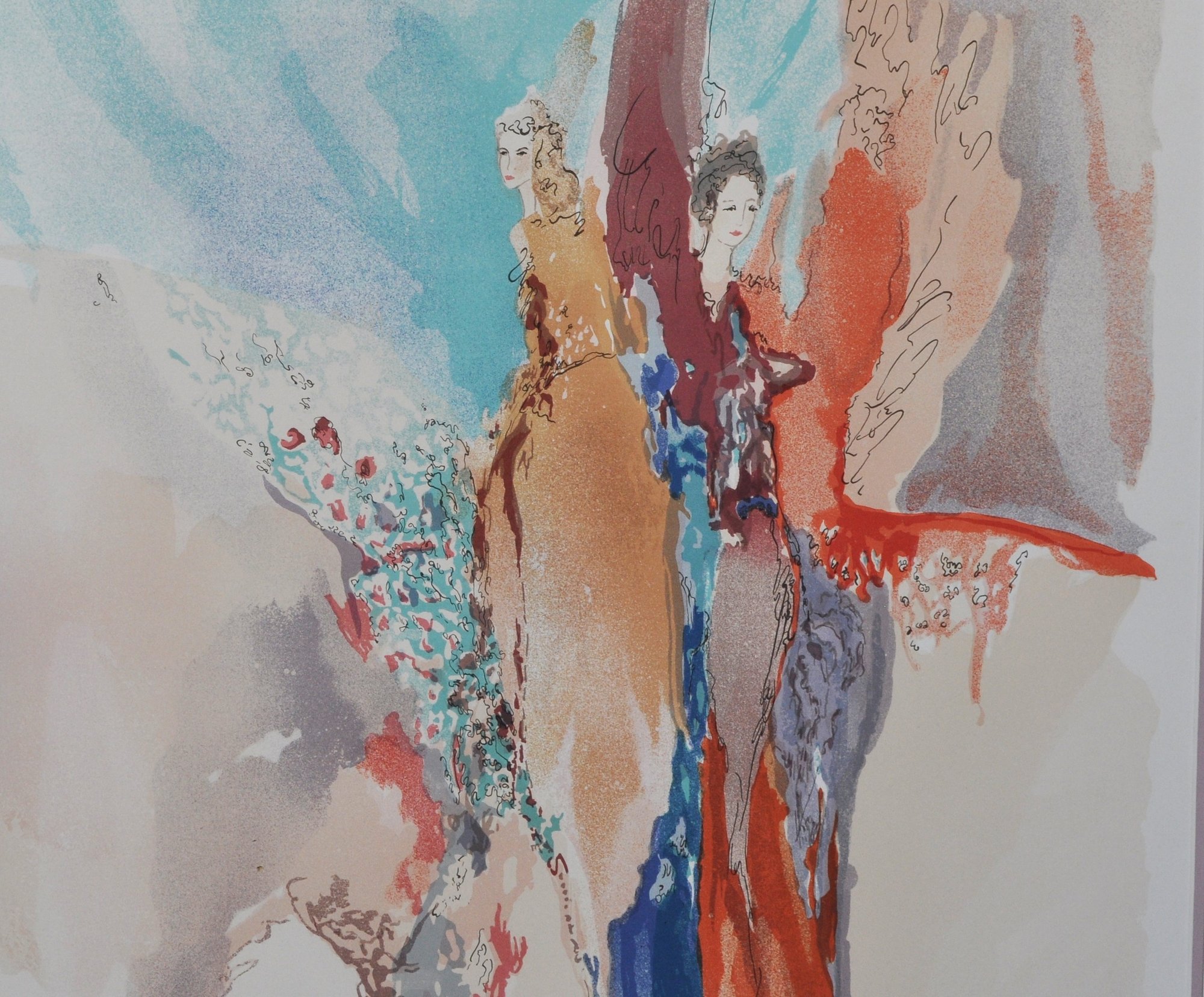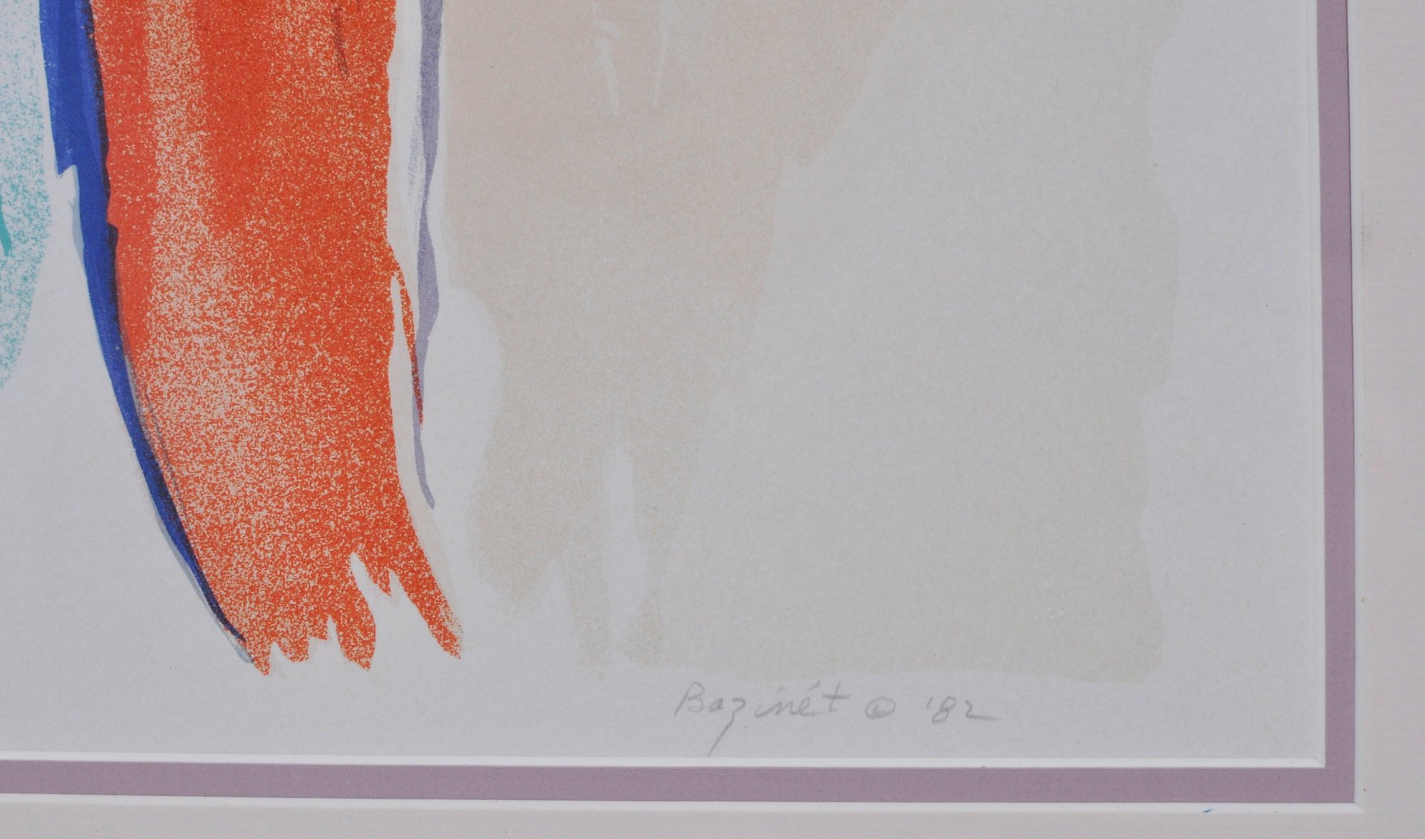 Colorful abstract figural lithograph titled Rainbow Frills, dated 1982. Signed in pencil by the artist and numbered 6/100. Soft, flowing forms with vibrant red, blue, and aqua tones.