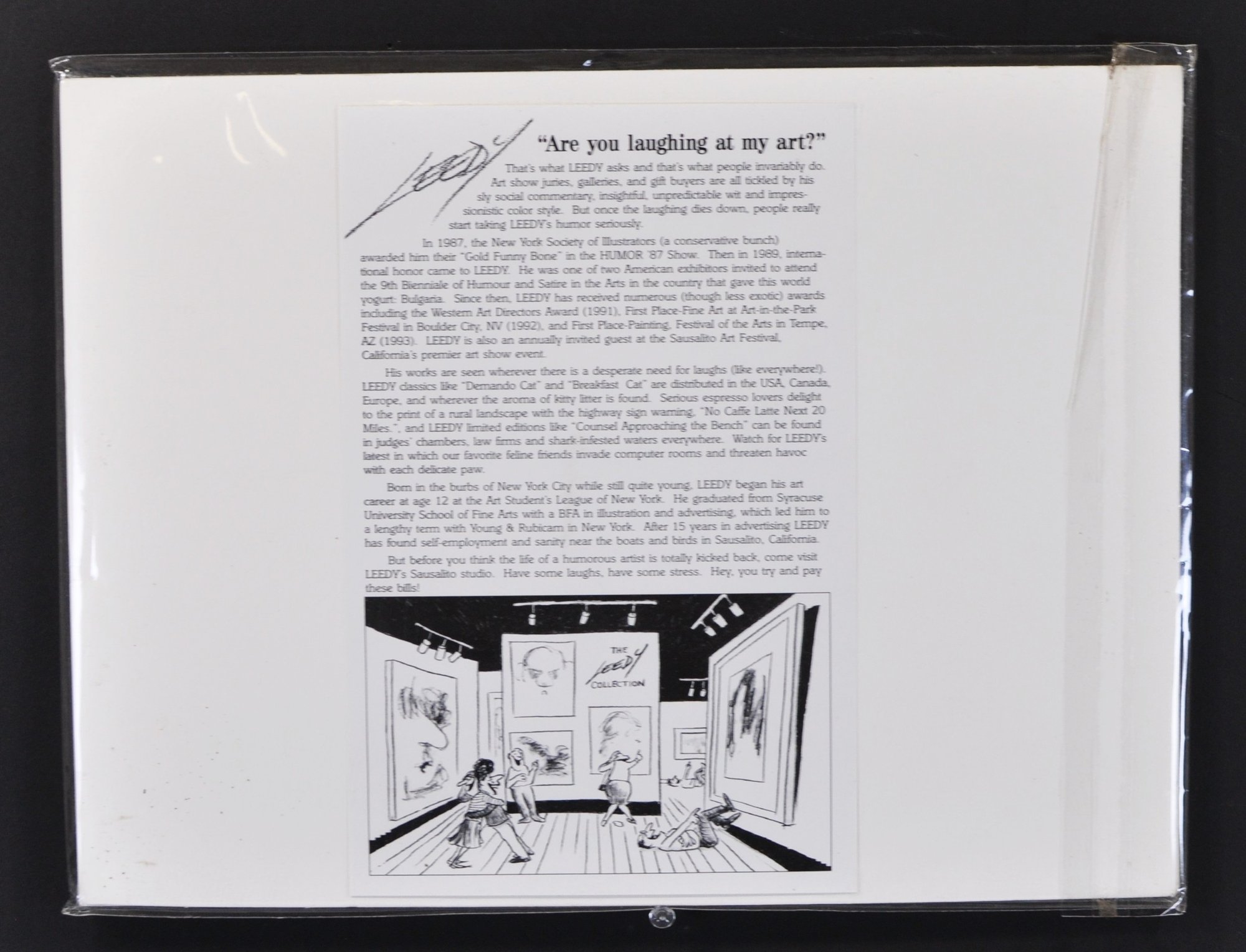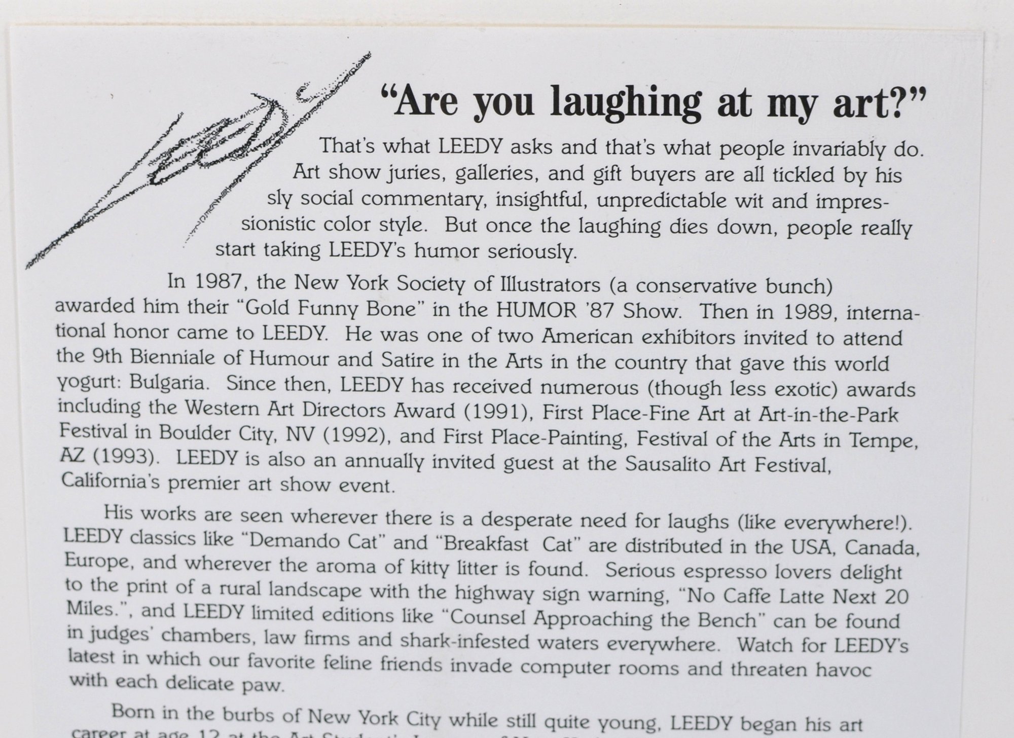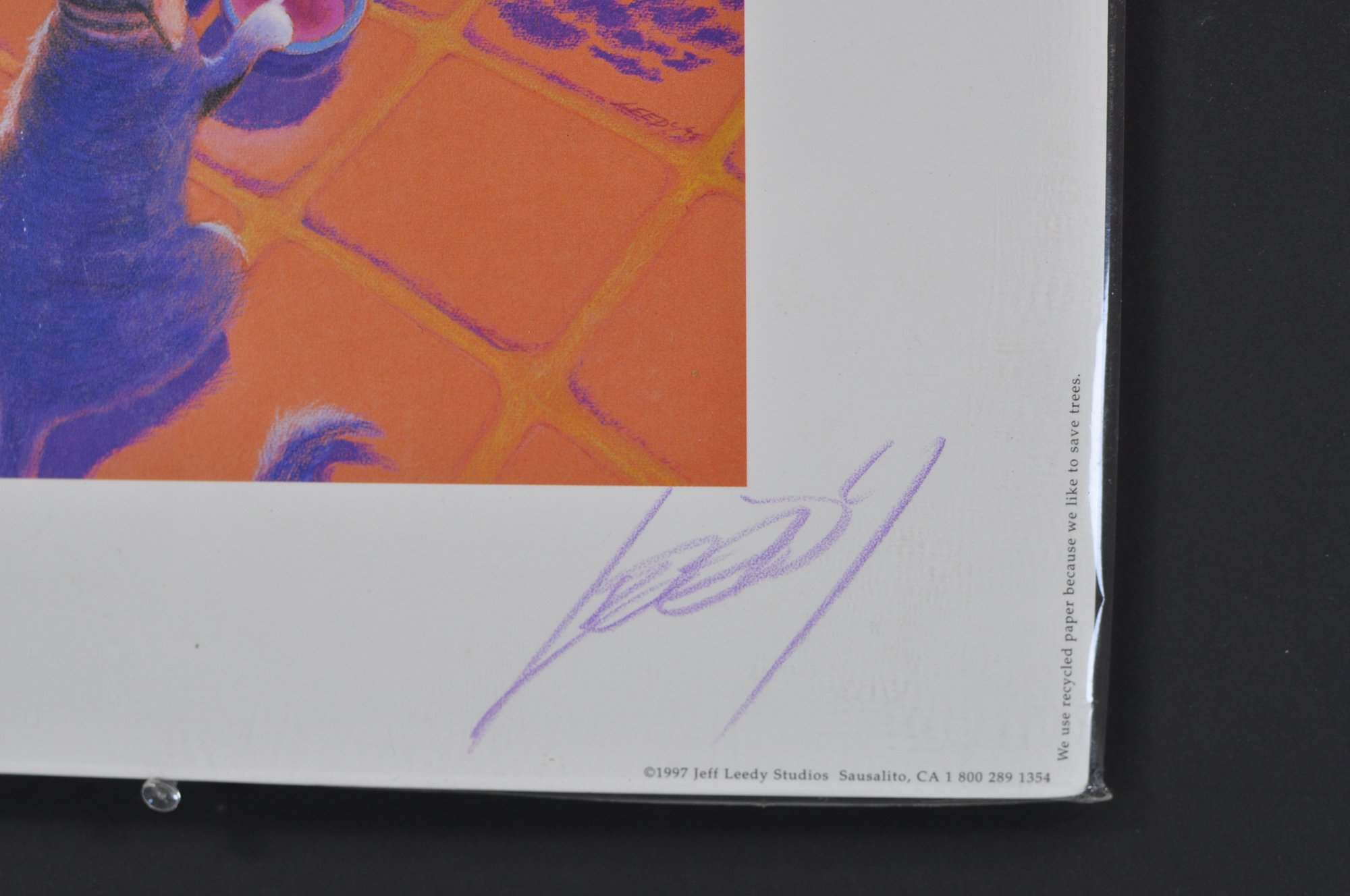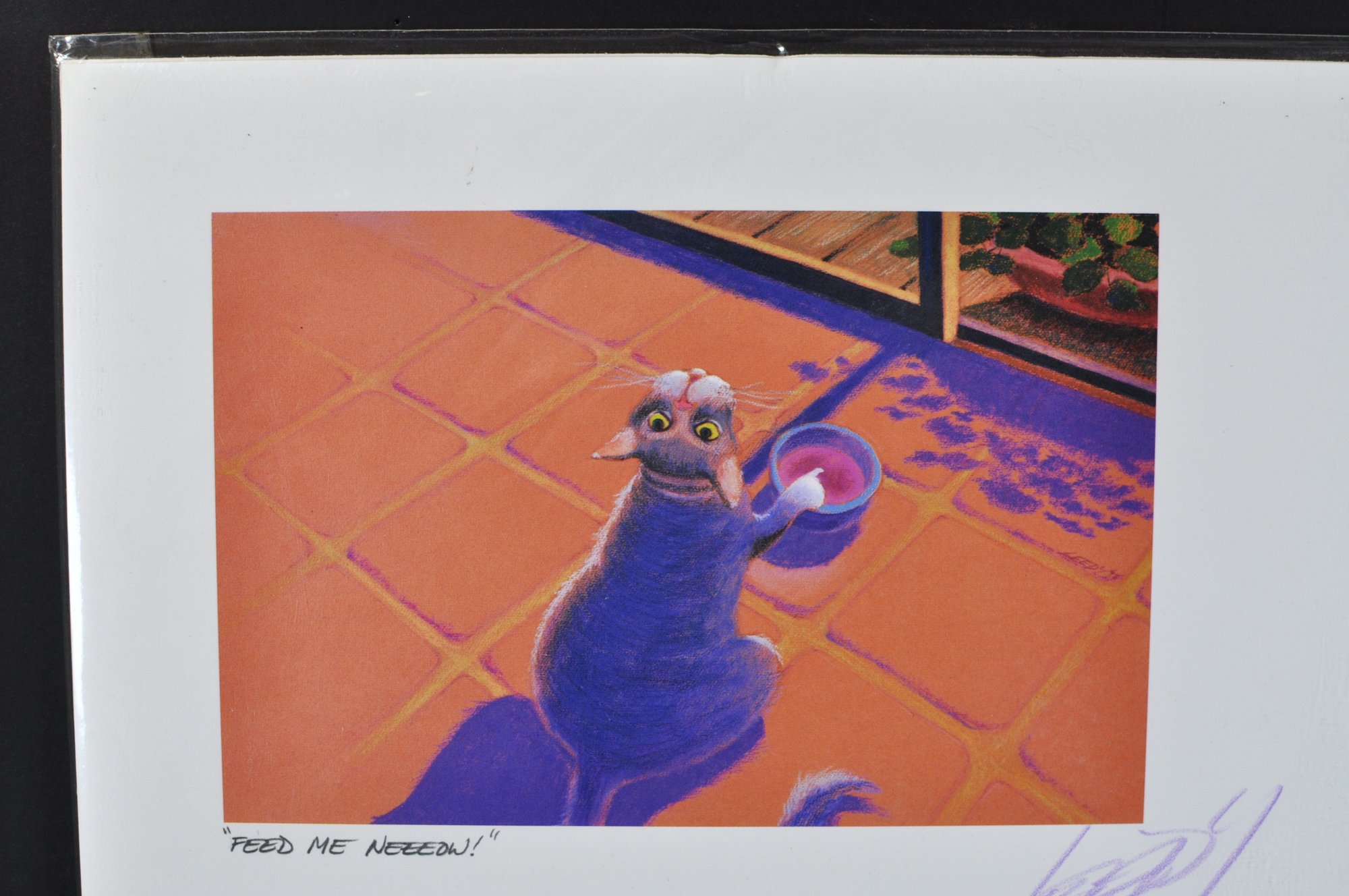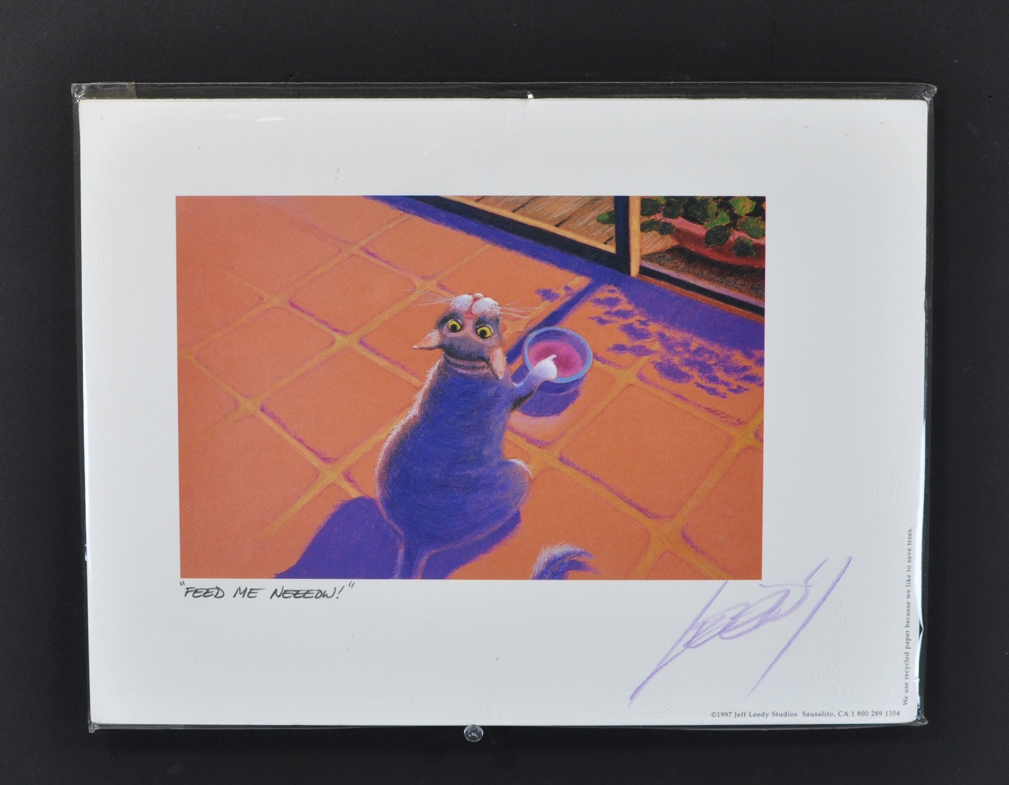 Original 1997 Jeff Leedy art print featuring a hungry cat pleading for dinner, titled “Feed Me Neeeow!”. Hand-signed by the artist in purple pencil. Comes with the original signed biography sheet on reverse.
