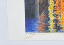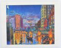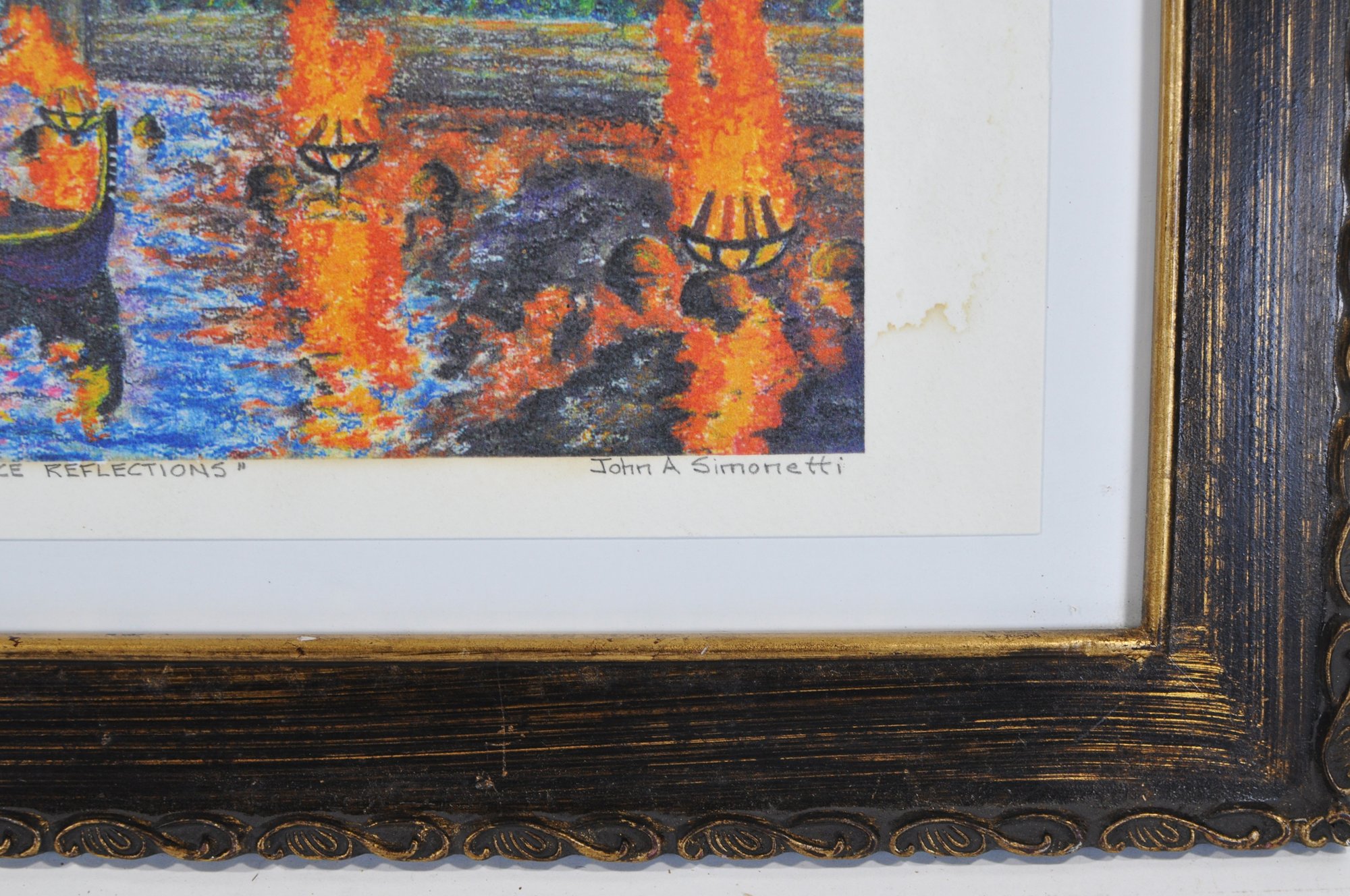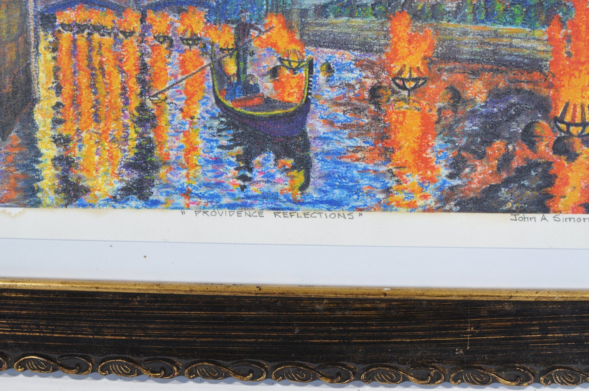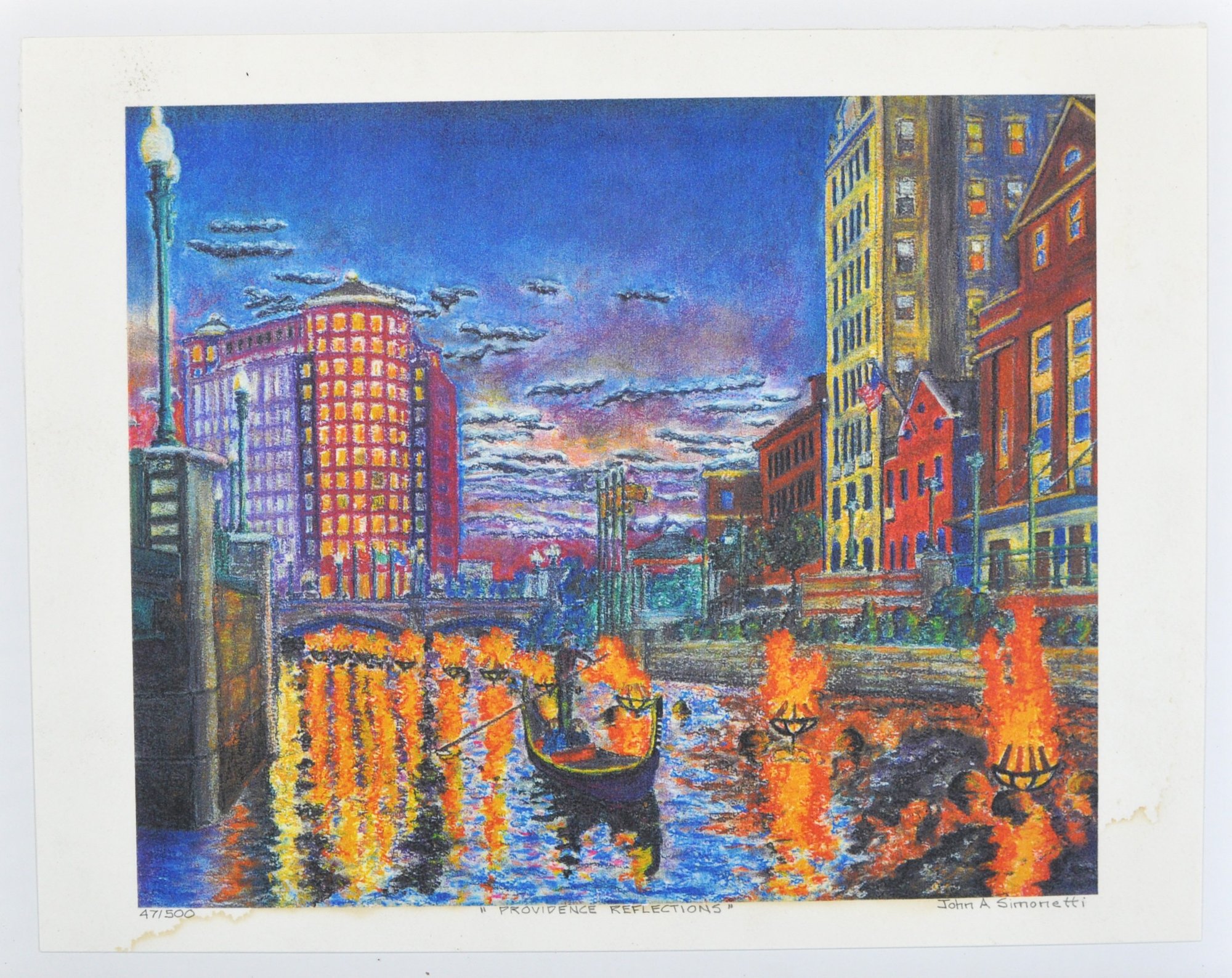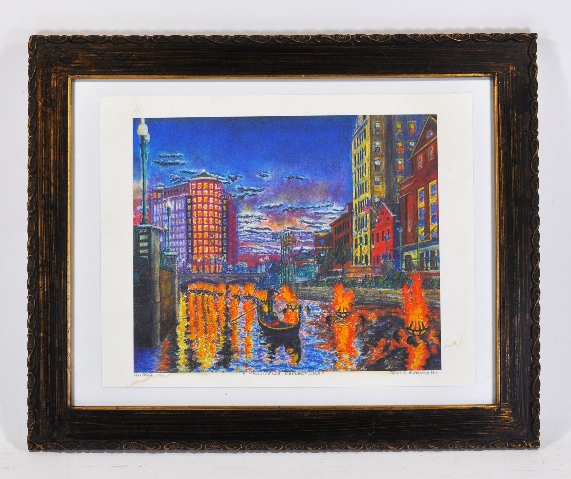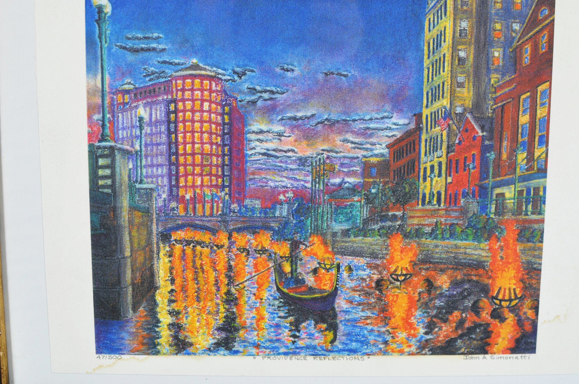 Vibrant signed and numbered limited-edition print by John A. Simonetti, titled “Providence Reflections.” The artwork depicts the Providence WaterFire installation with bright city lights and glowing river braziers.