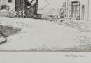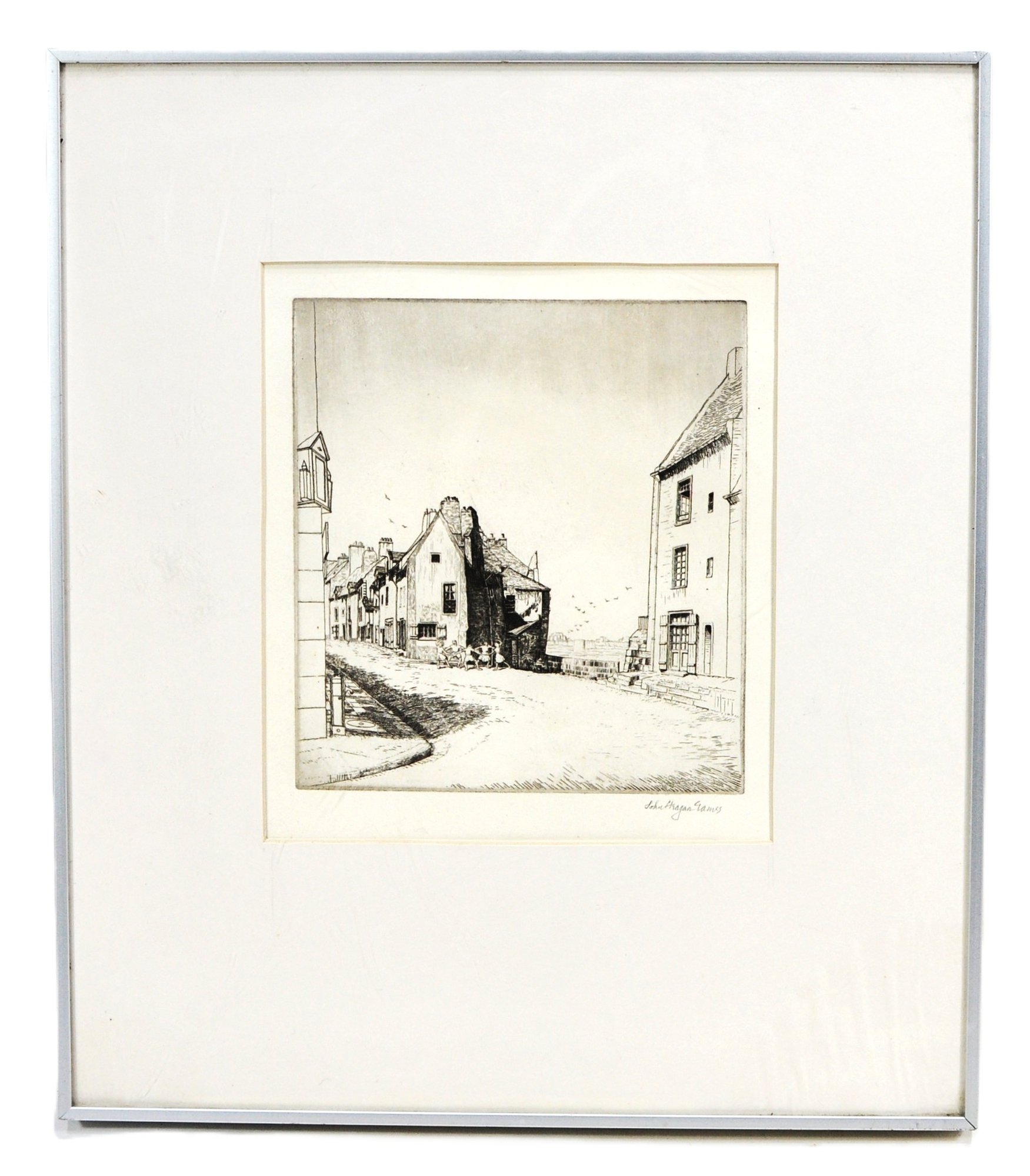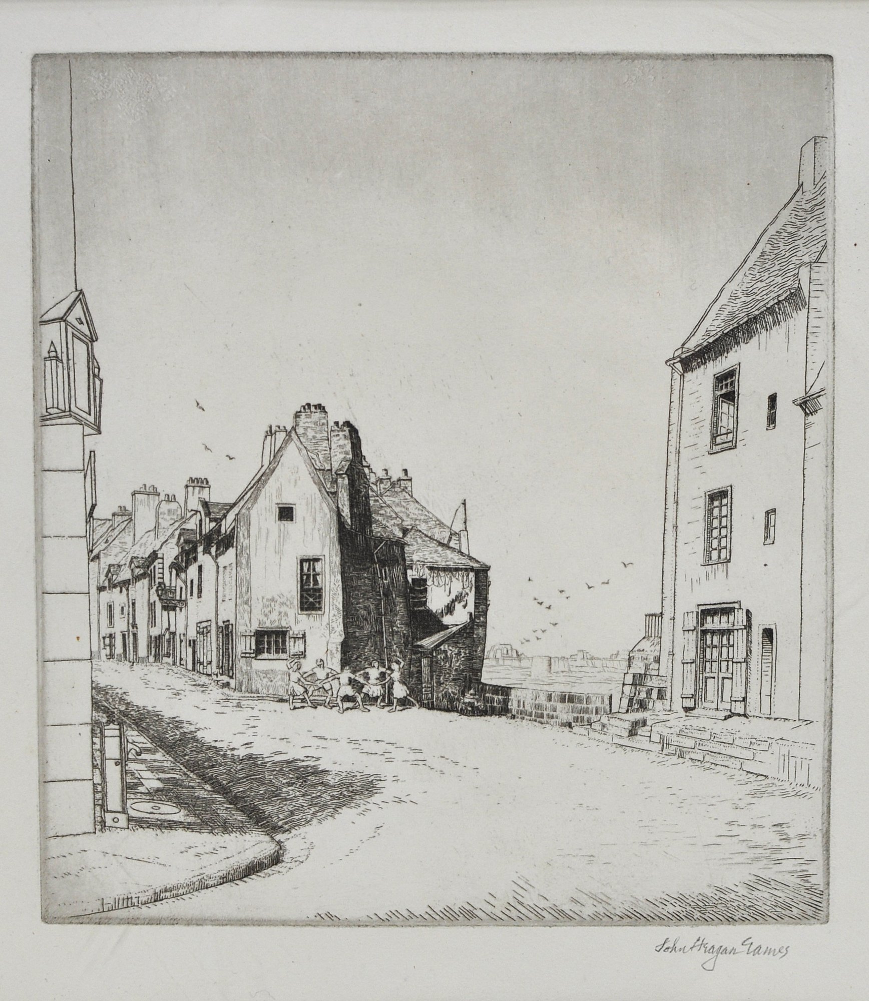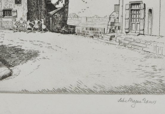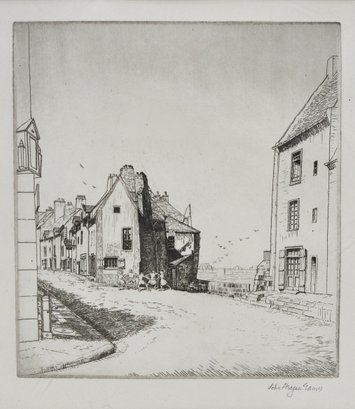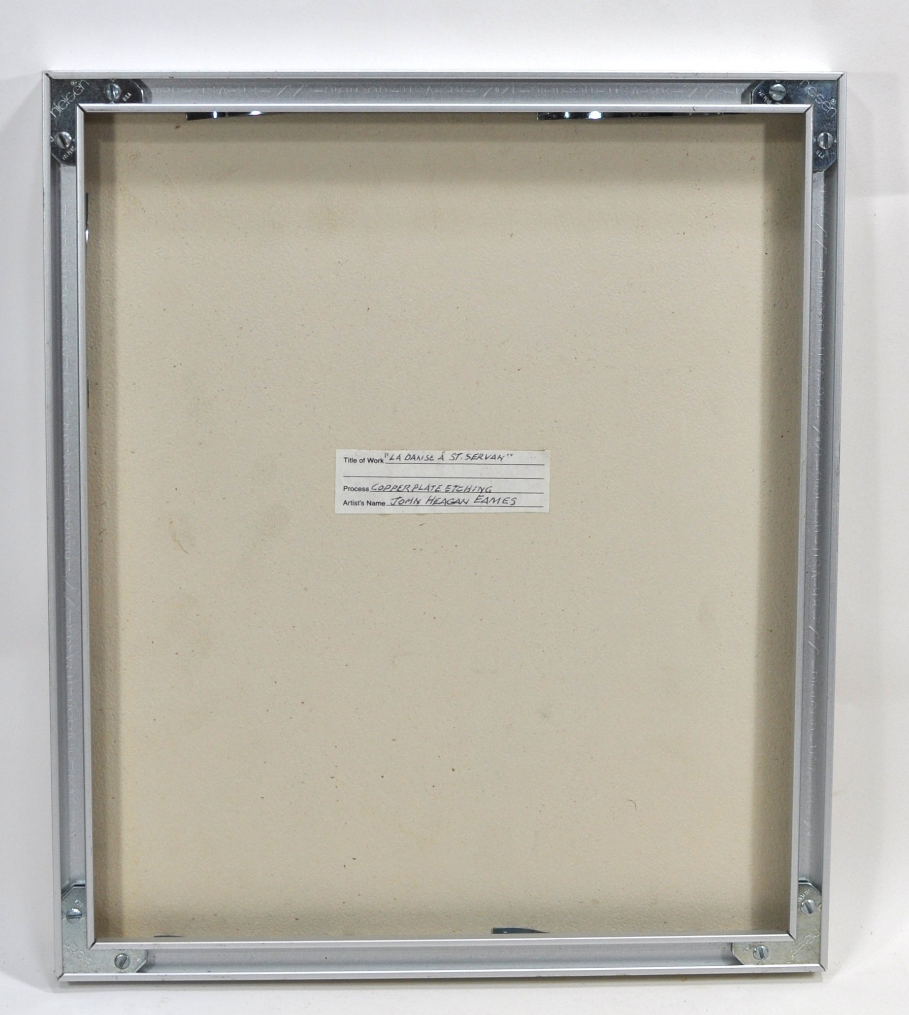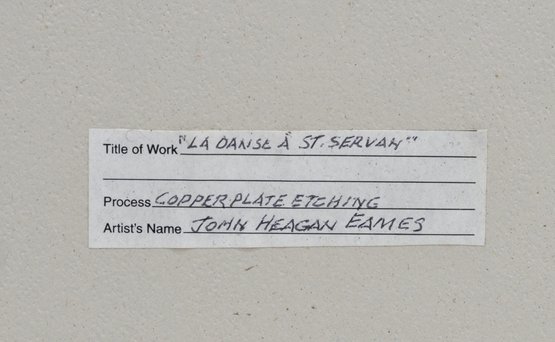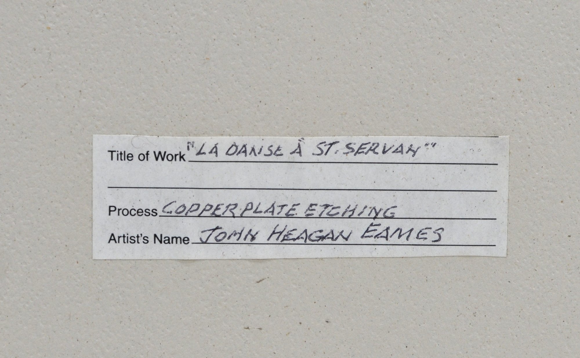 Original copper plate etching titled The Dance at St. Servan by John Heagan Eames (1900–2002). Finely executed street scene depicting a quiet European village with figures gathered along a waterfront road, rendered with delicate linework and tonal shading. Pencil signed by the artist in the lower right margin.