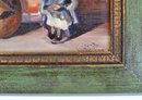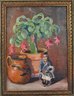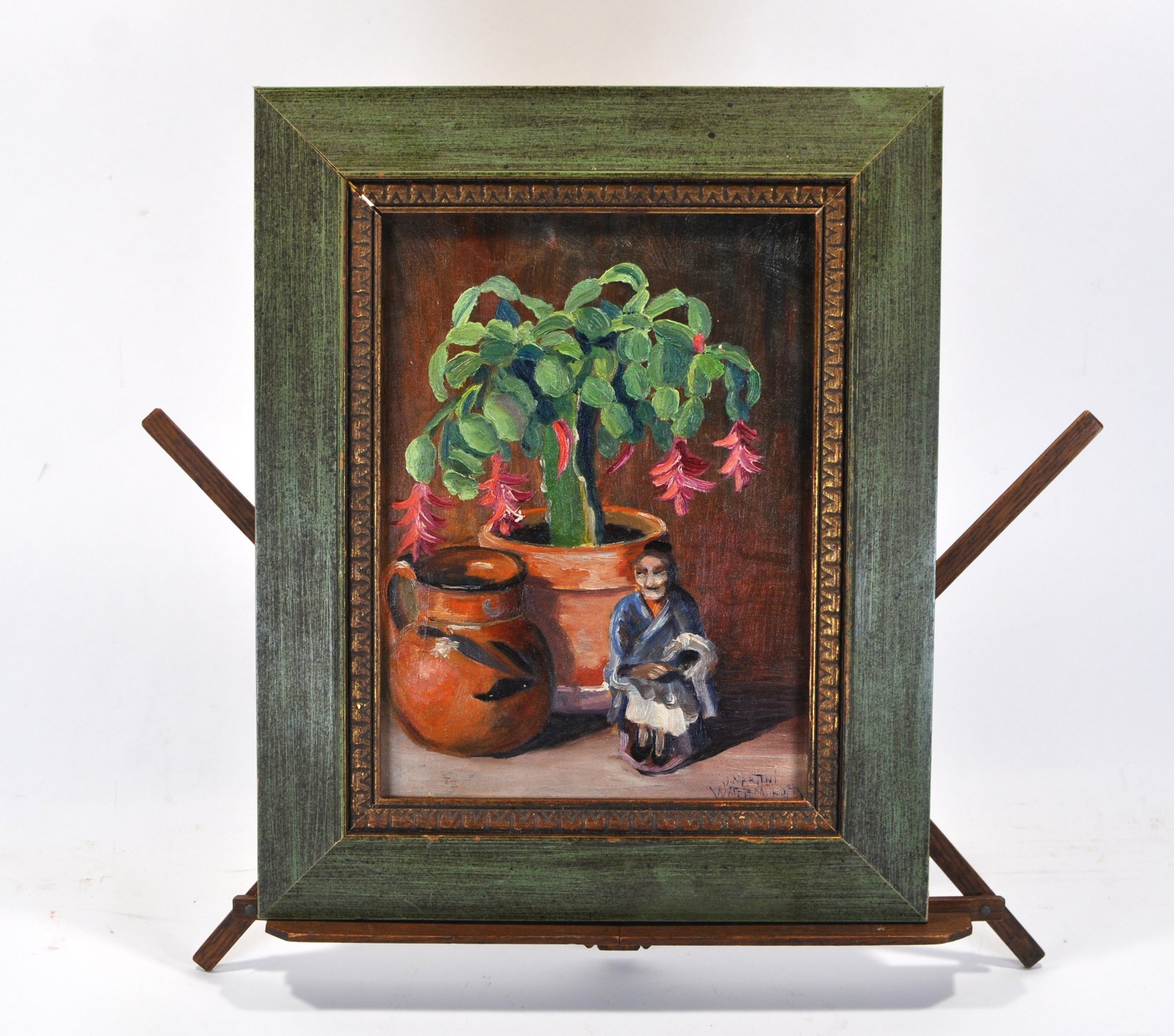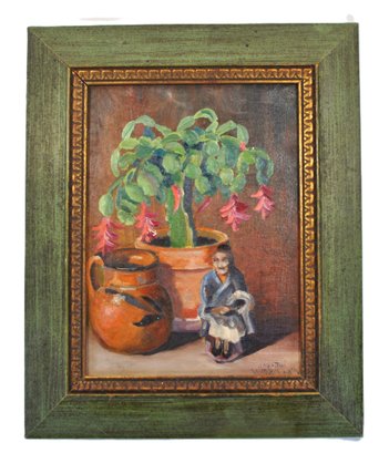 A delightful still life oil on board painting by a listed Dutch-American artist John Martini Watermulder (1916–2004) featuring a flowering Schlumbergera (Christmas cactus) in a terracotta pot, accompanied by an earthenware jug and a small seated figurine. Signed lower right.
