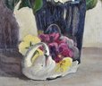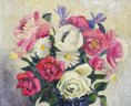 Original oil painting on board depicting a colorful floral still life with roses, daisies, and blossoms in a dark vase, accompanied by a white swan figurine. Executed in expressive brushwork with warm tonal background.