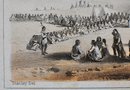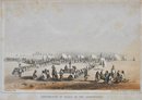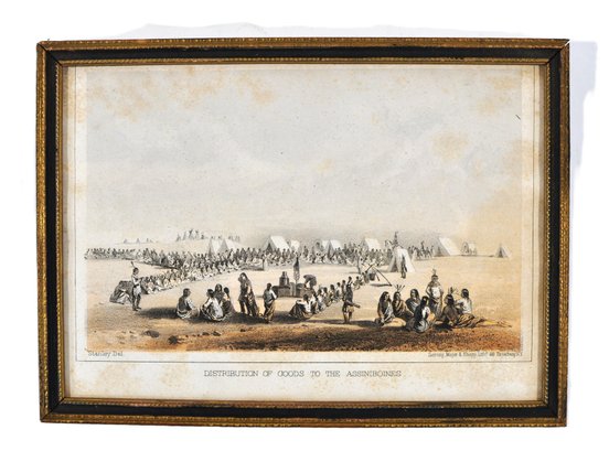 19th-century hand-colored lithograph titled Distribution of Goods to the Assiniboines, depicting a U.S. government annuity or treaty distribution scene among the Assiniboine (Nakoda) people.