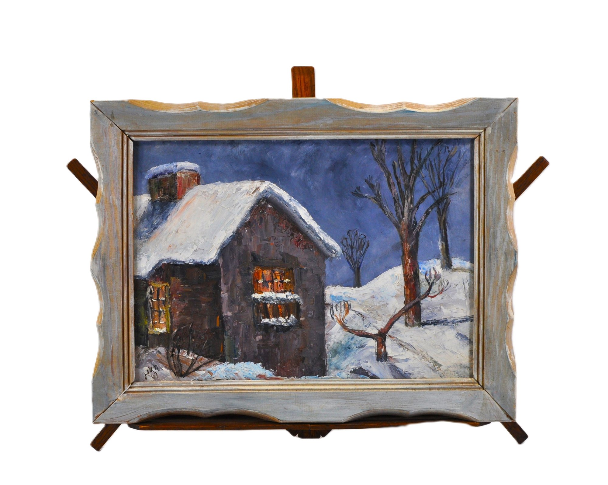 Charming vintage oil painting on artist panel depicting a snow-covered Vermont cottage glowing warmly under a moonlit winter sky.Signed and dated “John 67” at lower left.