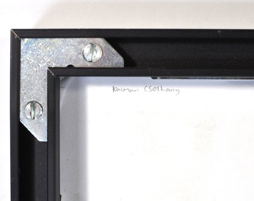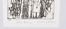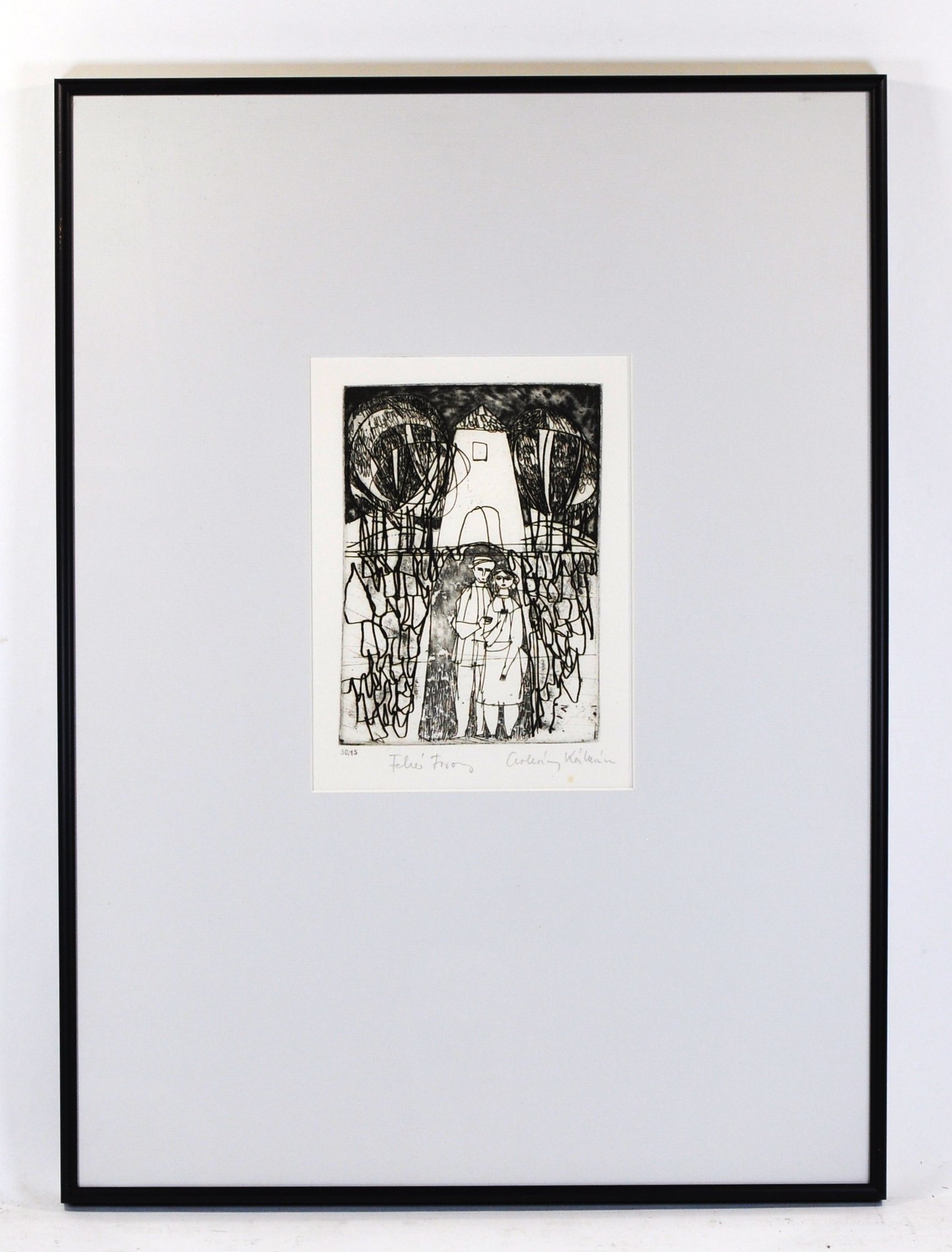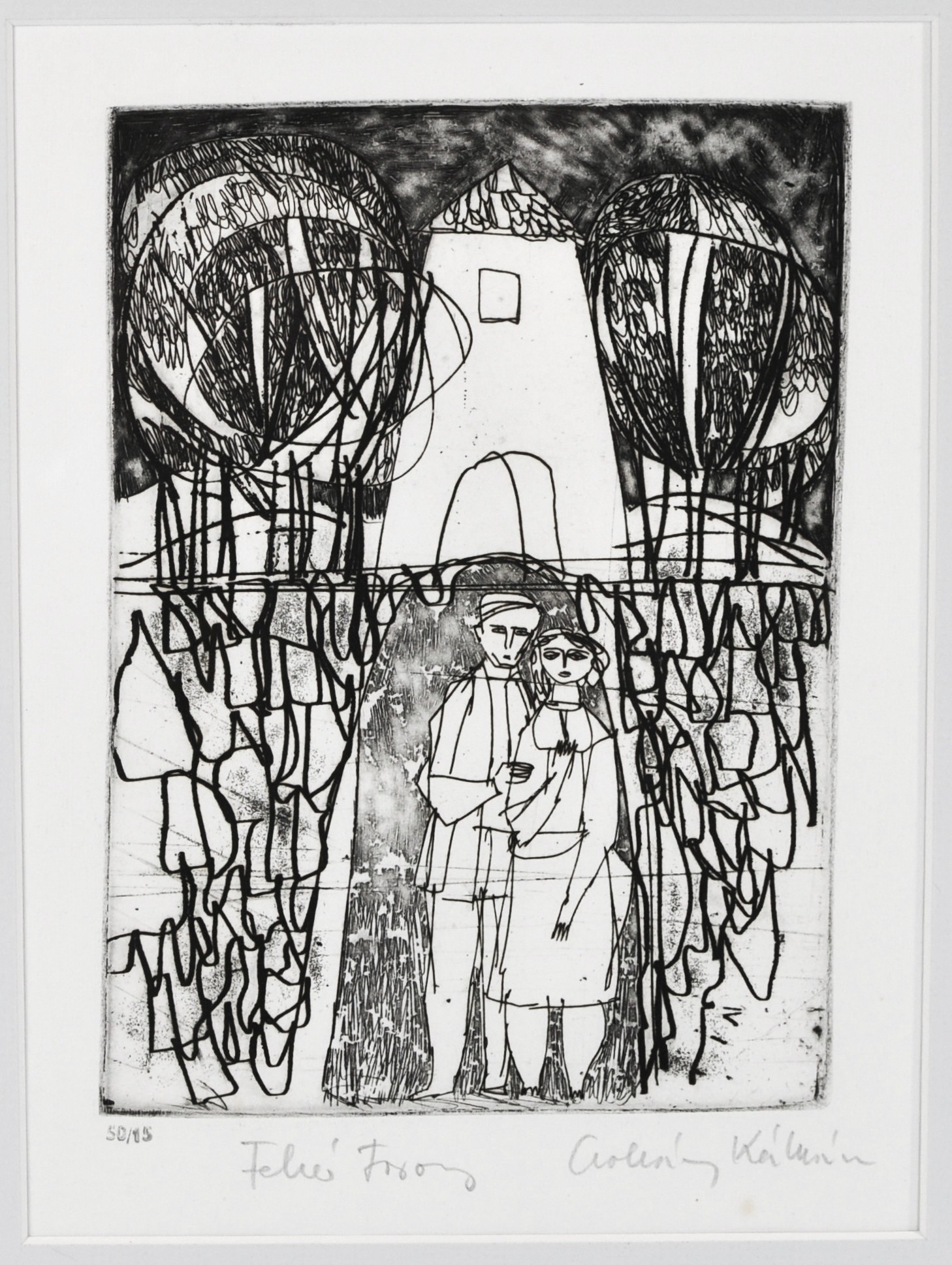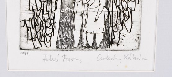 Original signed etching titled "White Tower" by Kálmán Csohány, a noted Hungarian graphic artist and illustrator. The composition depicts a stylized figurative scene beneath a tall white tower, framed by abstracted trees and expressive linear forms—characteristic of Csohány’s modernist graphic style.