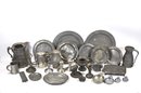 Extensive assortment of antique and vintage pewter items including chargers, plates, mugs, pitchers, candlesticks, salts, porringers, and trivets. Makers include marked examples by Shoreditch of London and others. Many pieces show age-related patina, oxidation, surface wear, repairs and dents .