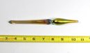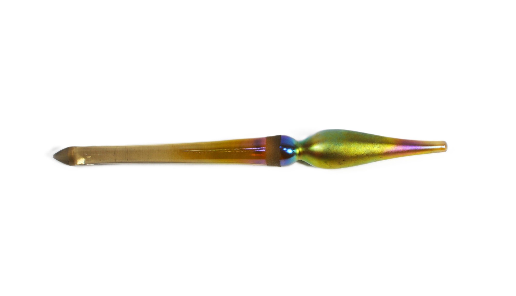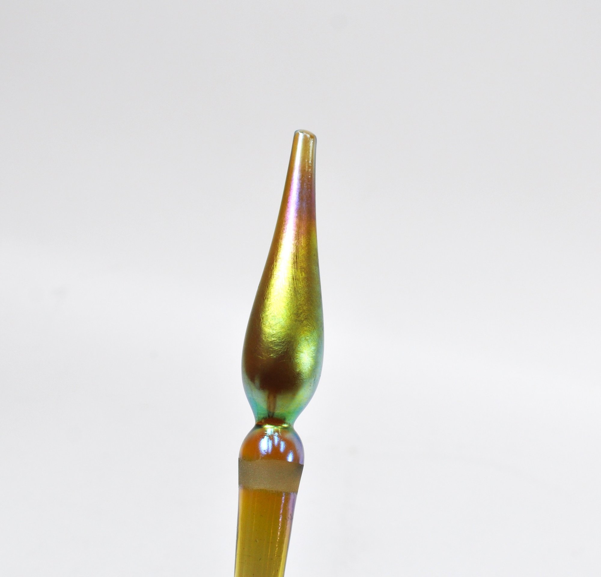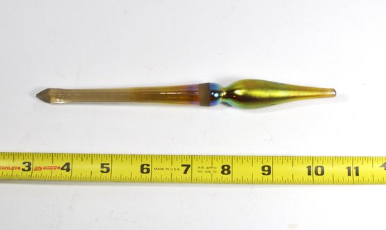 Hand-blown iridescent art glass stopper with an elongated tapered shaft and bulbous form, finished in shimmering gold, green, and violet tones. Likely intended for a decanter or decorative vessel.