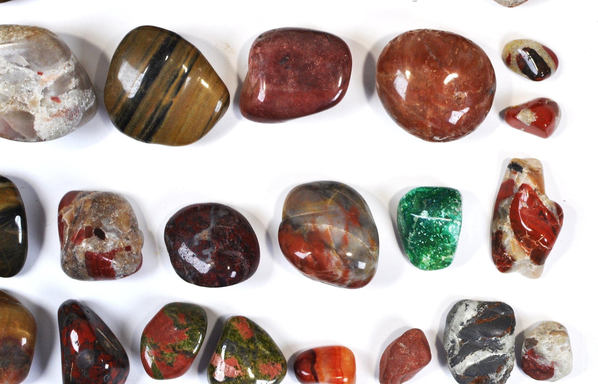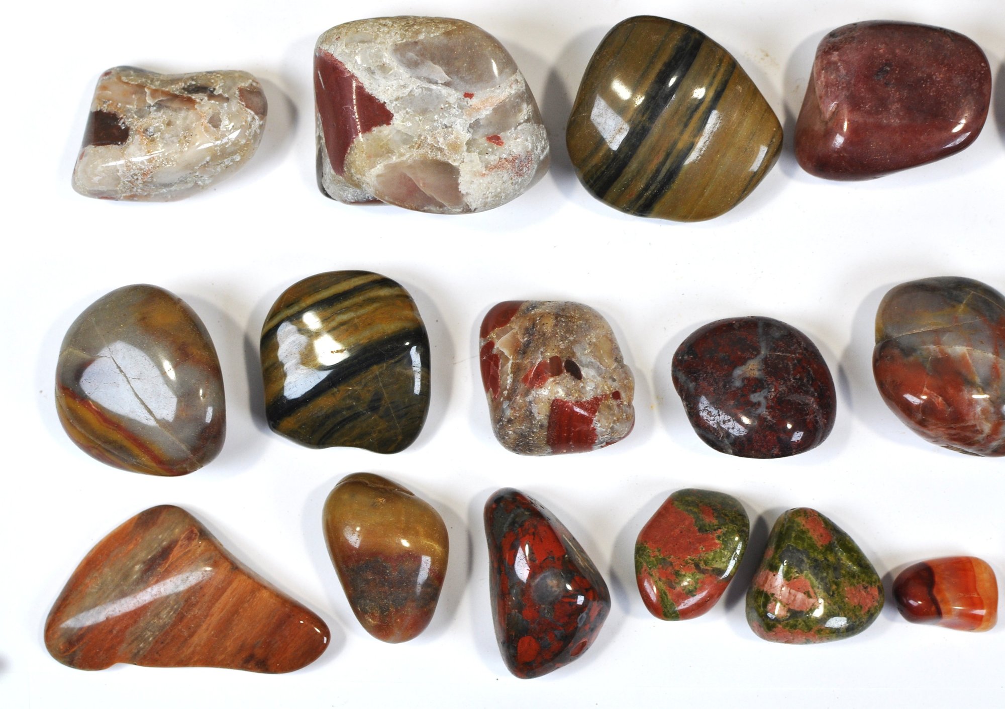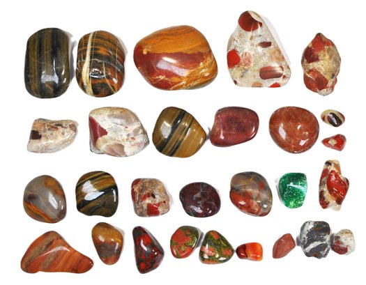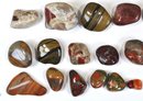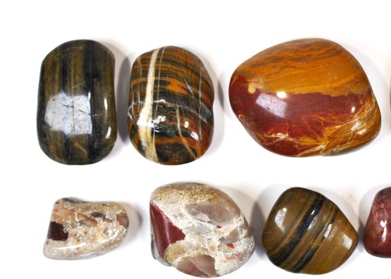 Offered is a large mixed lot of polished stones and tumbled gemstones in a wide variety of colors, patterns, and sizes. The group includes attractive examples of banded and brecciated jaspers, tiger’s eye–type stones, red and multicolor agates, and other decorative lapidary materials, along with a few partially natural pieces. Stones range from small tumbled specimens to larger palm-size pieces, all with a smooth, glossy polish highlighting their natural patterns.