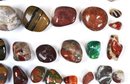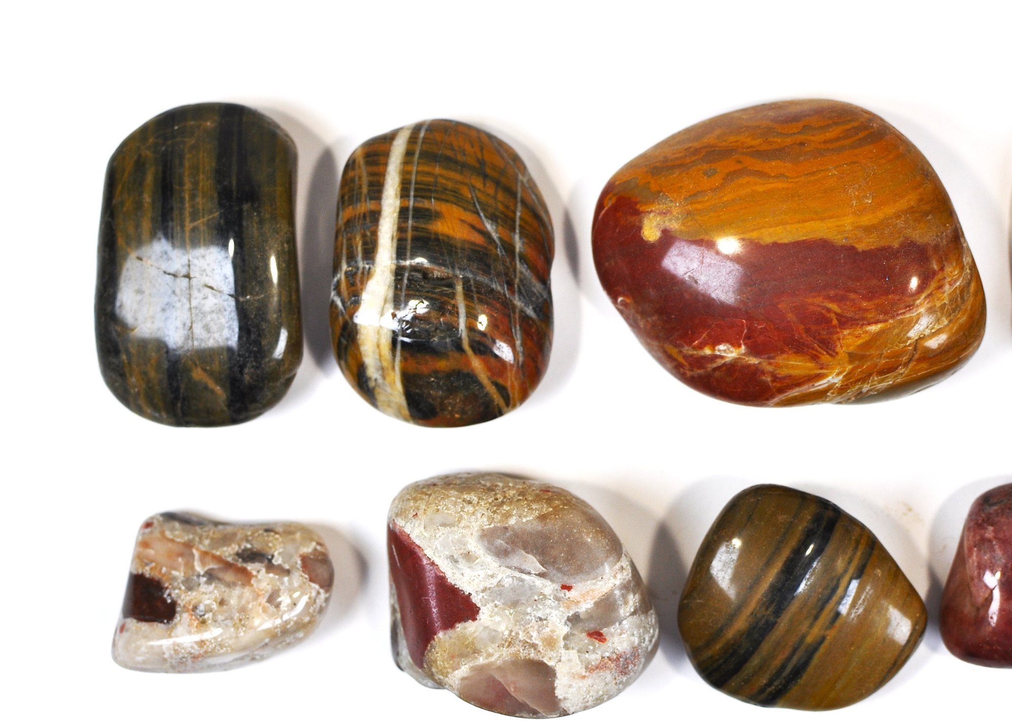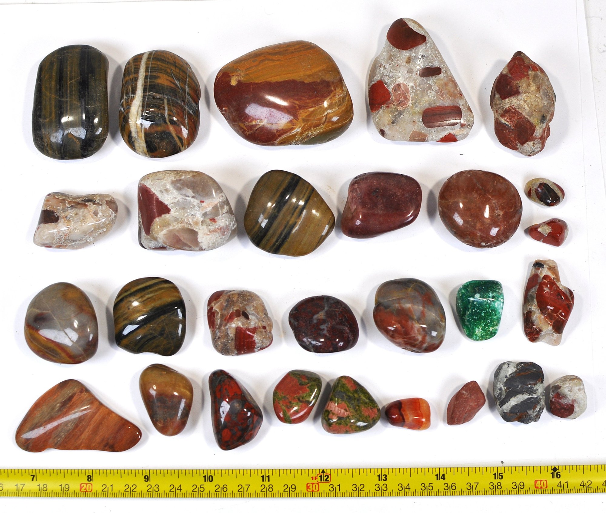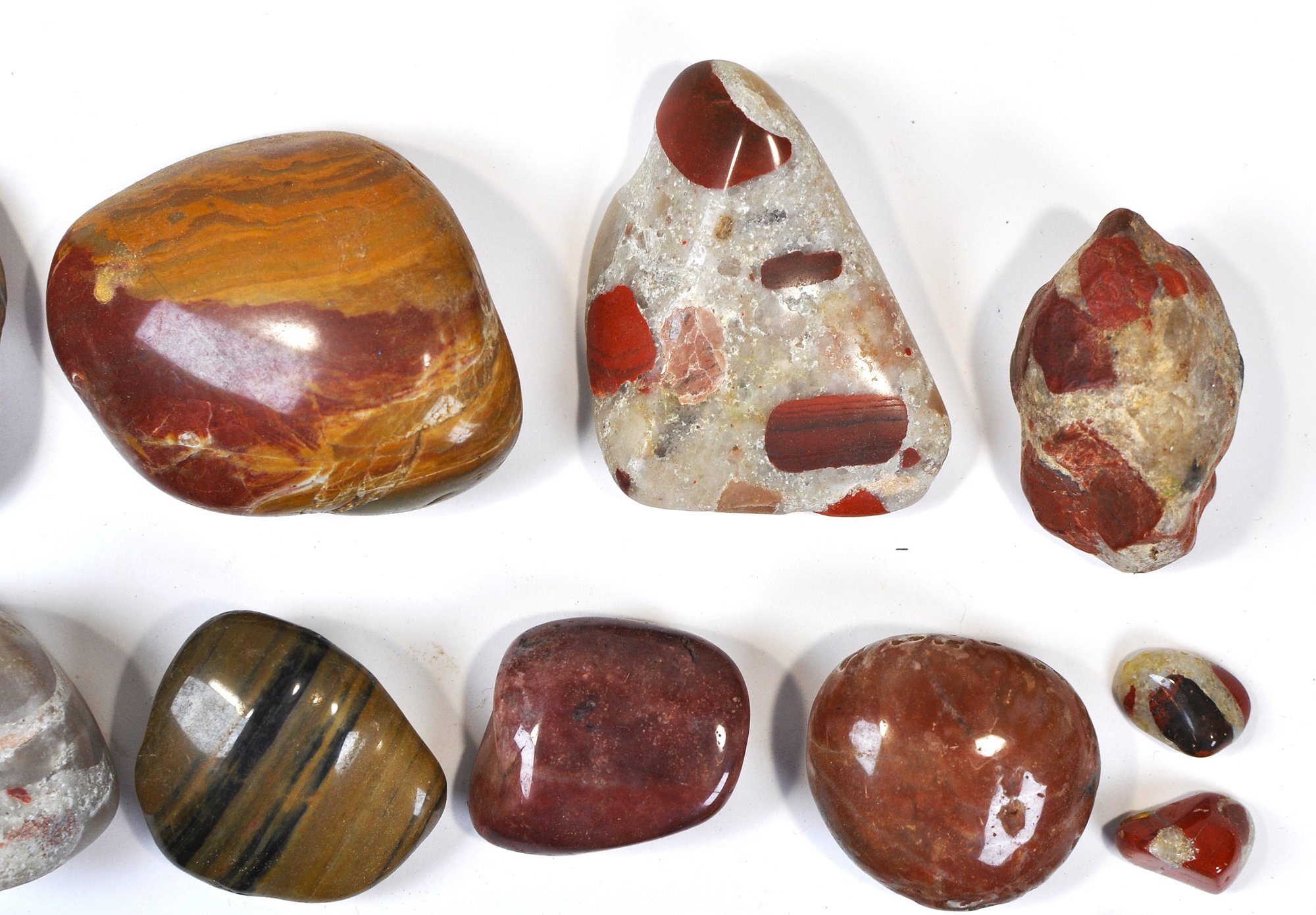 Offered is a large mixed lot of polished stones and tumbled gemstones in a wide variety of colors, patterns, and sizes. The group includes attractive examples of banded and brecciated jaspers, tiger’s eye–type stones, red and multicolor agates, and other decorative lapidary materials, along with a few partially natural pieces. Stones range from small tumbled specimens to larger palm-size pieces, all with a smooth, glossy polish highlighting their natural patterns.