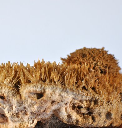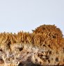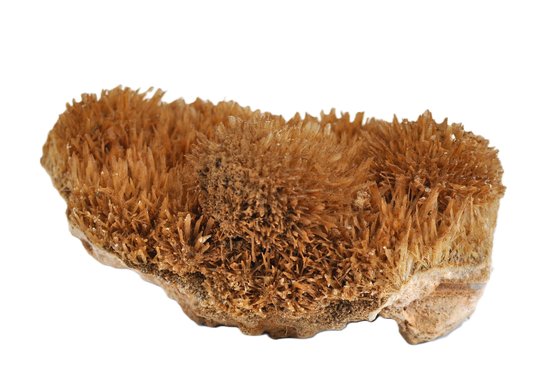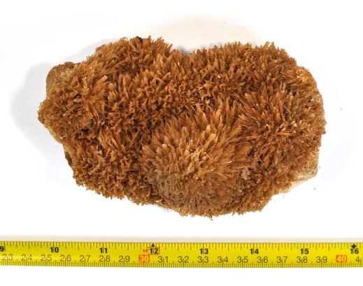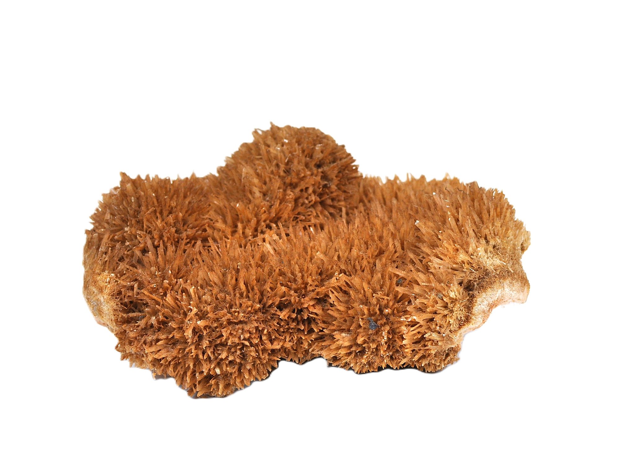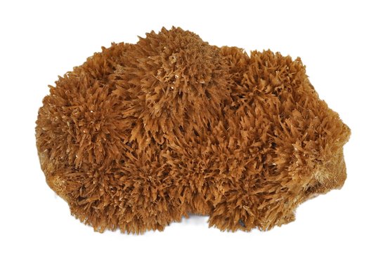 Natural mineral specimen featuring a dense cluster of orange to amber calcite crystals with sharp, radiating scalenohedral forms. This growth habit is commonly referred to in the mineral trade as “spiked dogtooth” or “coral orange” calcite. The warm coloration is typical of calcite influenced by iron minerals.