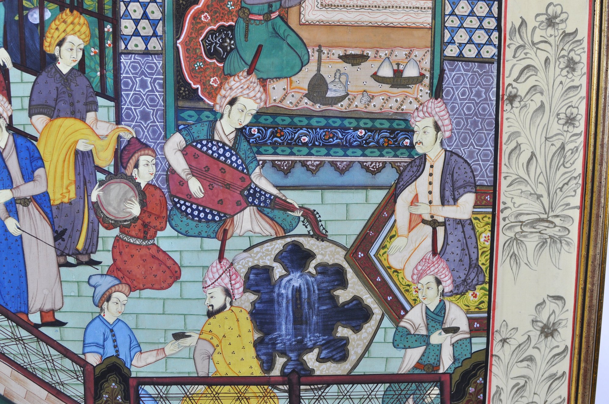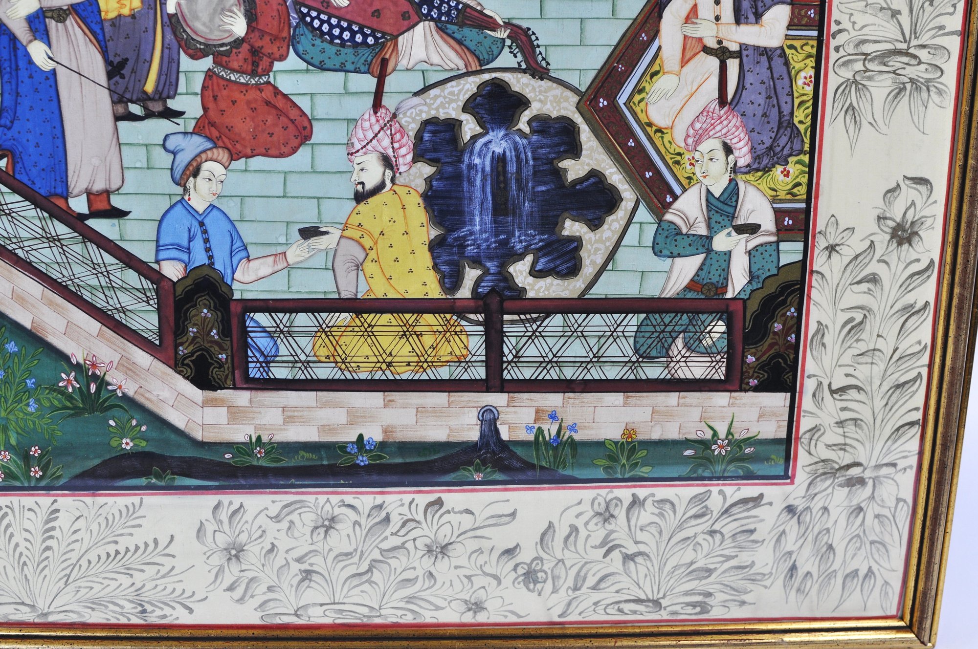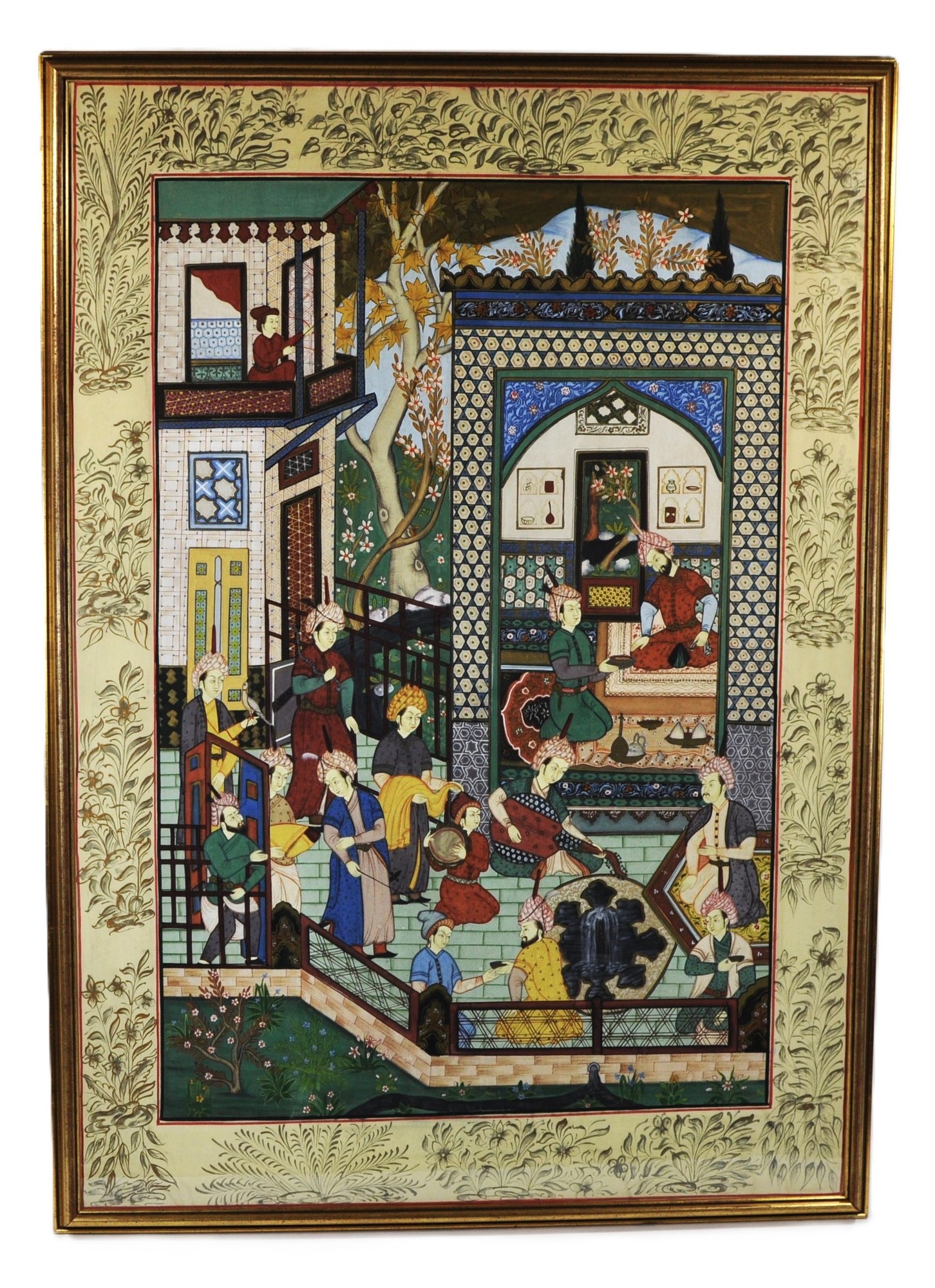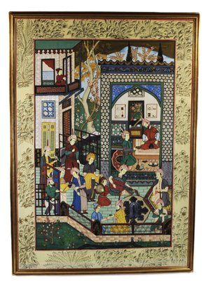Impressive large framed Indo-Persian Mughal-style painting depicting an elaborate royal court scene filled with finely dressed figures, attendants, and musicians set among ornate palace architecture and lush garden elements. Executed in traditional miniature technique with vibrant pigments and gold detailing, the composition showcases the elegance and storytelling associated with Mughal workshop art.