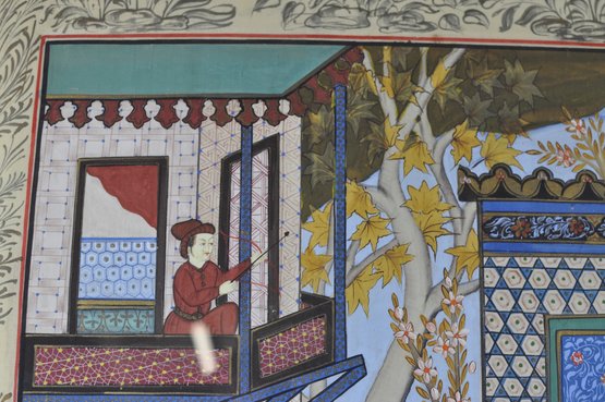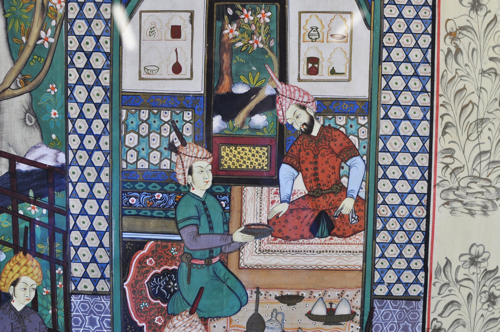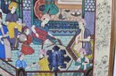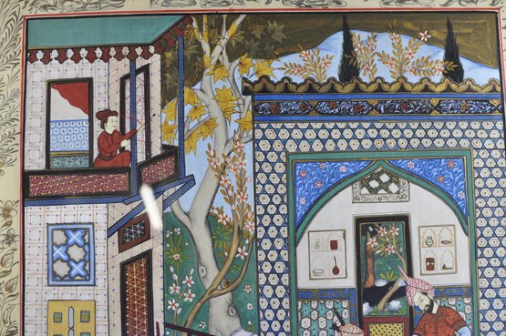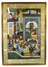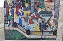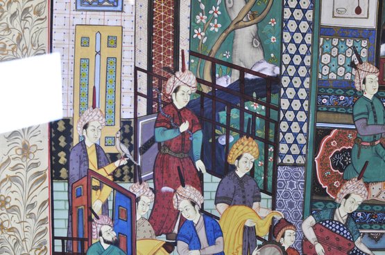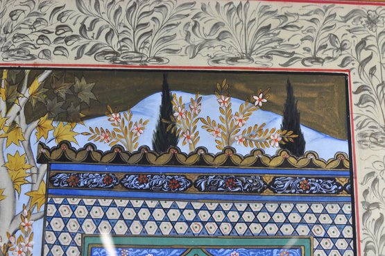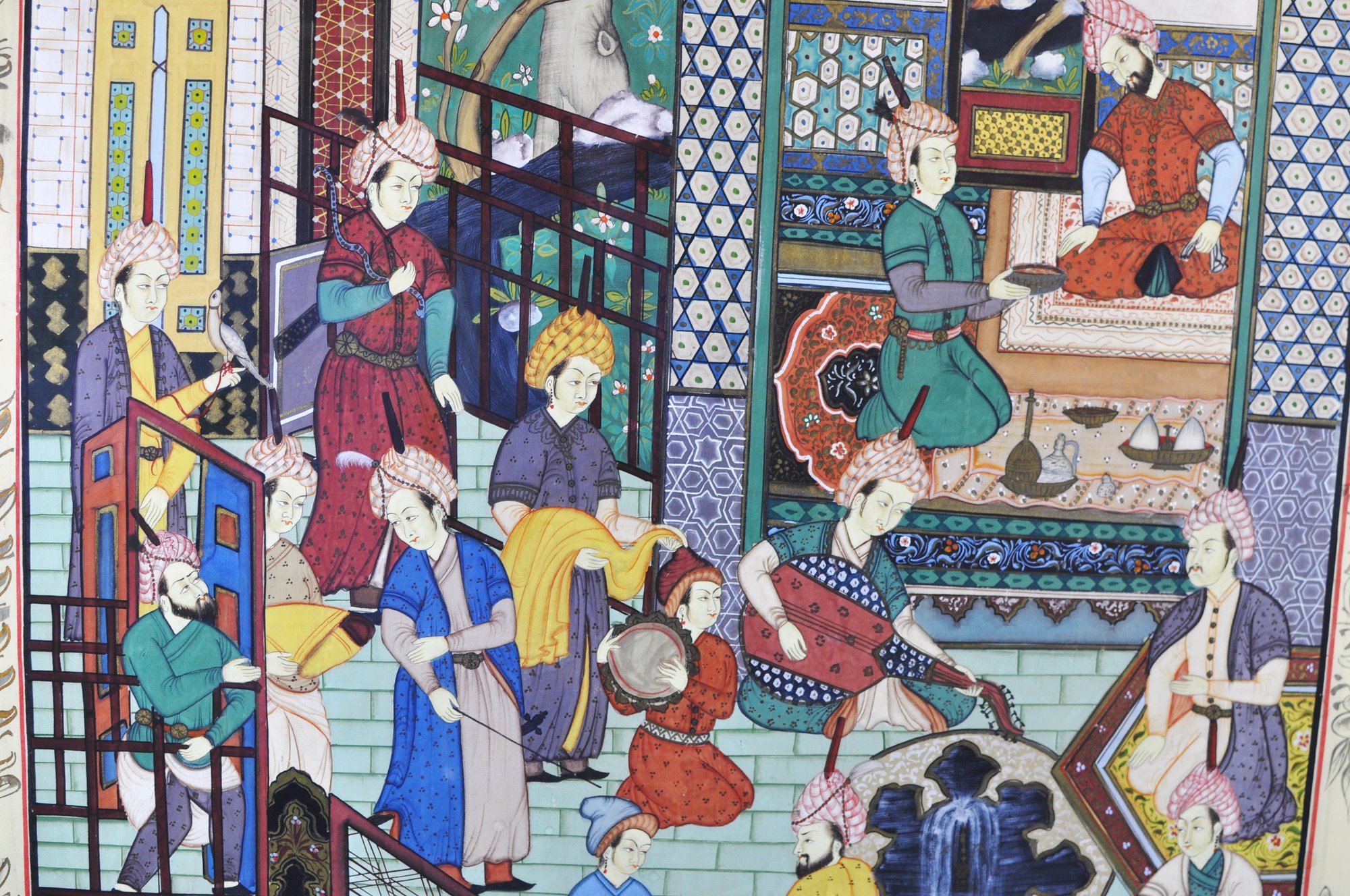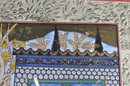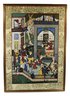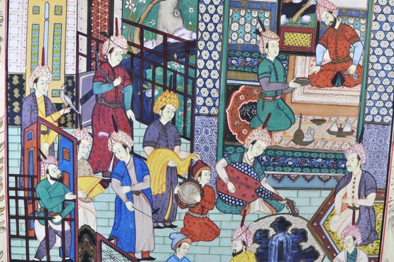 Impressive large framed Indo-Persian Mughal-style painting depicting an elaborate royal court scene filled with finely dressed figures, attendants, and musicians set among ornate palace architecture and lush garden elements. Executed in traditional miniature technique with vibrant pigments and gold detailing, the composition showcases the elegance and storytelling associated with Mughal workshop art.