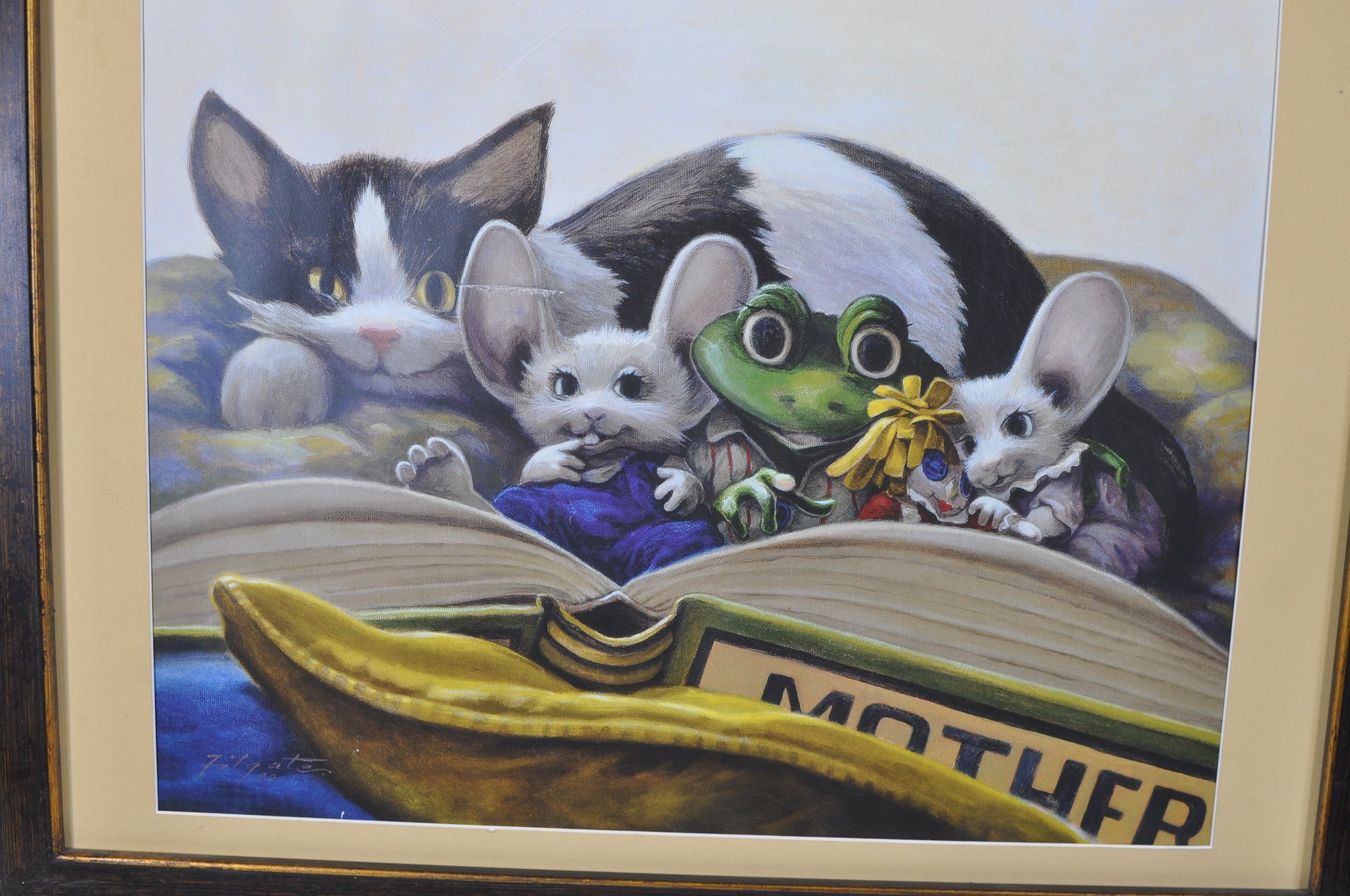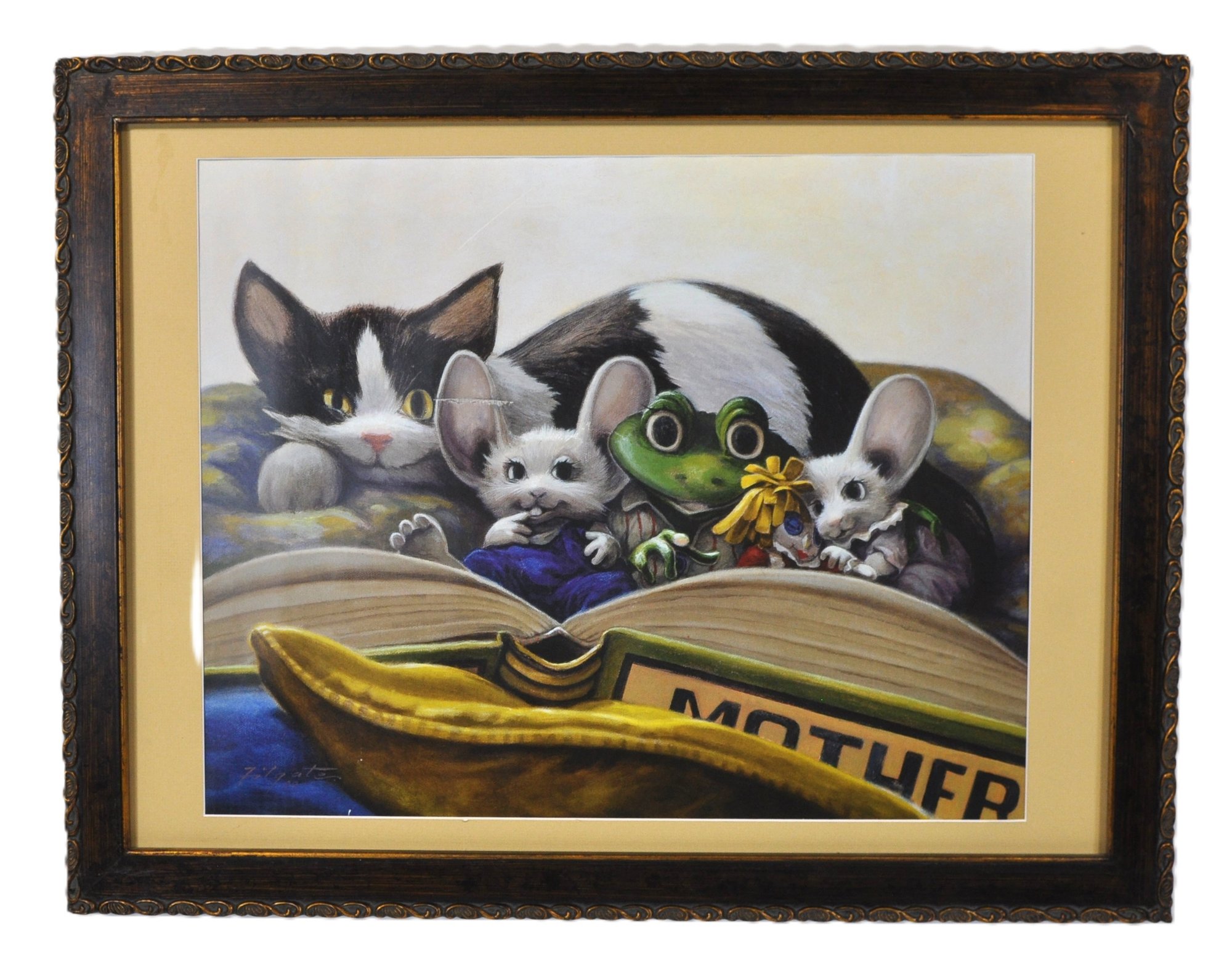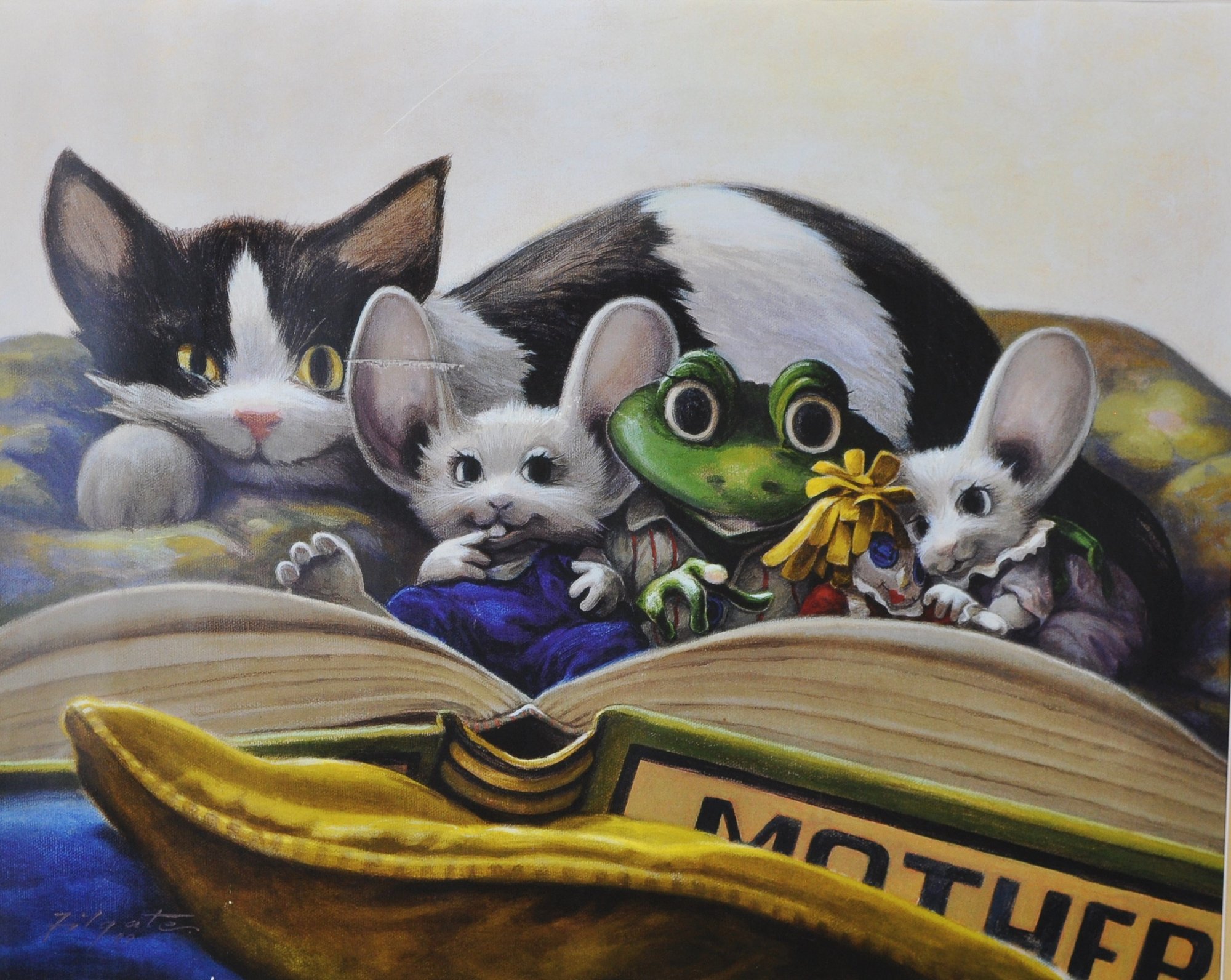 Charming limited edition “Rip Squeak – Bedtime Stories” giclée print by artist Leonard Filgate, known for the beloved Rip Squeak children’s books. The whimsical scene depicts a cozy storytelling moment with animal characters gathered around an open book, including the familiar mouse character Rip Squeak and friends.