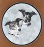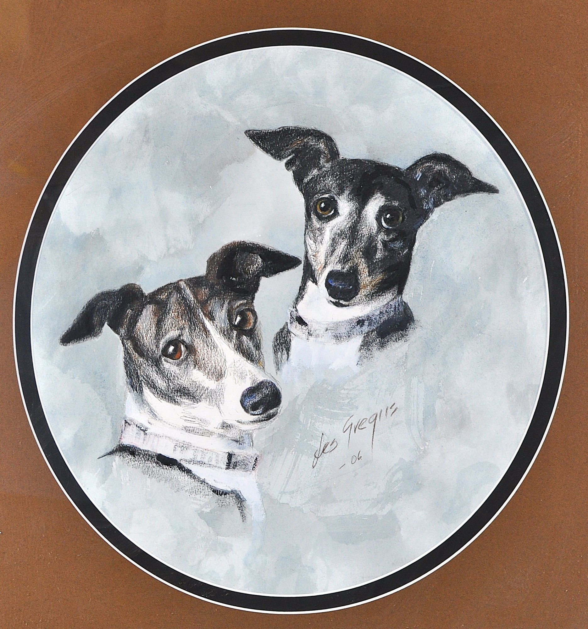 Charming 2006 mixed media portrait of two dogs by artist Les Gregus rendered with expressive realism and fine detail. Signed and dated lower center. Presented in a round mat with a bronzed frame under glass by Ocala Art & Frame.