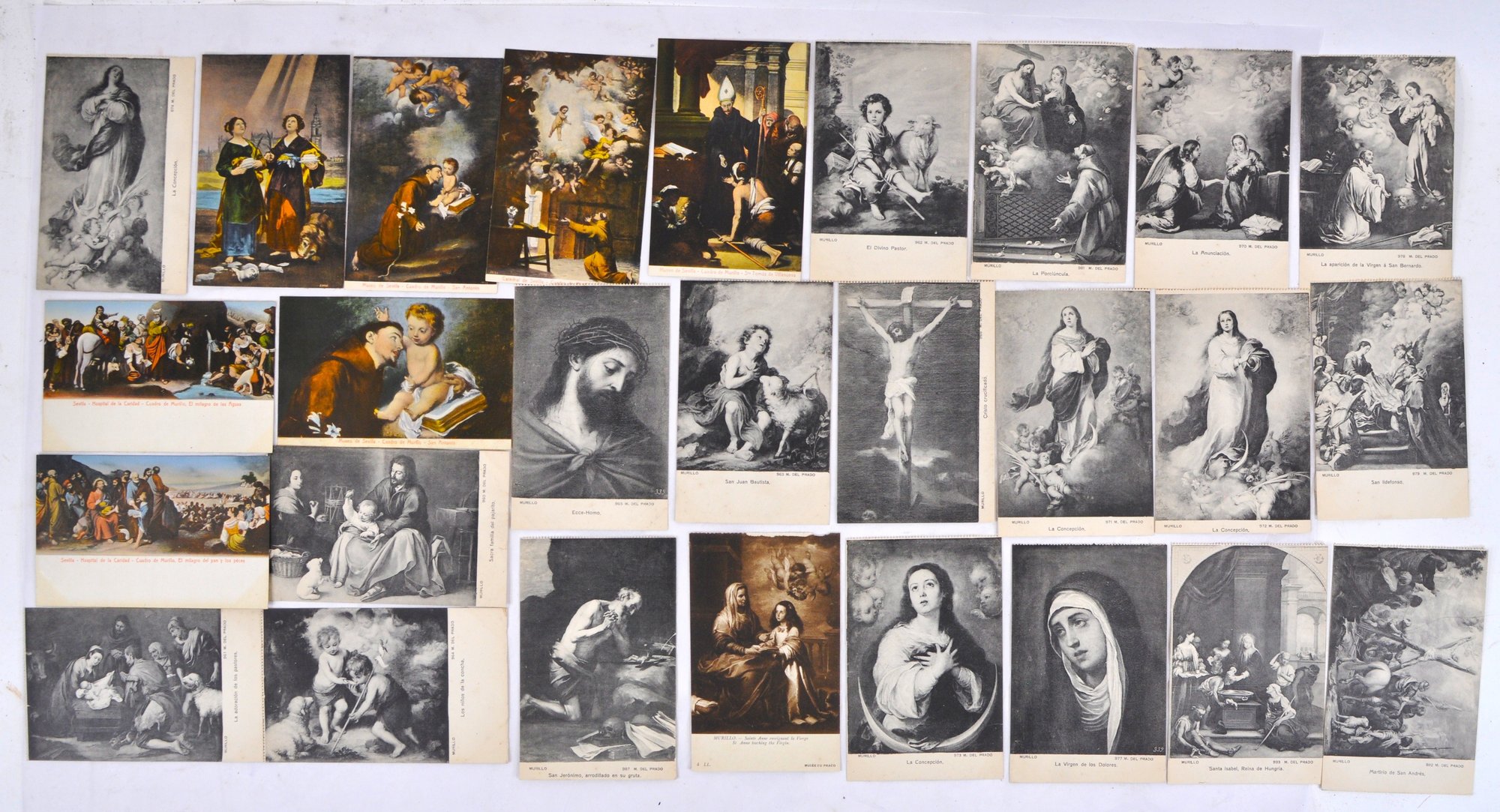 Collection of vintage Spanish art postcards depicting religious scenes, primarily after works by Bartolomé Esteban Murillo and other Old Masters. Includes pieces published in Madrid and Seville, some marked “Museo del Prado.