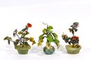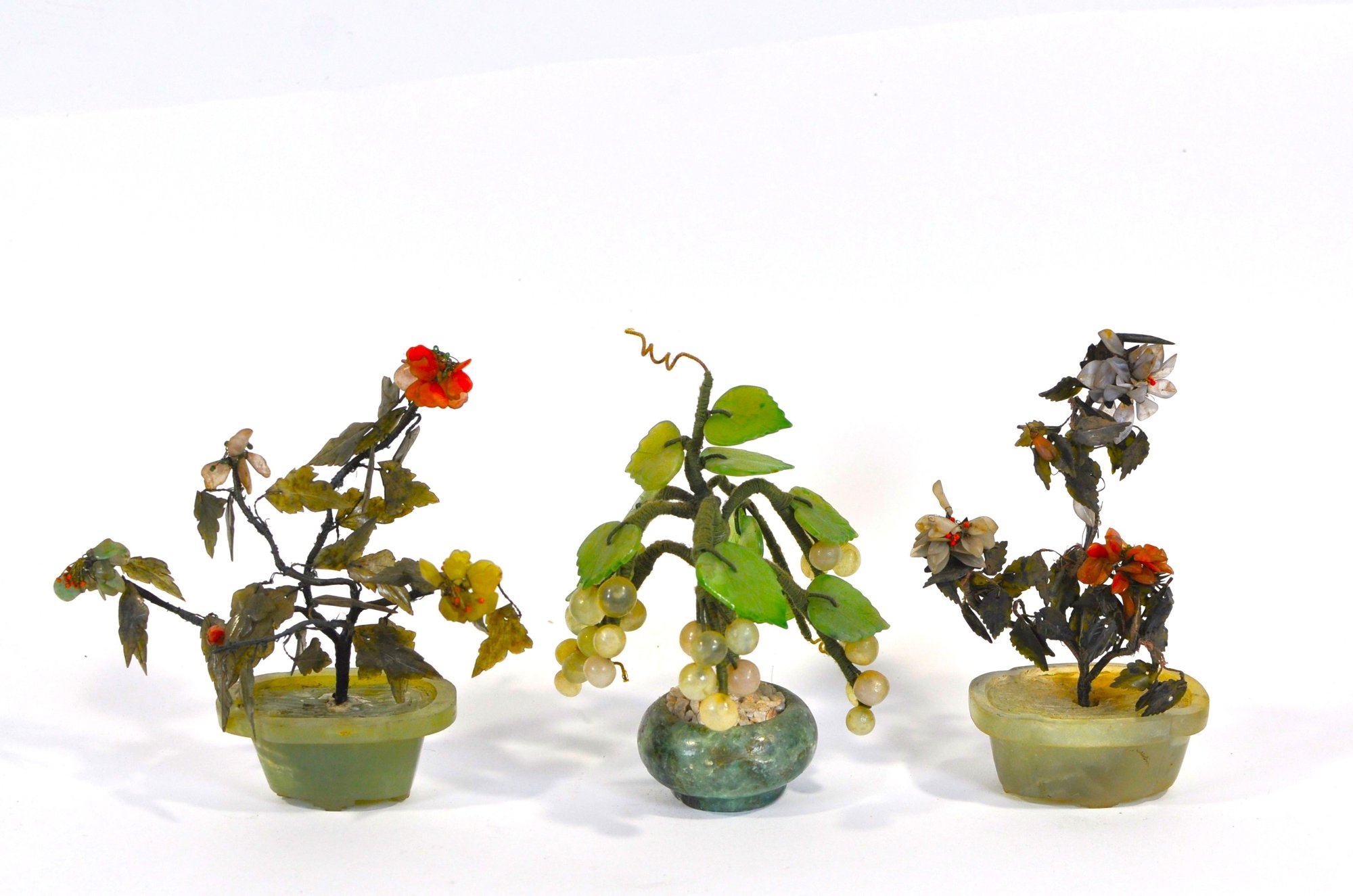 Charming group of three vintage Chinese hard-stone miniature bonsai plants. Each features hand-carved stone flowers, fruits, and leaves mounted on wire branches, set into carved stone pots. Includes two flowering trees with multicolor blossoms and one grape cluster tree with pale jade-like beads.