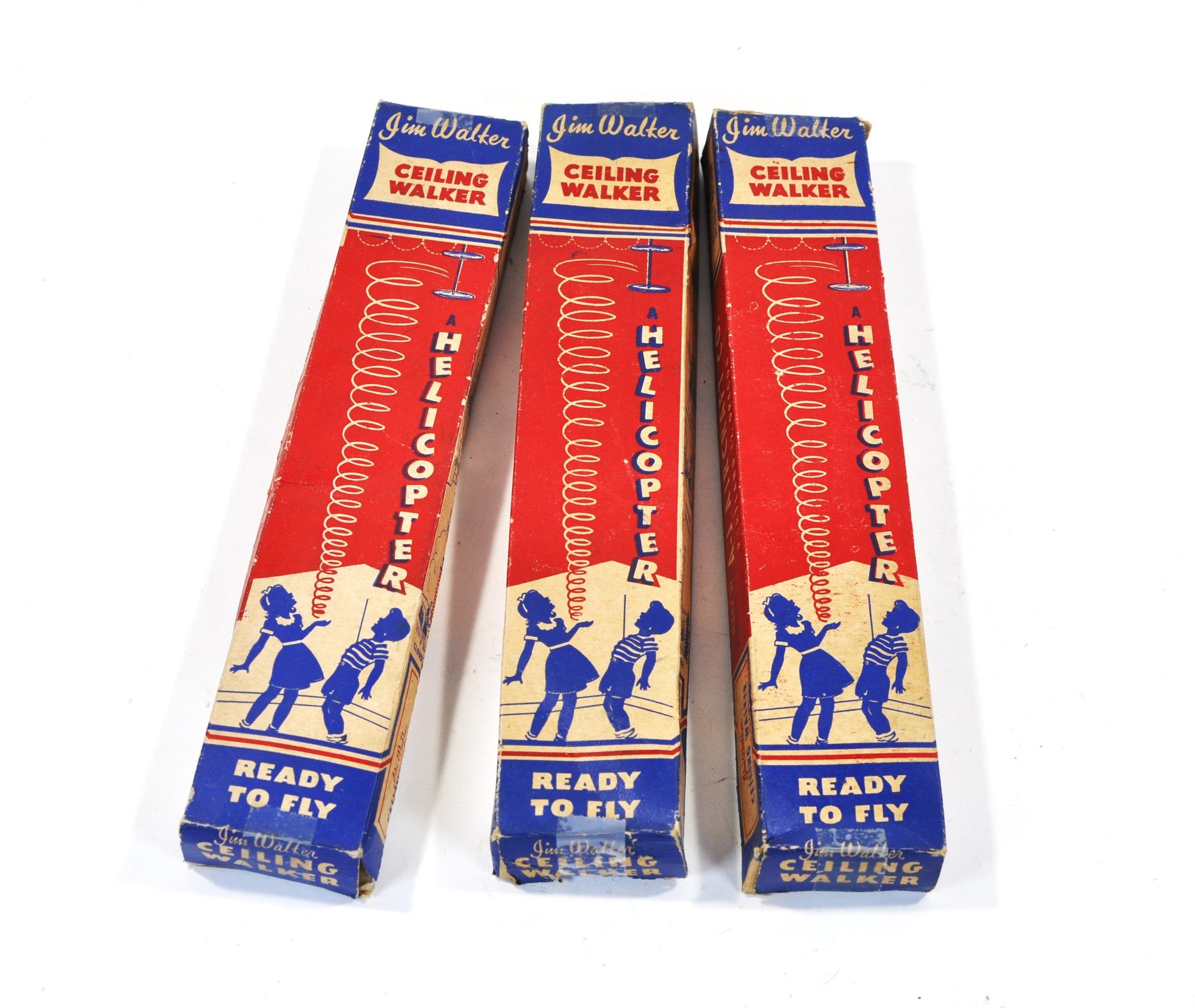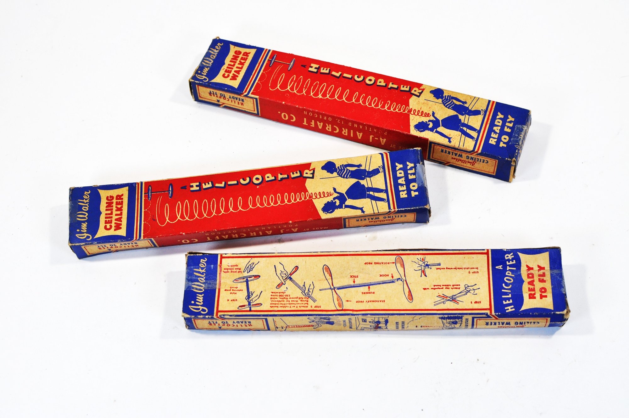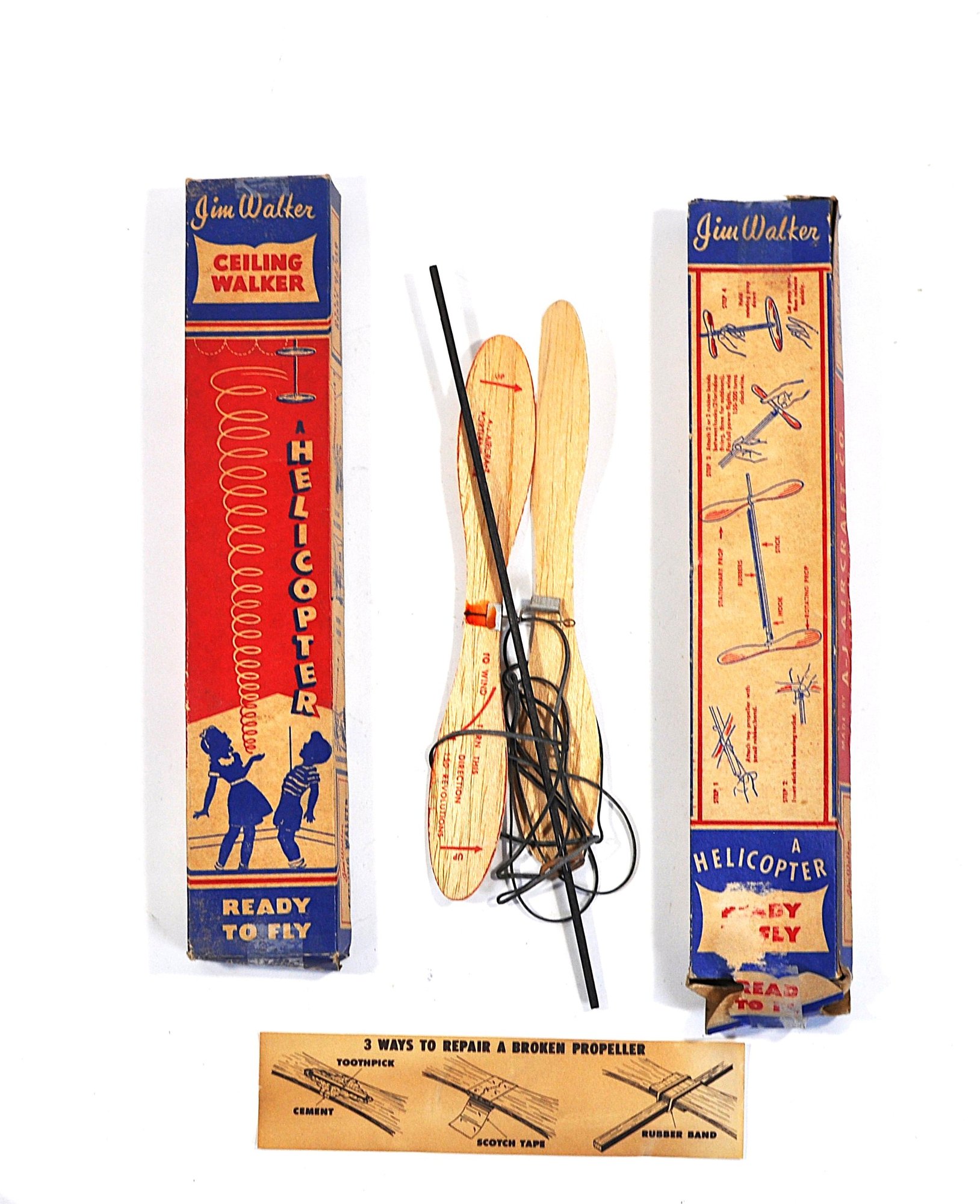 Rubber-band powered wooden helicopters by Jim Walker, A-J Aircraft Co., Portland, Oregon.