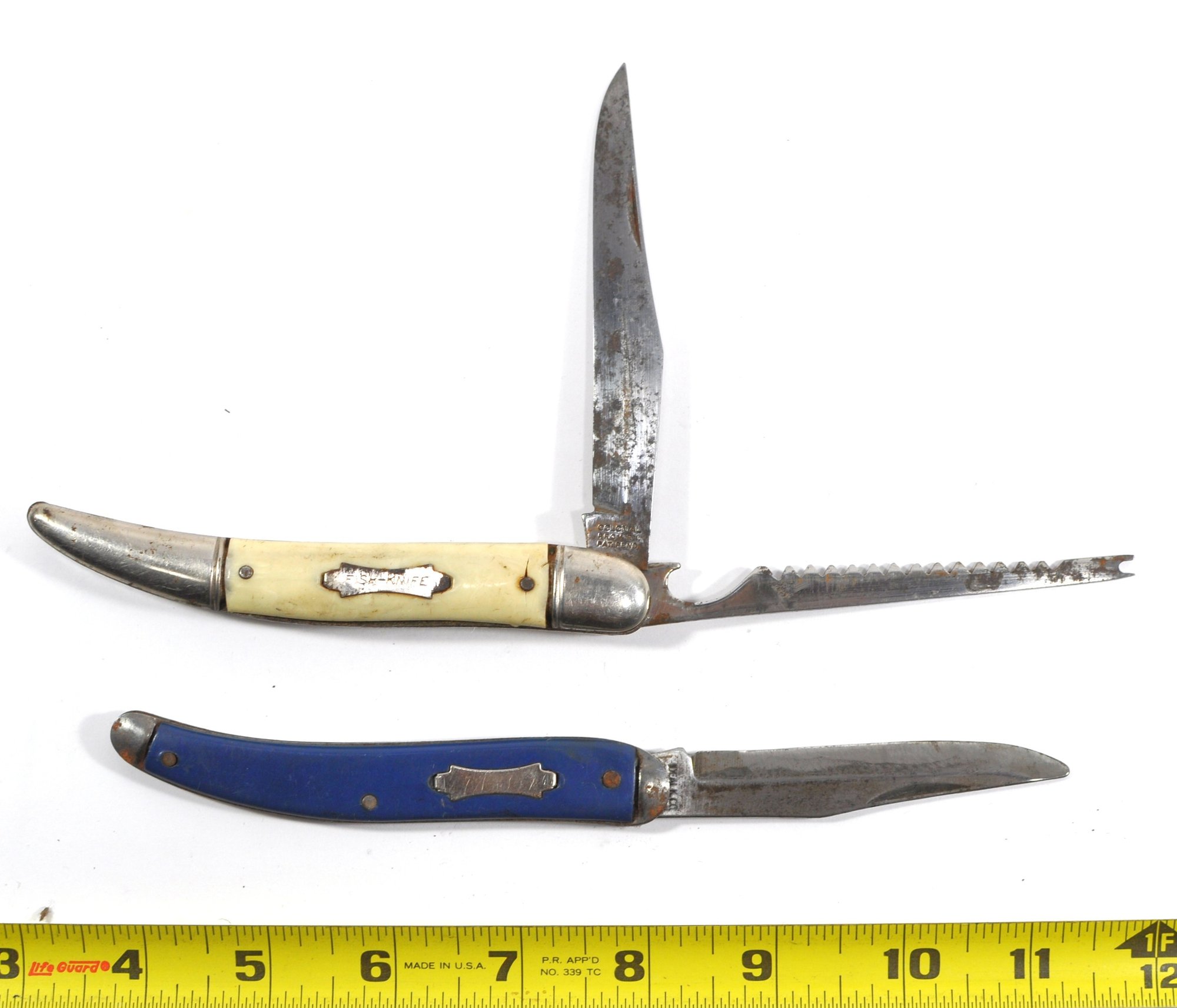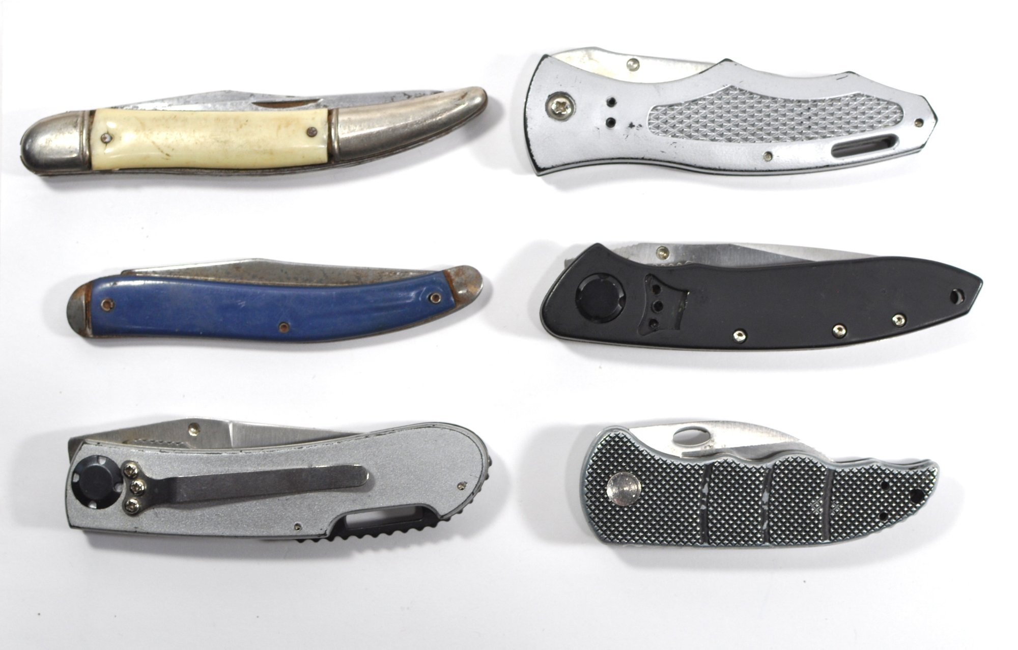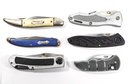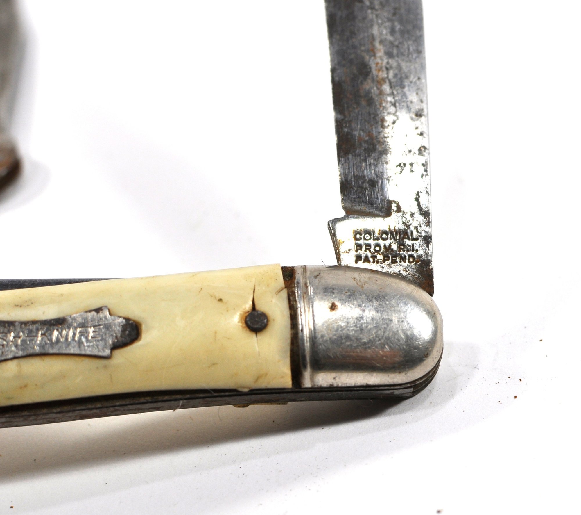 Mixed condition overall. Vintage knives show expected age wear, spotting, patina, and some corrosion. Modern knives show light to moderate use wear. All blades open and close; mechanical strength and sharpness not tested. Sold as a mixed lot.