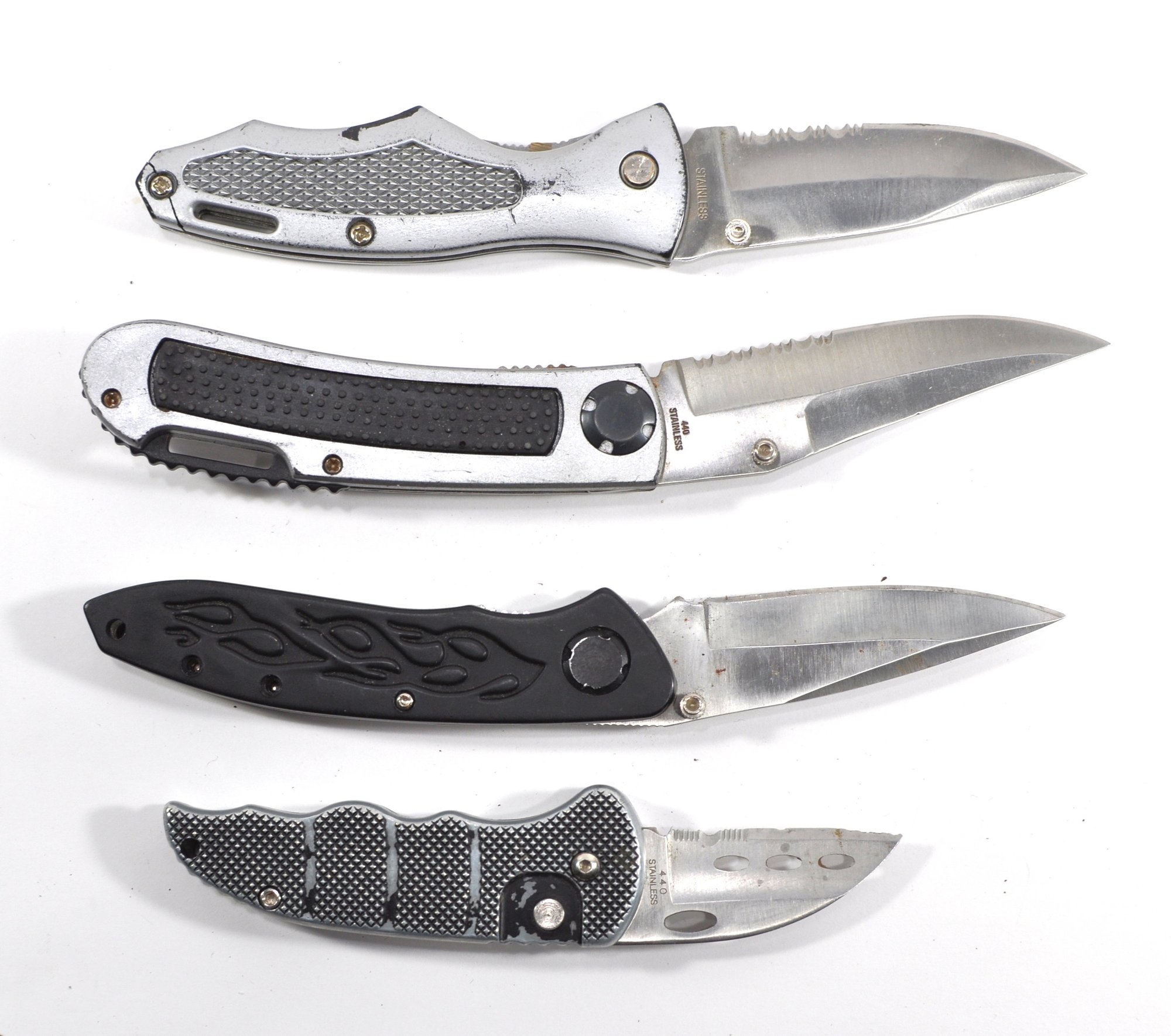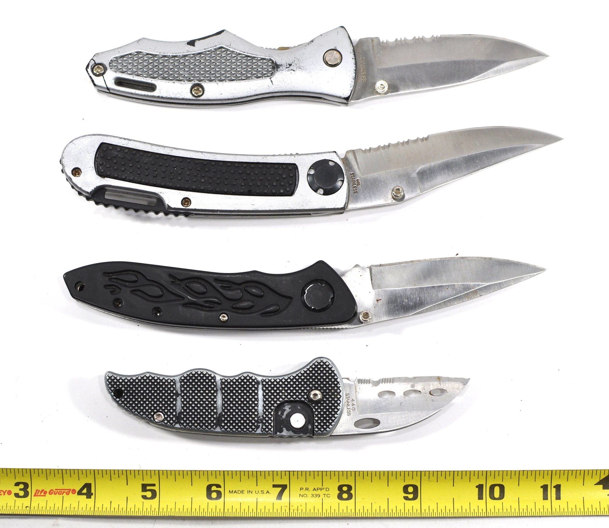 Group lot of assorted folding pocket knives, including vintage American-made examples and later modern utility knives. Last knife in the lot features a spring-assisted opening mechanism.