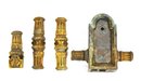 Includes three fluted column-form halves with detailed Neoclassical ornament and one arched backplate mount with two side extensions. Beautiful original gilt surfaces with age-appropriate patina and oxidation. Ideal for restoration or use as decorative elements.