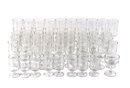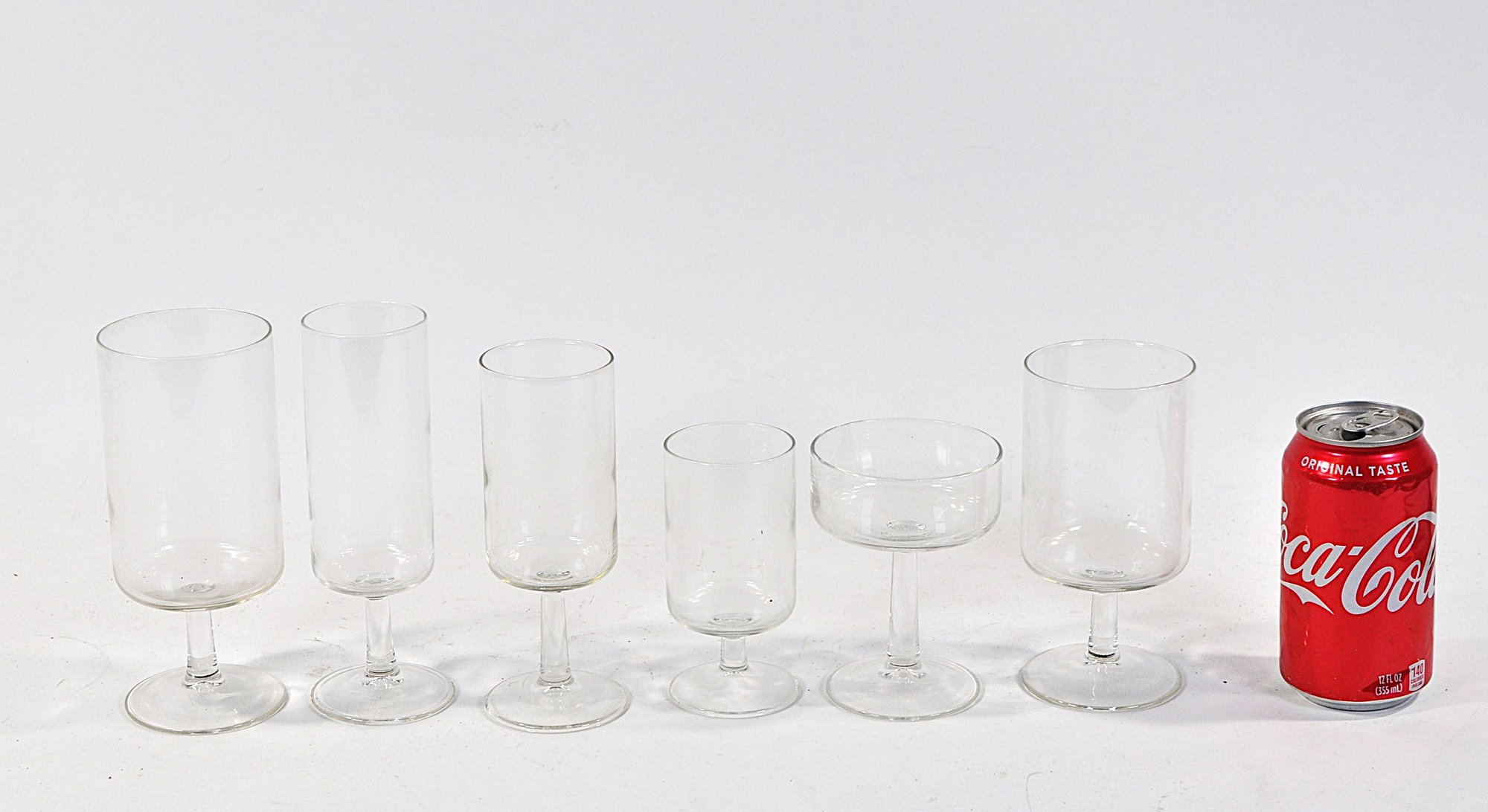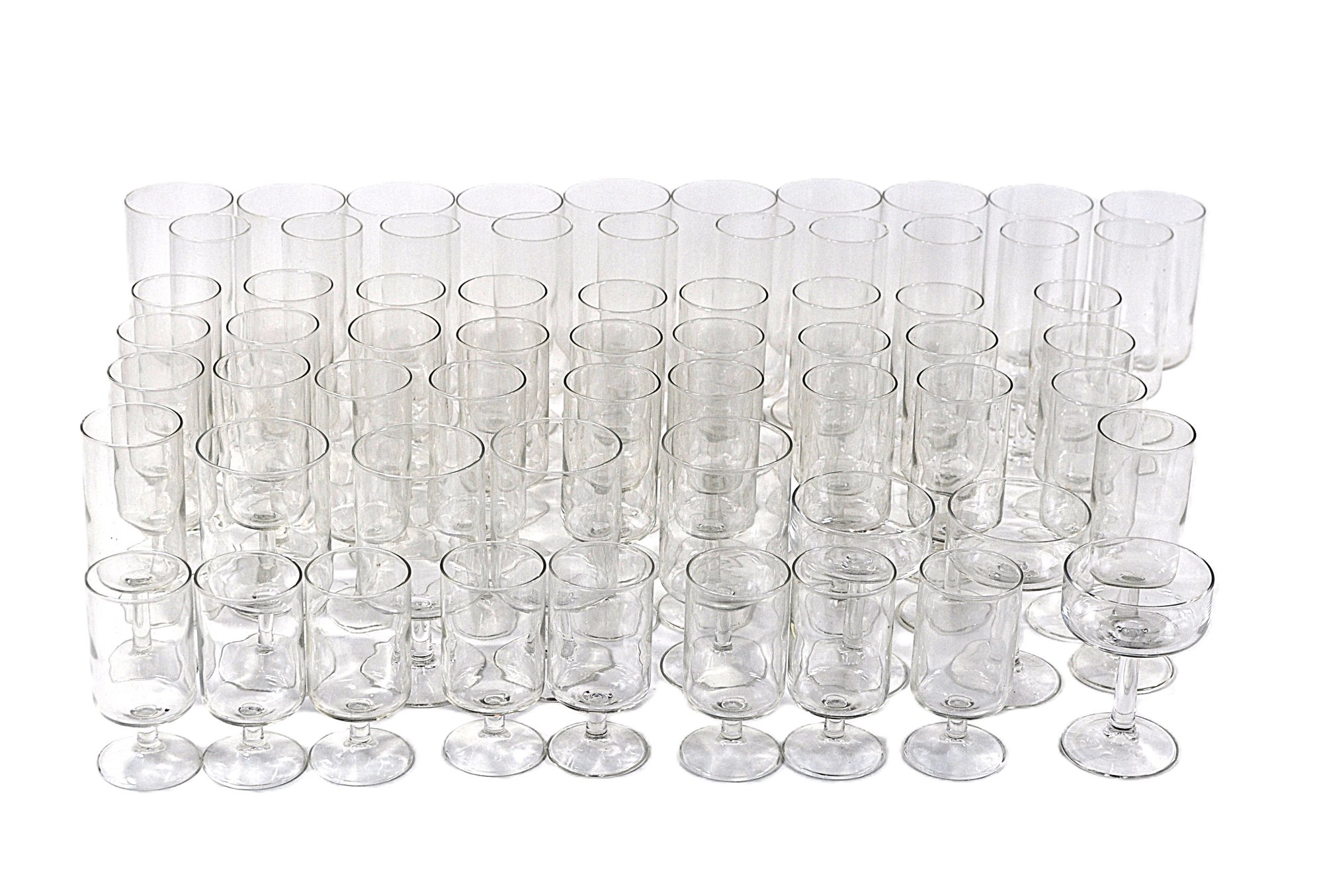 Large lot of 64 clear glass stemware pieces in assorted sizes and forms, including tall flutes, goblets, and coupes. Minimalist mid-century design with straight-sided bowls and simple stems, ideal for entertaining or display. Excellent overall condition.
