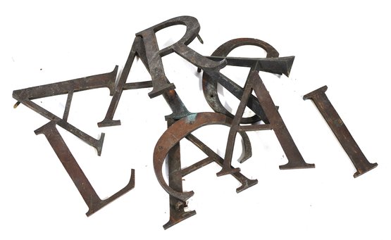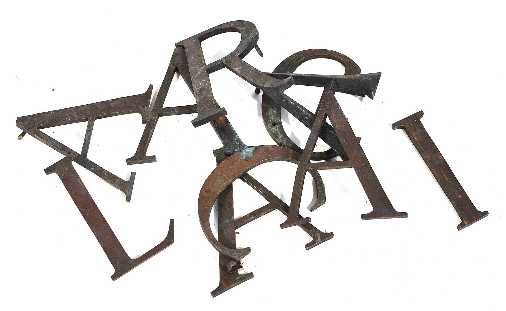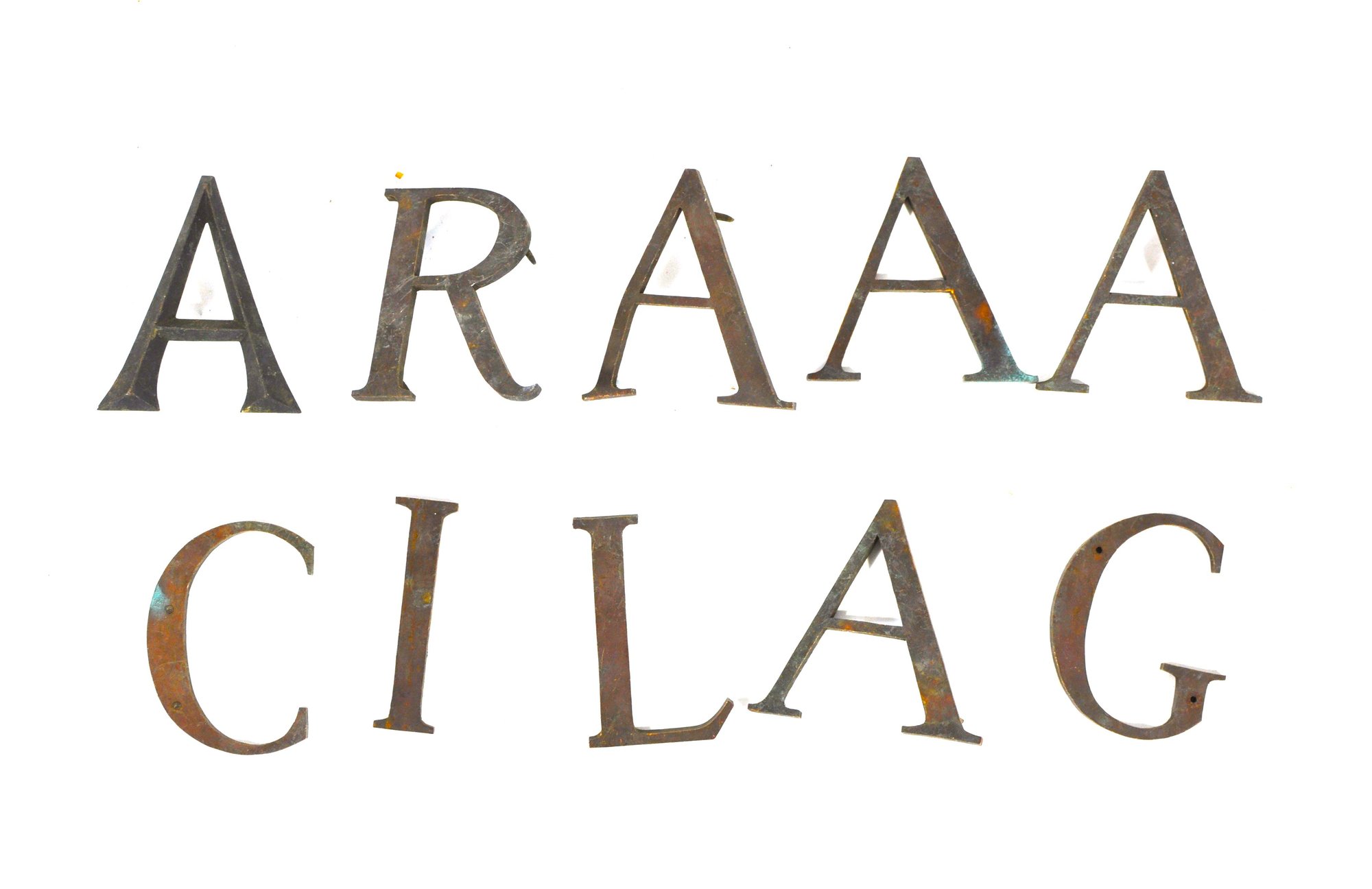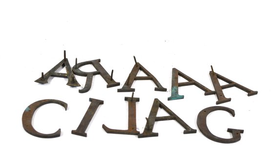 Group of antique 4-inch brass sign letters, salvaged from an old building or sign. Each letter features original mounting studs on the reverse and a naturally aged patina from years of use. Classic serif style suitable for restoration, signage projects, or decorative display.