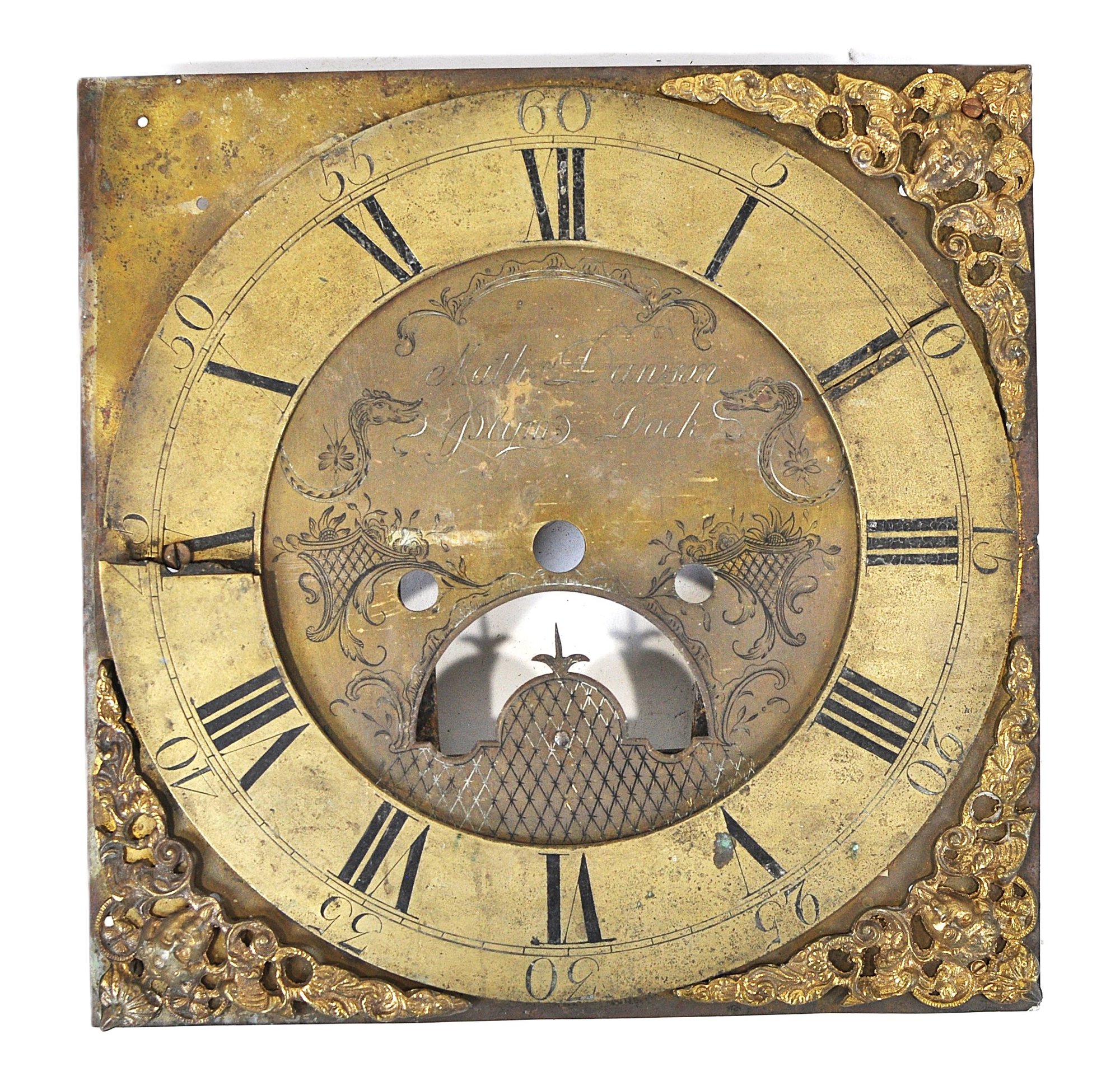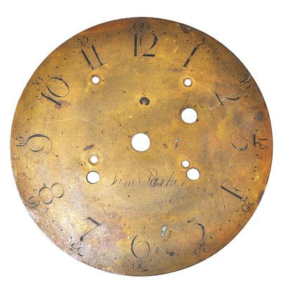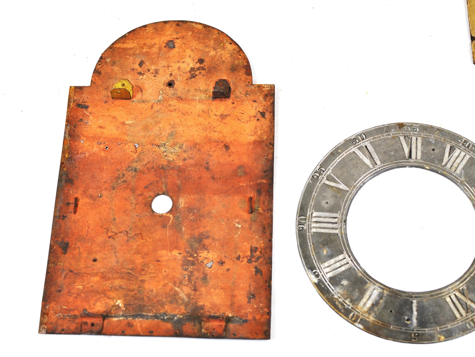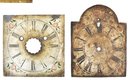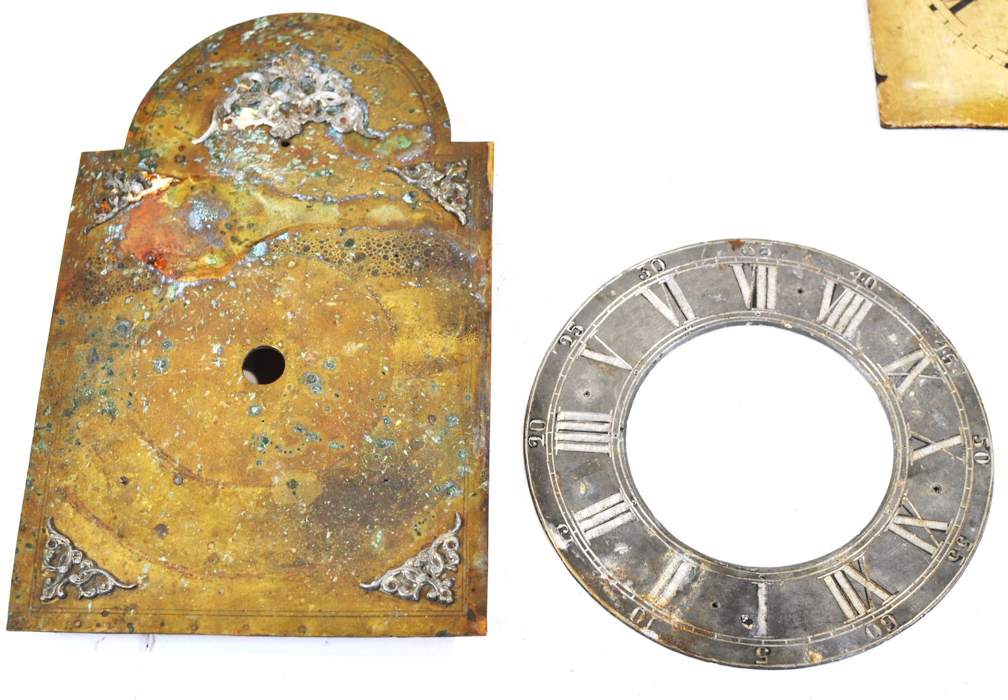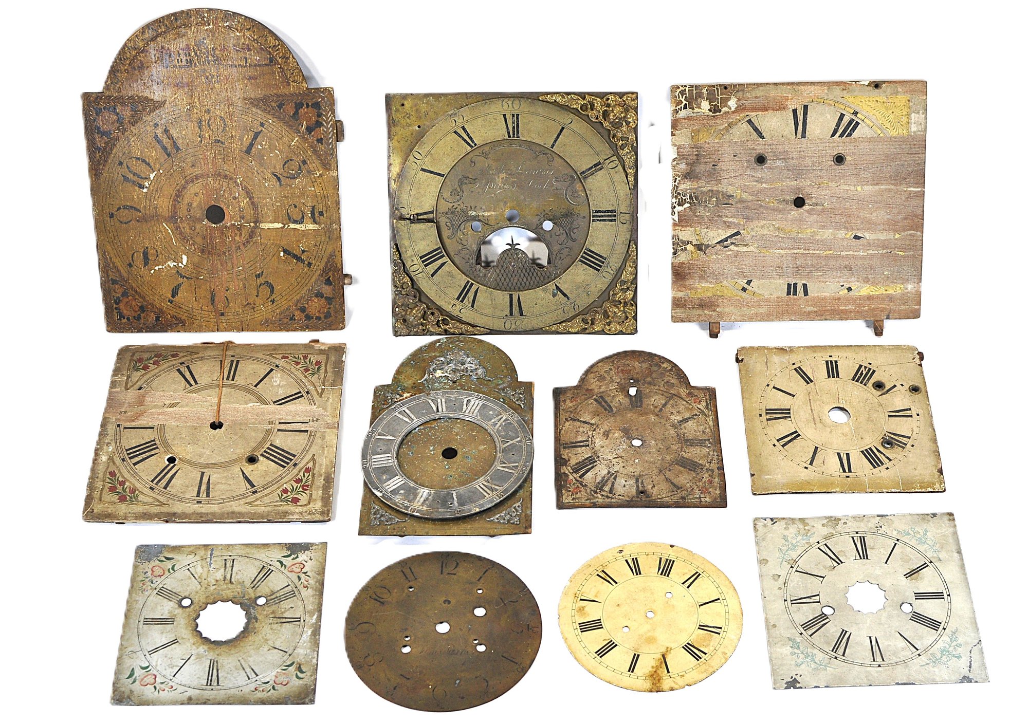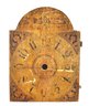 Mixed group of antique clock dials and parts including painted iron and brass examples, longcase/grandfather clock faces, and decorative spandrel mounts. Includes signed dials such as Sam Parker and Math. Daneson, Plymouth Dock, plus various Roman numeral faces and associated components.