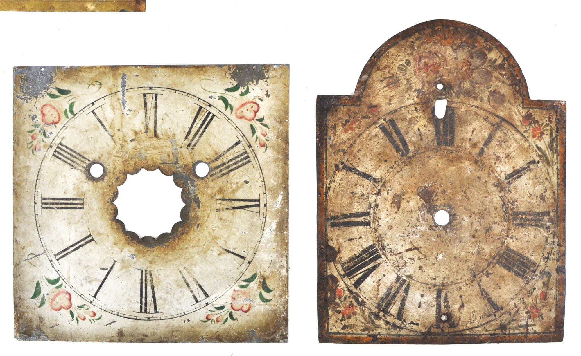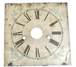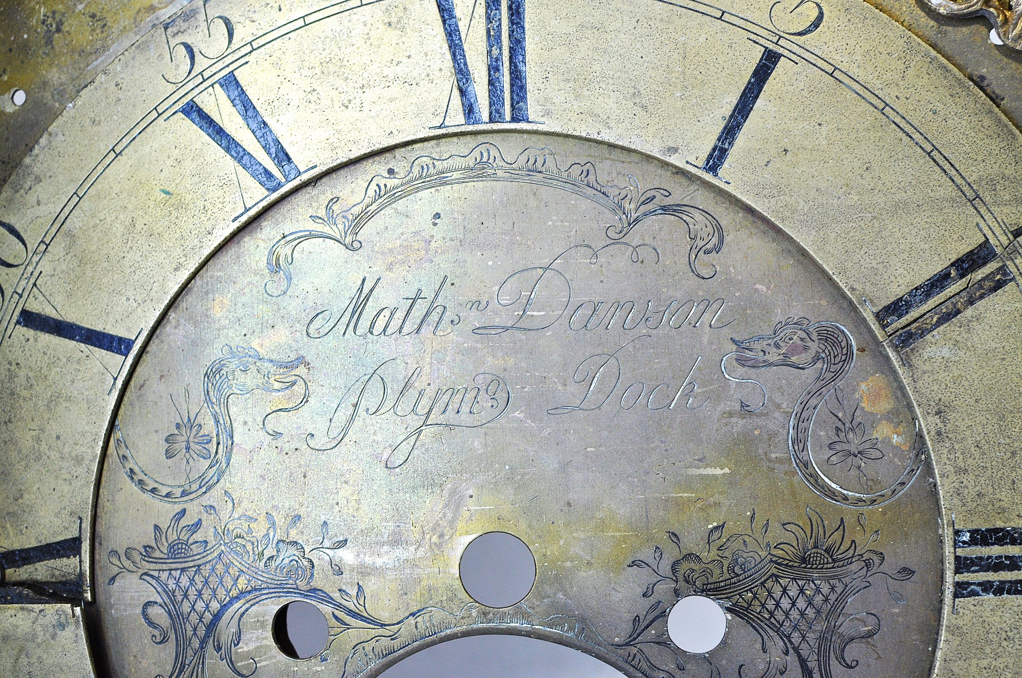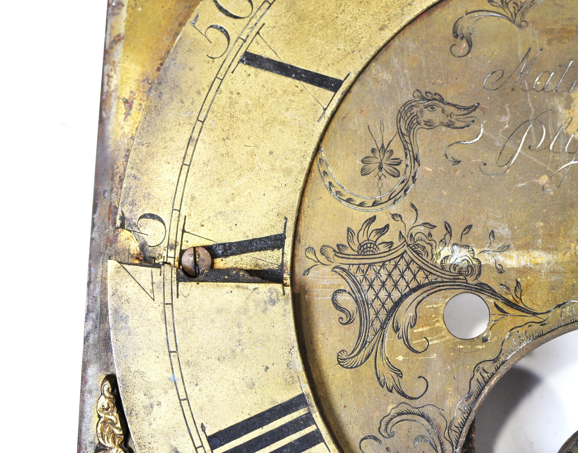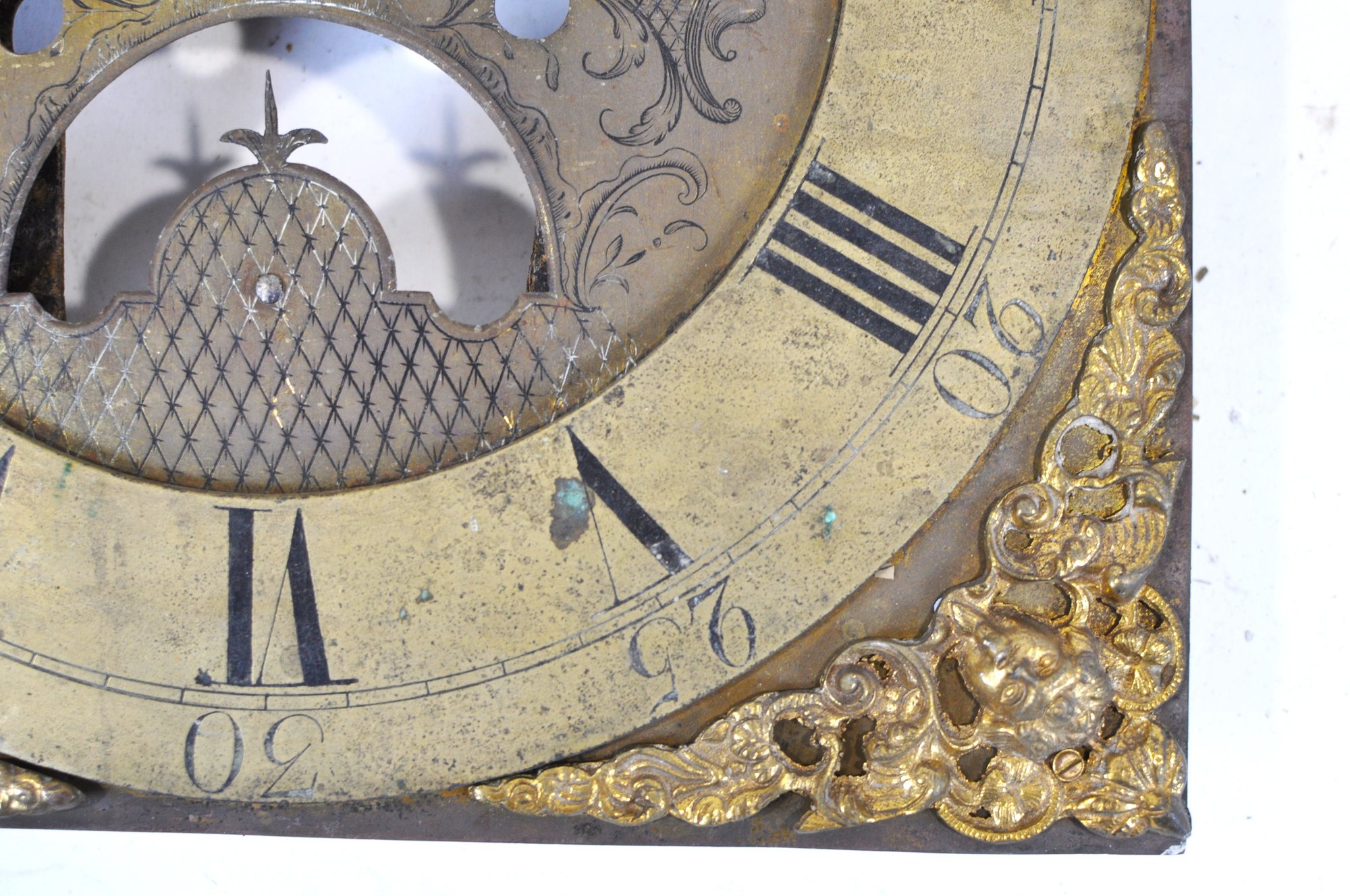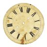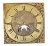 Mixed group of antique clock dials and parts including painted iron and brass examples, longcase/grandfather clock faces, and decorative spandrel mounts. Includes signed dials such as Sam Parker and Math. Daneson, Plymouth Dock, plus various Roman numeral faces and associated components.