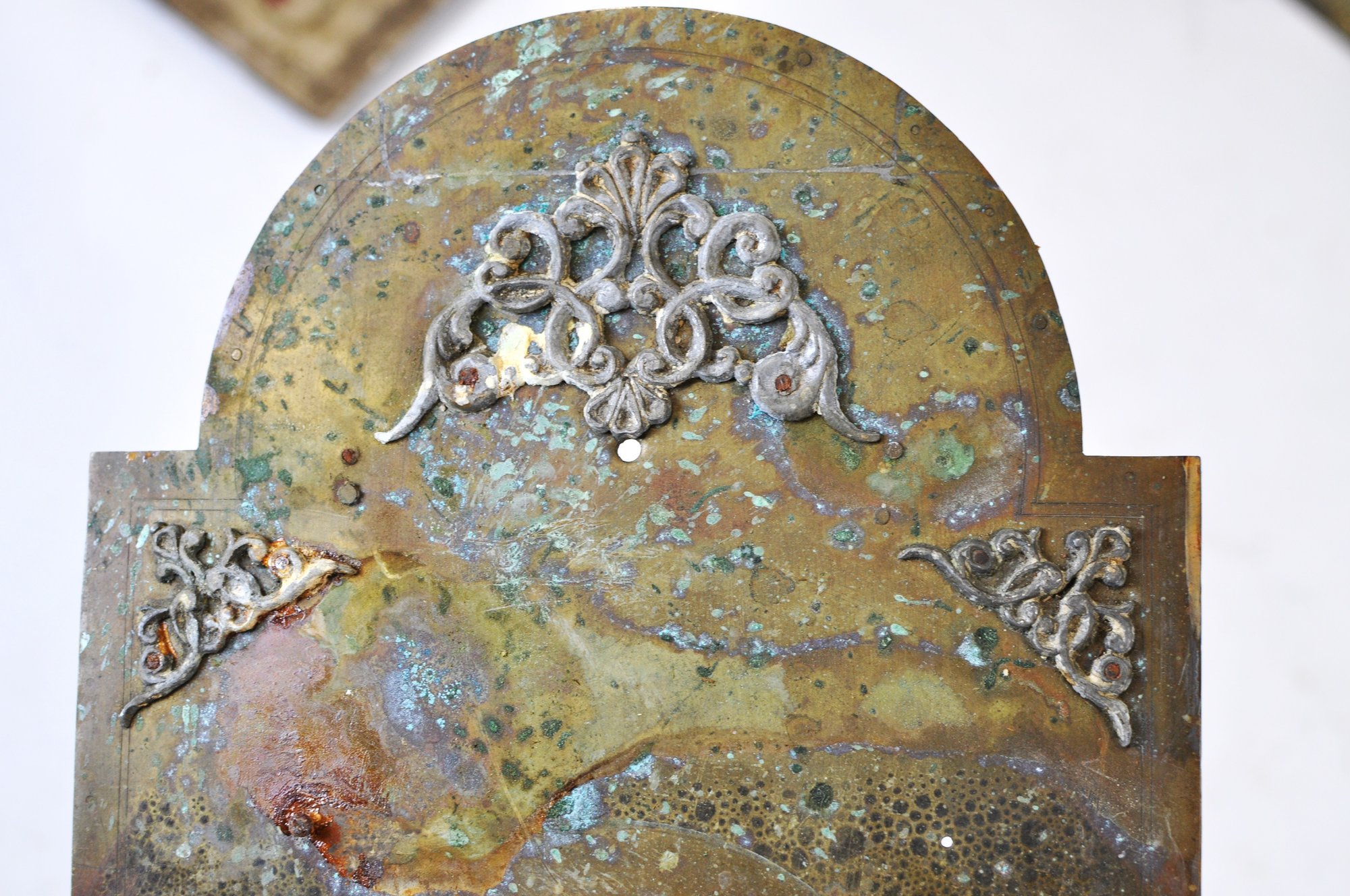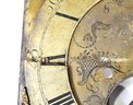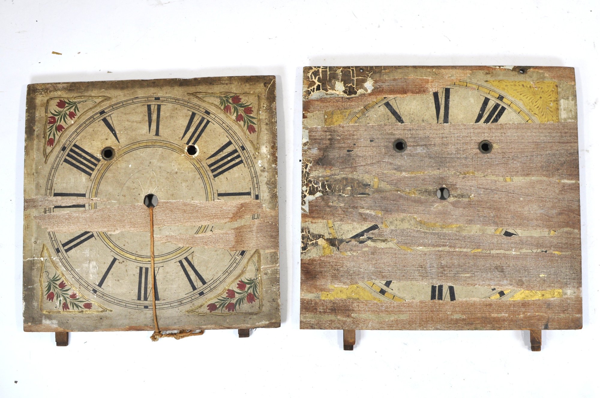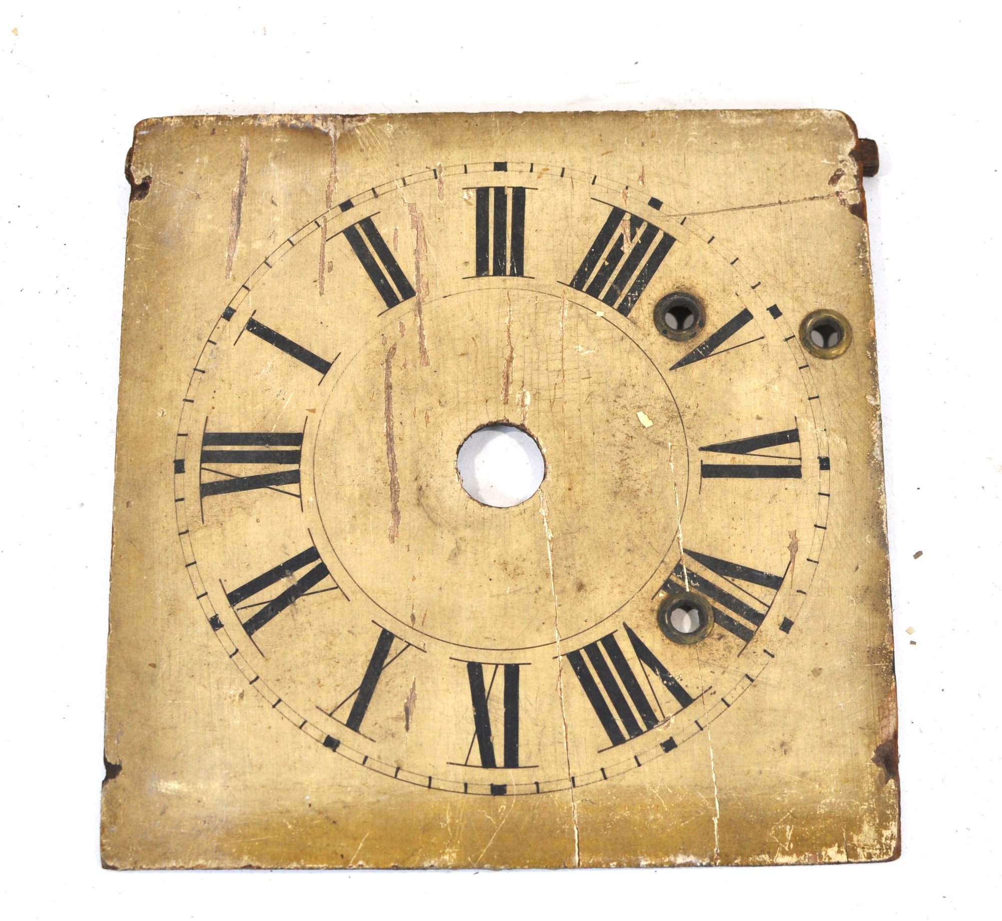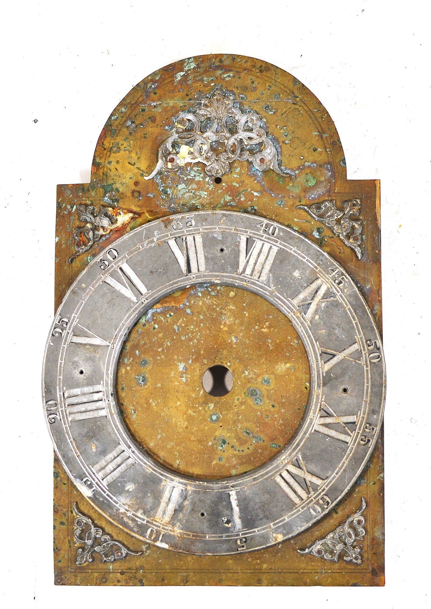 Mixed group of antique clock dials and parts including painted iron and brass examples, longcase/grandfather clock faces, and decorative spandrel mounts. Includes signed dials such as Sam Parker and Math. Daneson, Plymouth Dock, plus various Roman numeral faces and associated components.