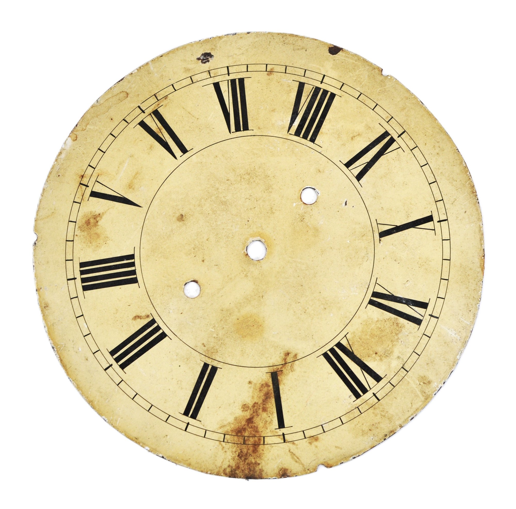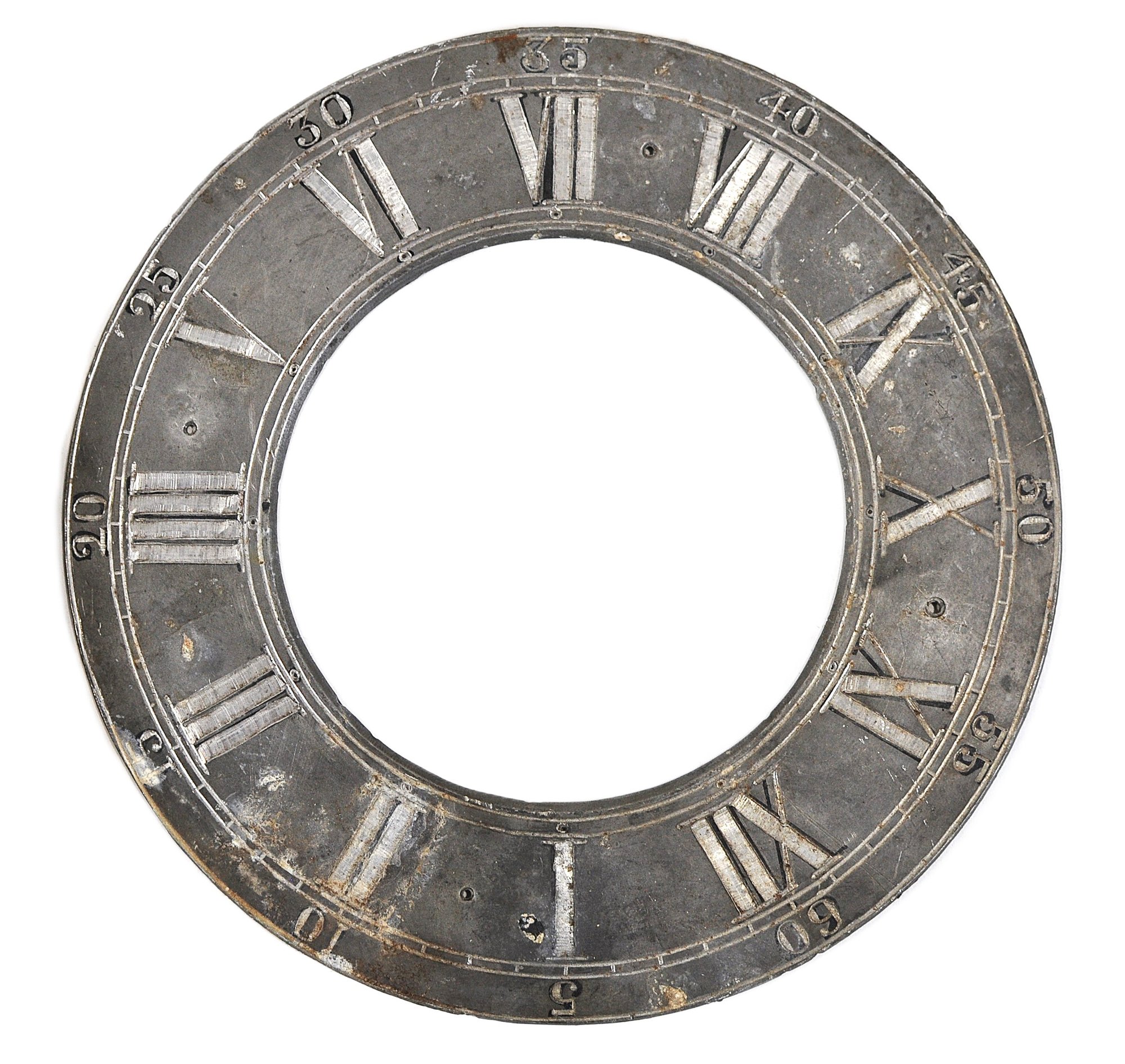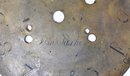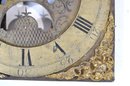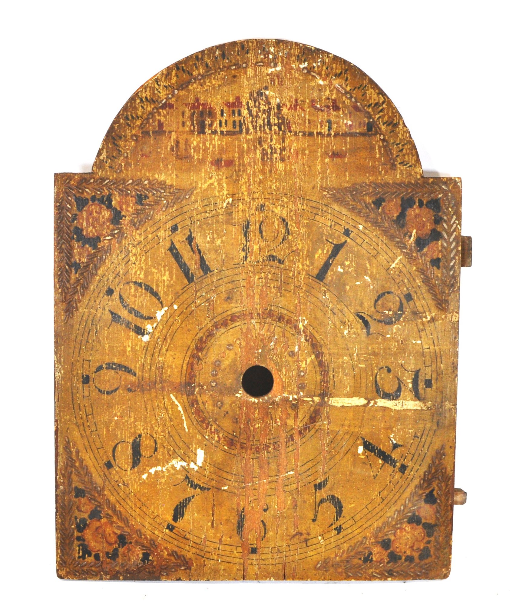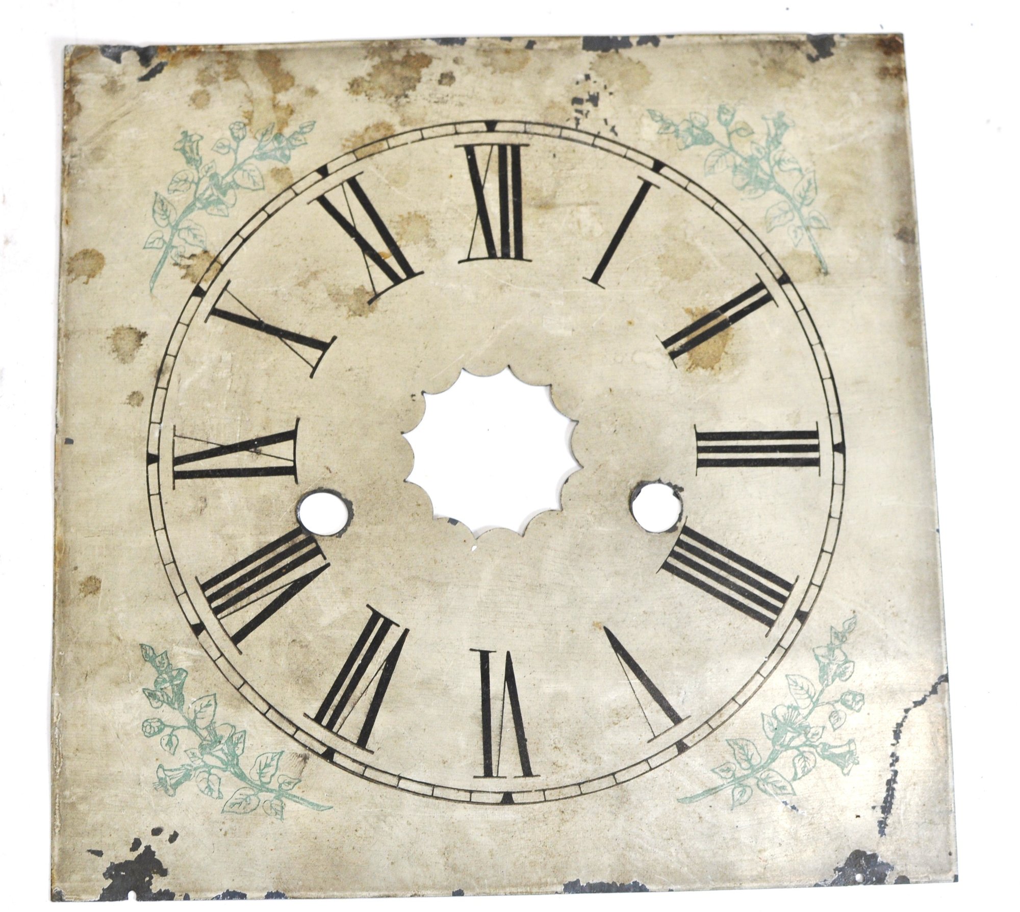 Mixed group of antique clock dials and parts including painted iron and brass examples, longcase/grandfather clock faces, and decorative spandrel mounts. Includes signed dials such as Sam Parker and Math. Daneson, Plymouth Dock, plus various Roman numeral faces and associated components.
