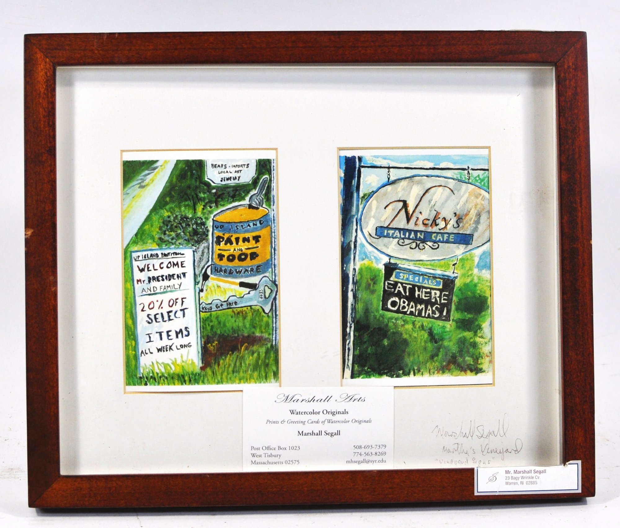 Framed original watercolor artwork by Marshall Segall depicting two humorous Martha’s Vineyard shop signs. Signed lower right and titled “Vineyard Signs.” Nicely presented in a wooden frame with double window mat and artist’s business card included.