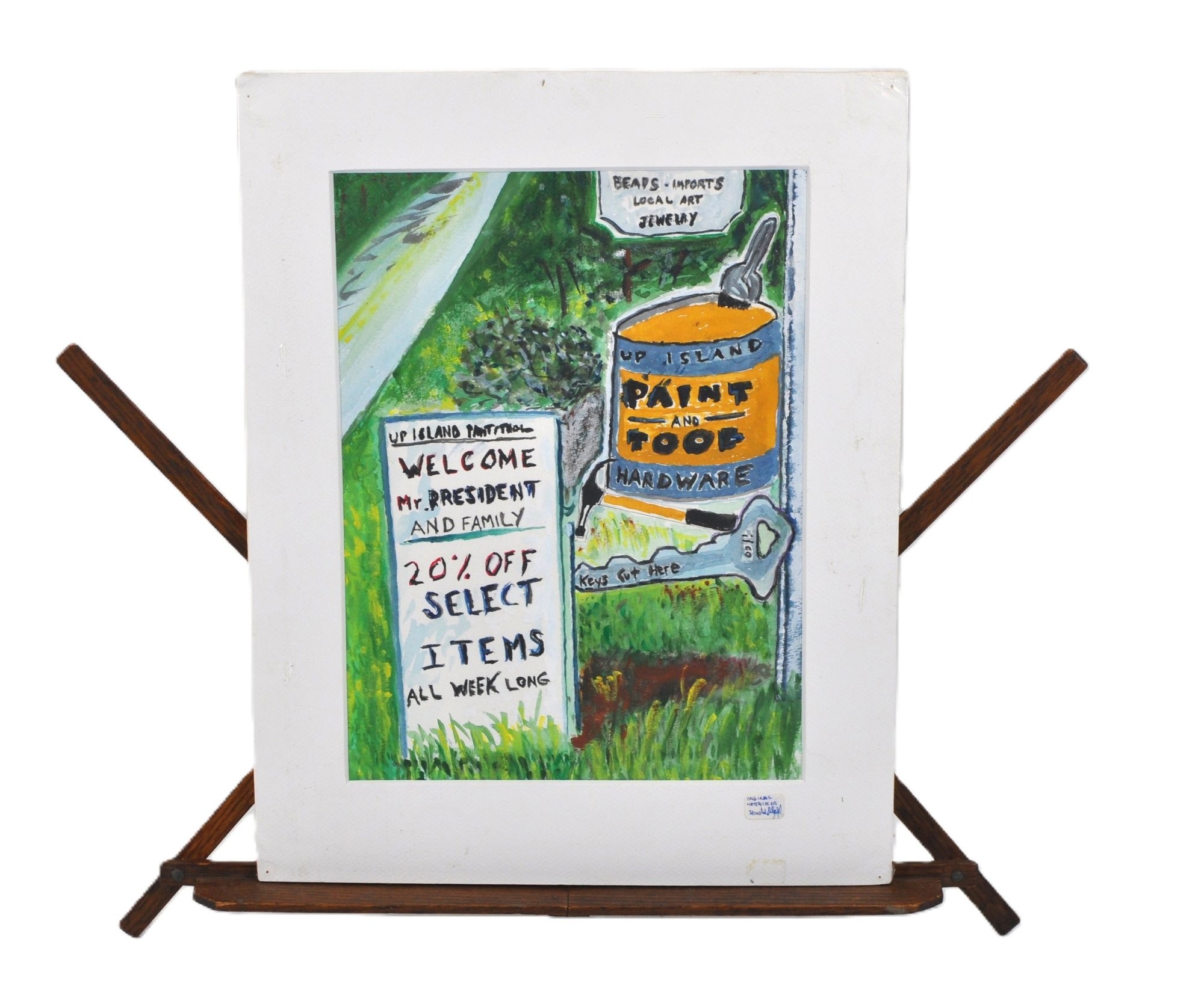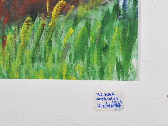 Framed original watercolor artwork by Marshall Segall depicting two humorous Martha’s Vineyard shop signs. Signed lower right and titled “Vineyard Signs.” Nicely presented in a wooden frame with double window mat and artist’s business card included.