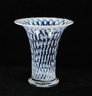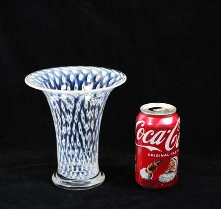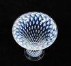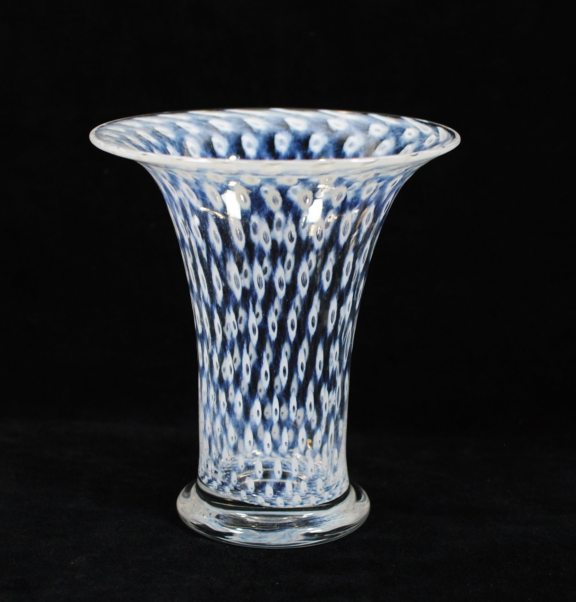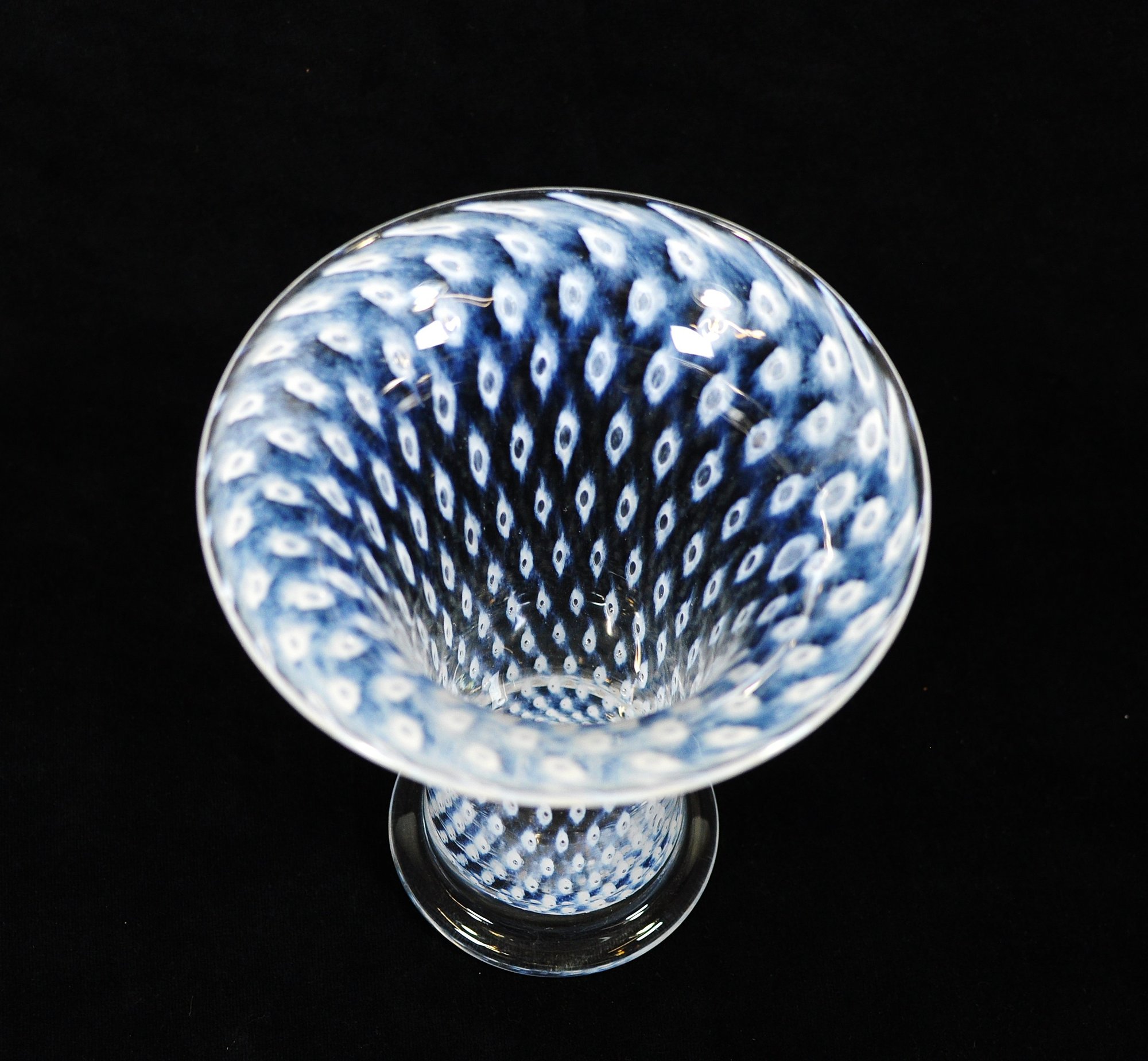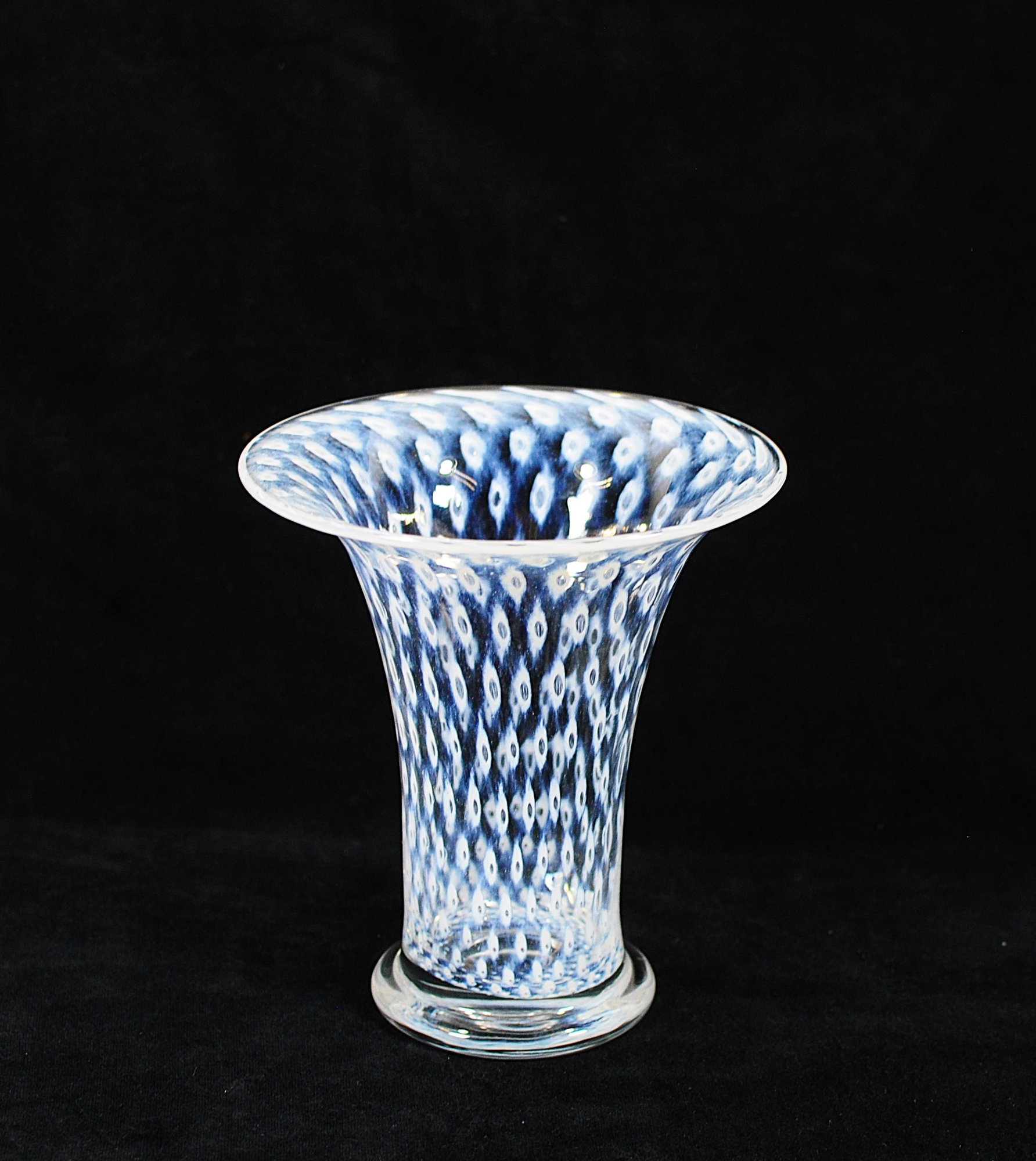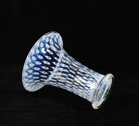 Vintage Swedish art glass vase from the “Cirrus” series, designed by Bertil Vallien for Boda Glassworks. The vase features a graceful trumpet form with a flared rim and clear glass base. The body is decorated with the characteristic blue and white “Cirrus” pattern, composed of repeating oval and eye-like motifs suspended within clear glass, creating a striking optical depth.