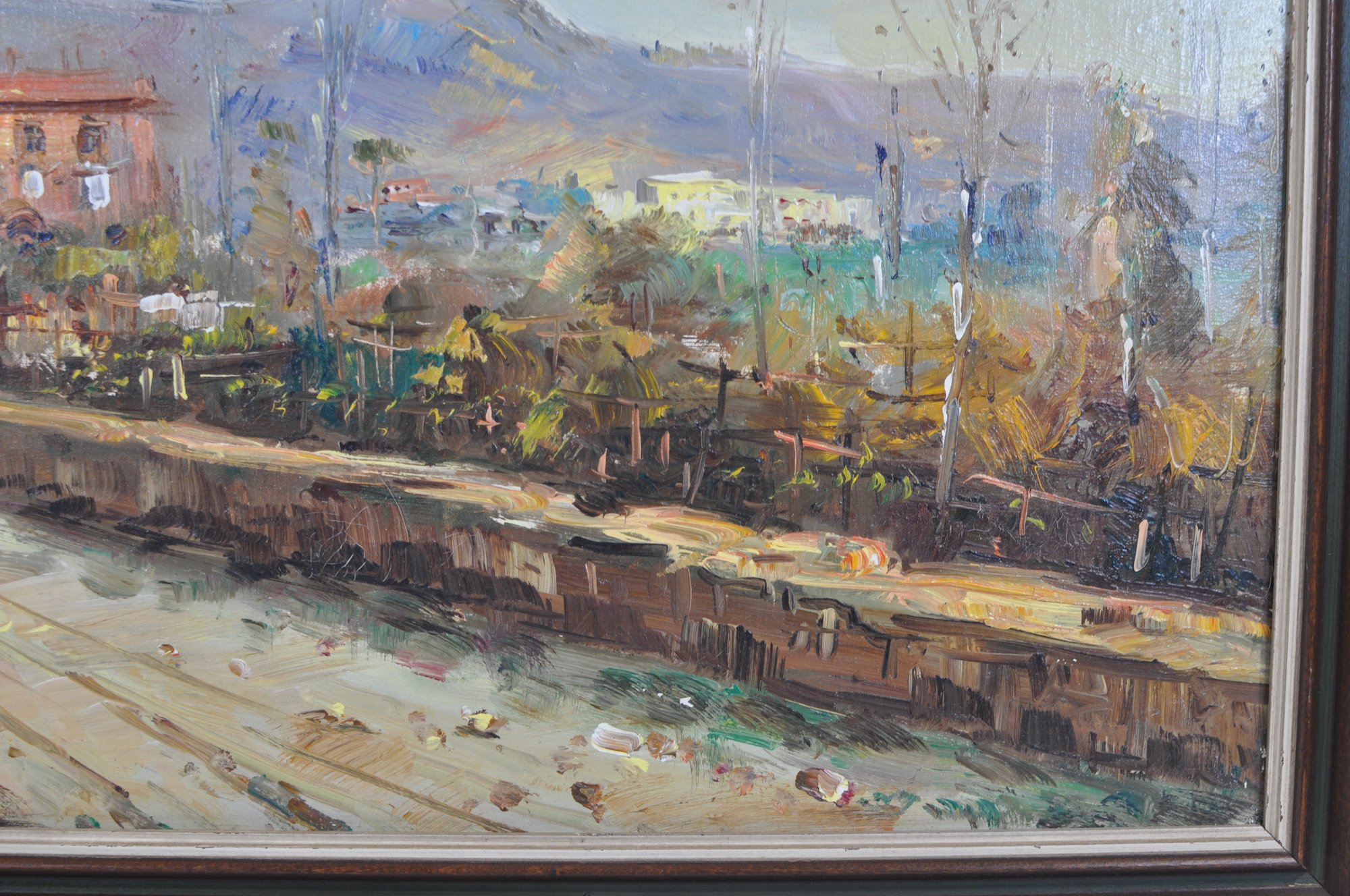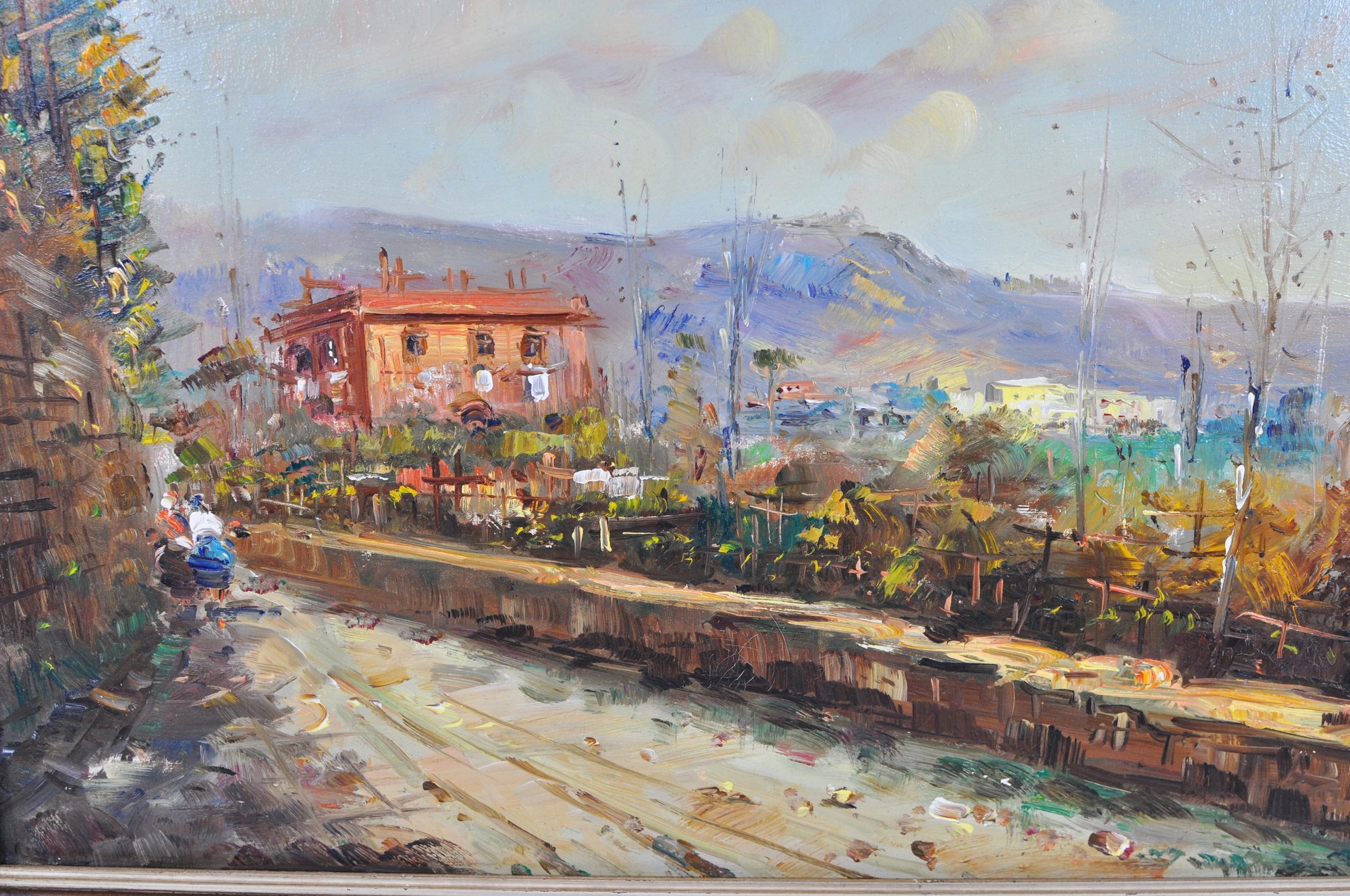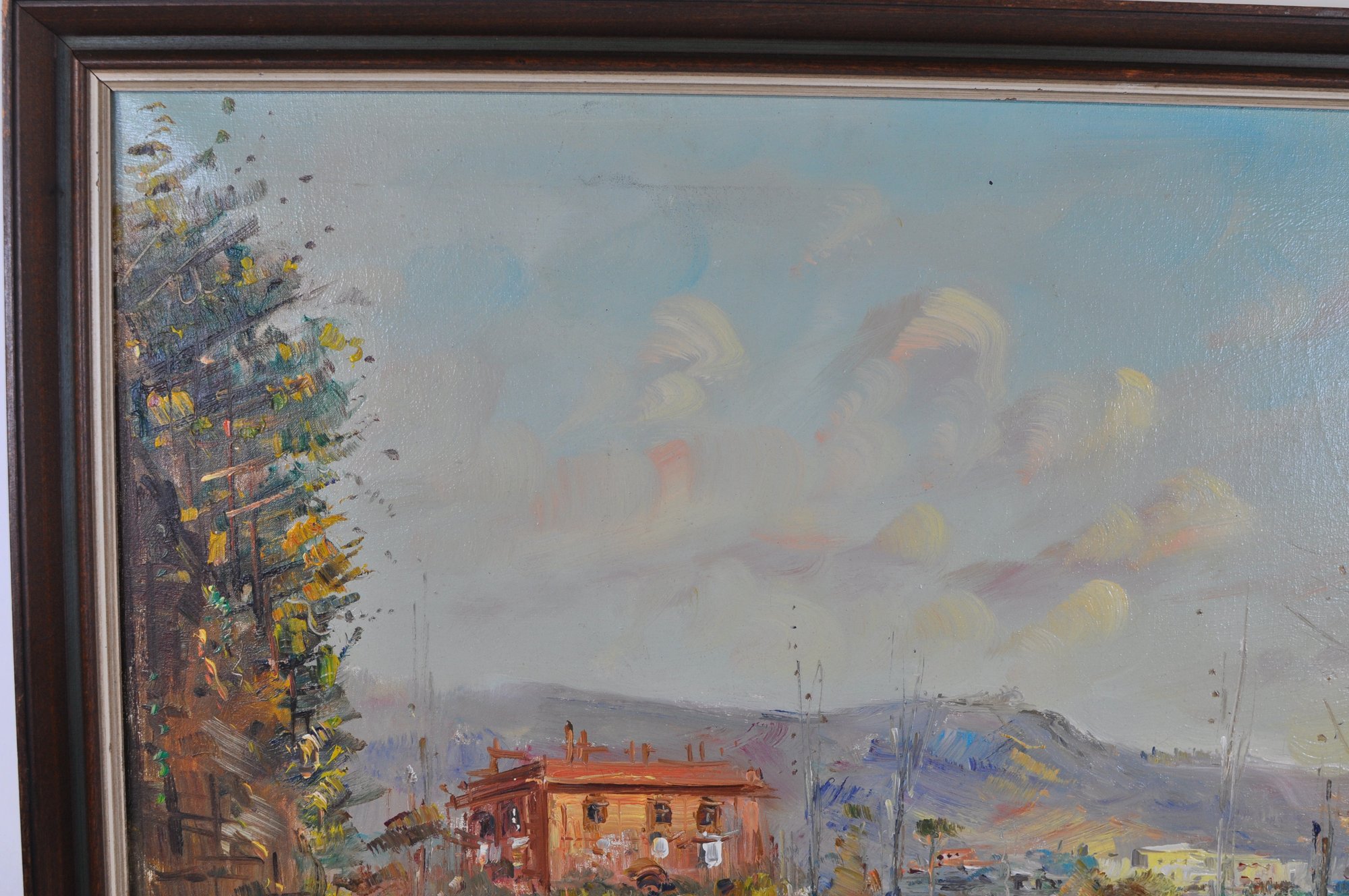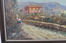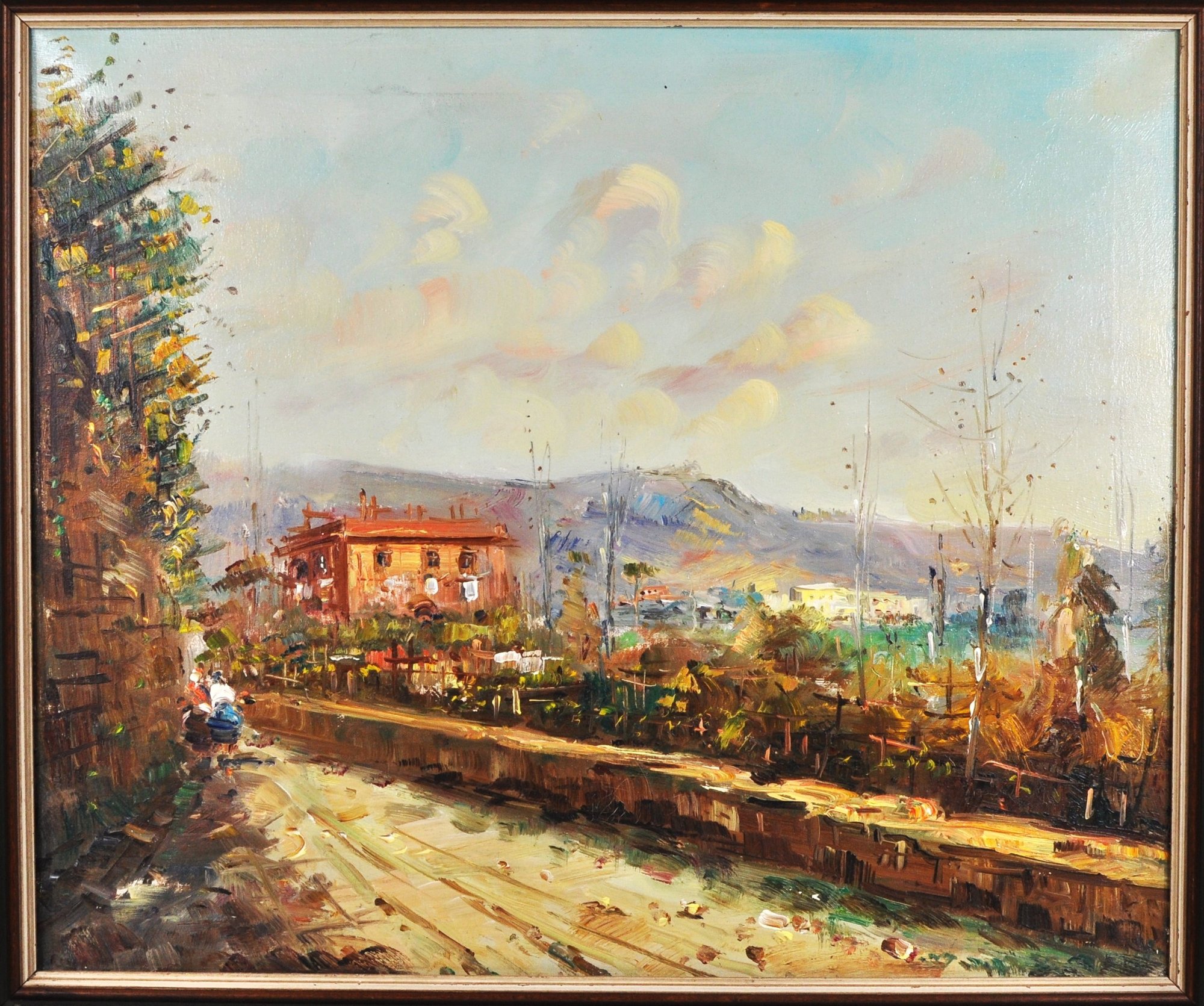 Vibrant mid-century Impressionist oil painting depicting a sunlit rural Italian scene with figures walking along a path toward a cluster of warm-toned buildings set against distant hills. Painted with bold, expressive brushstrokes and a bright, atmospheric palette, the work captures a sense of movement and late-afternoon light. Presented in a period wooden frame.