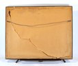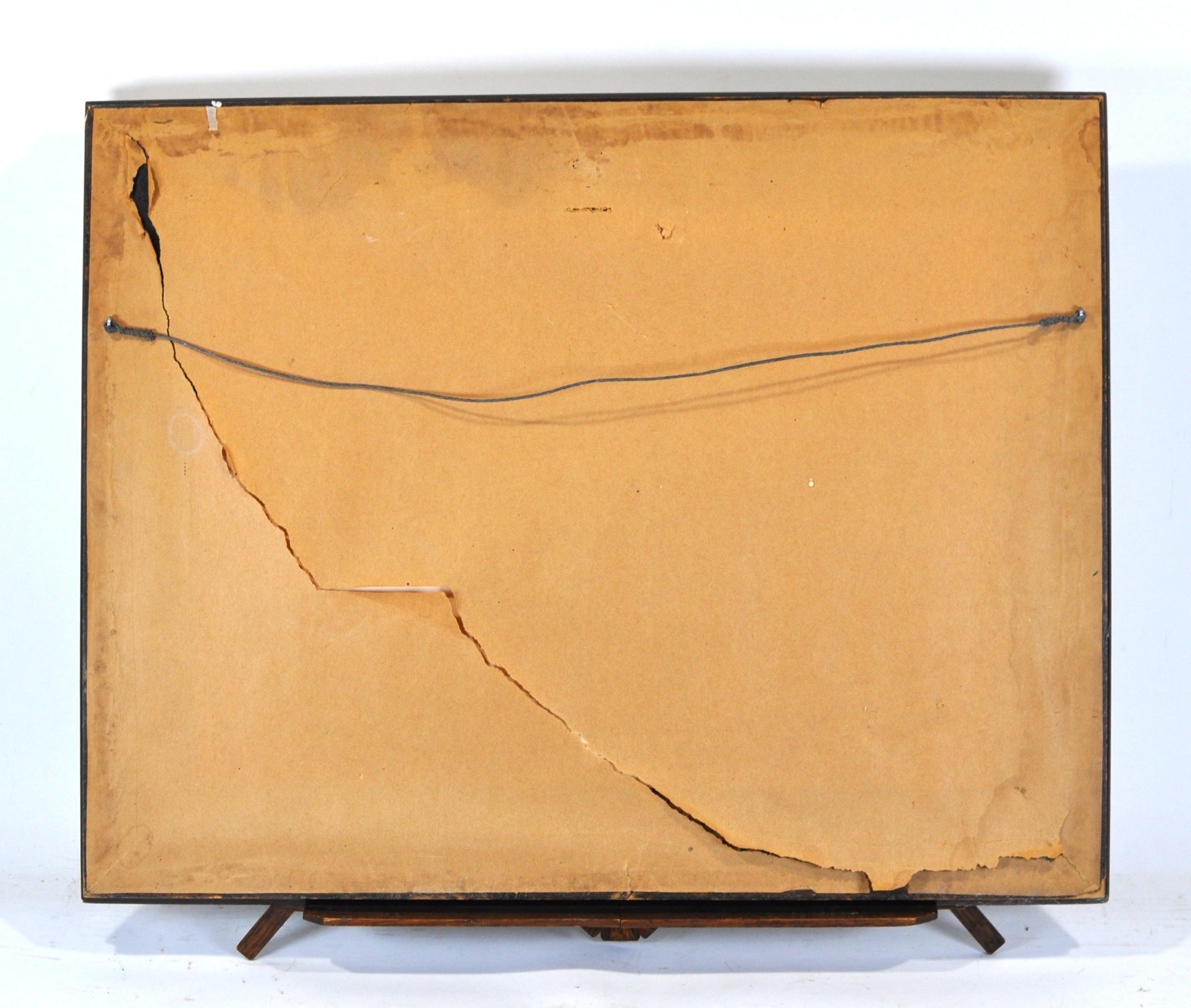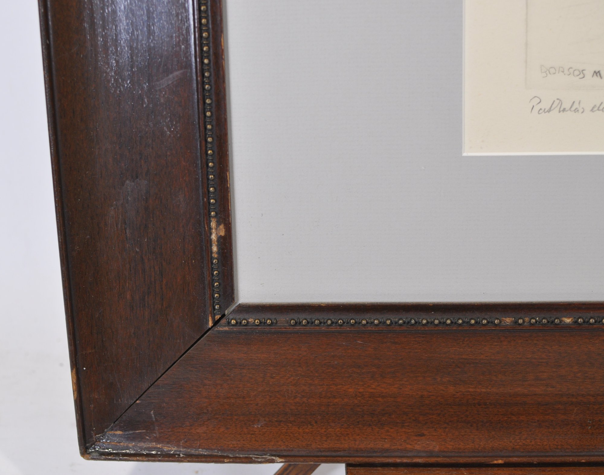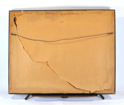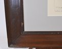 Presented matted and framed in a dark wood frame with beaded liner. Frame shows surface wear and corner losses. Backing has cracks and damage, consistent with age and use. The print itself shows light toning and handling marks.
